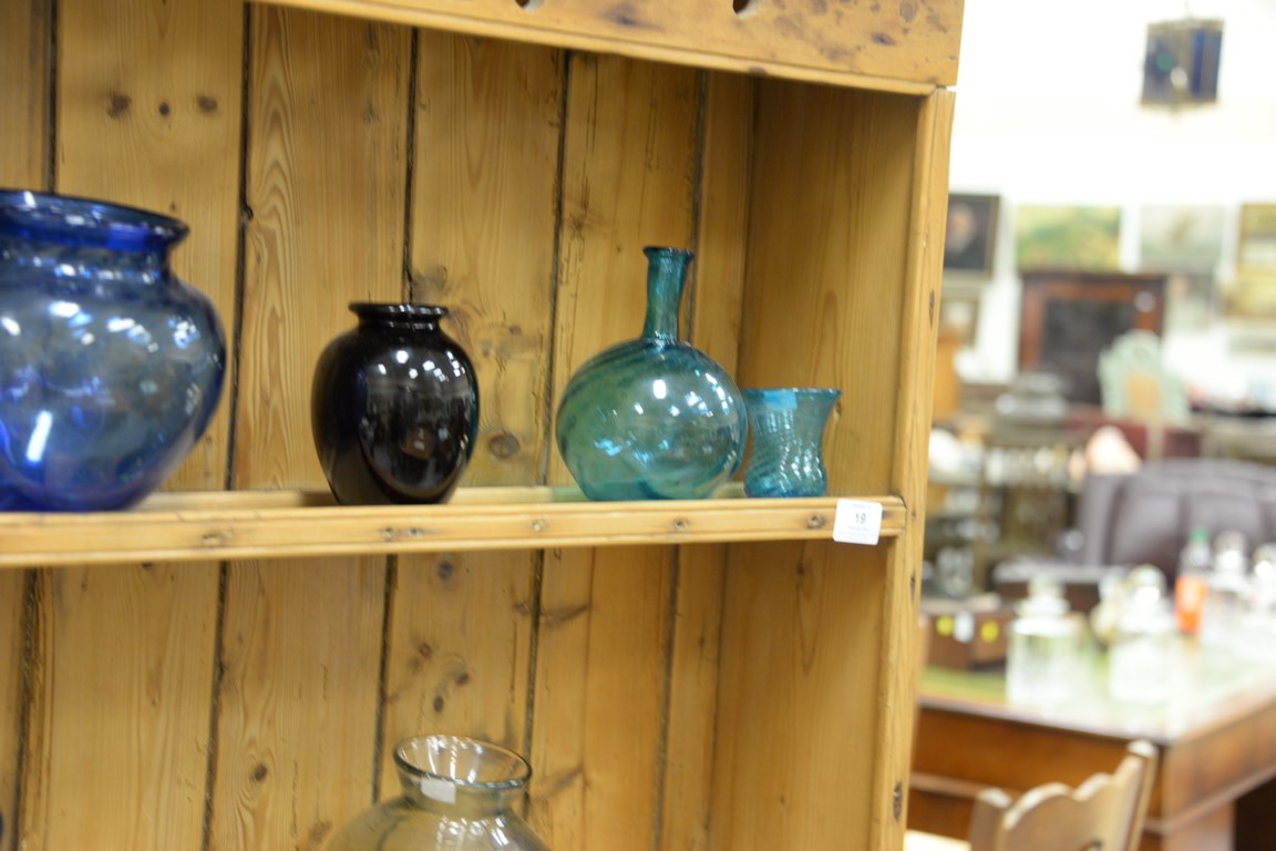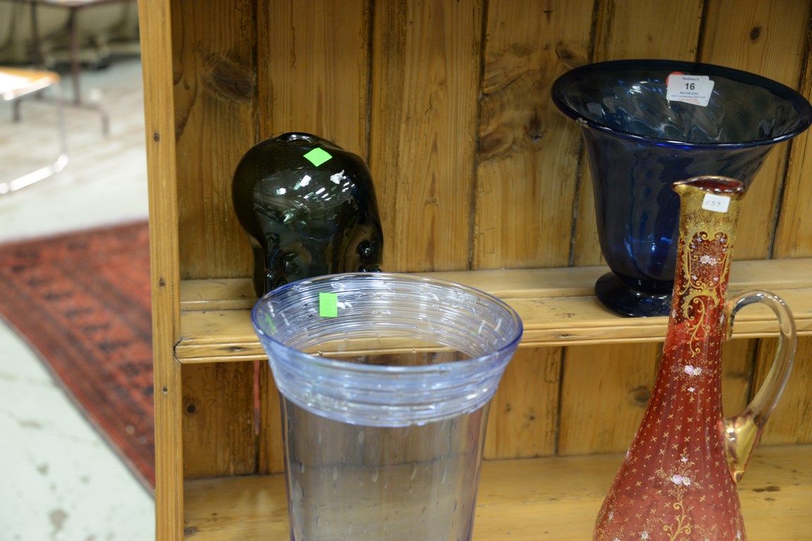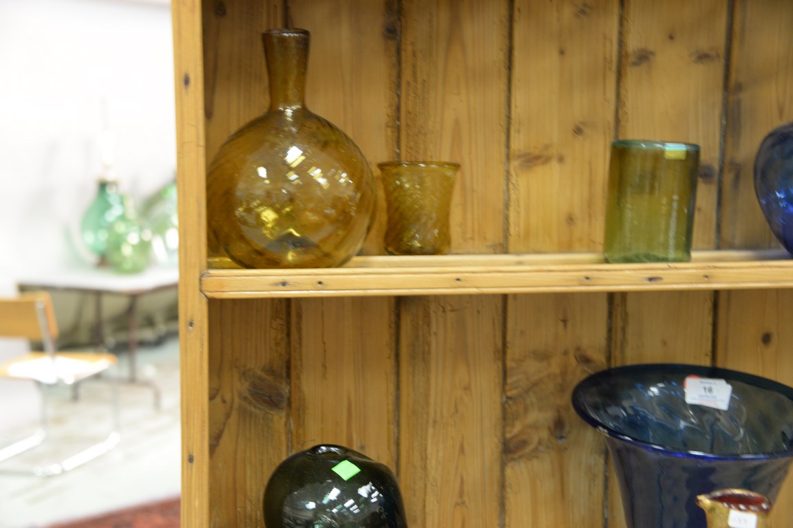 Lot 16: Thirteen piece lot to include two swirled bottles, two goblets, six blown glass vases, Moser pitcher, hand blown Peter Bramhall pinc…