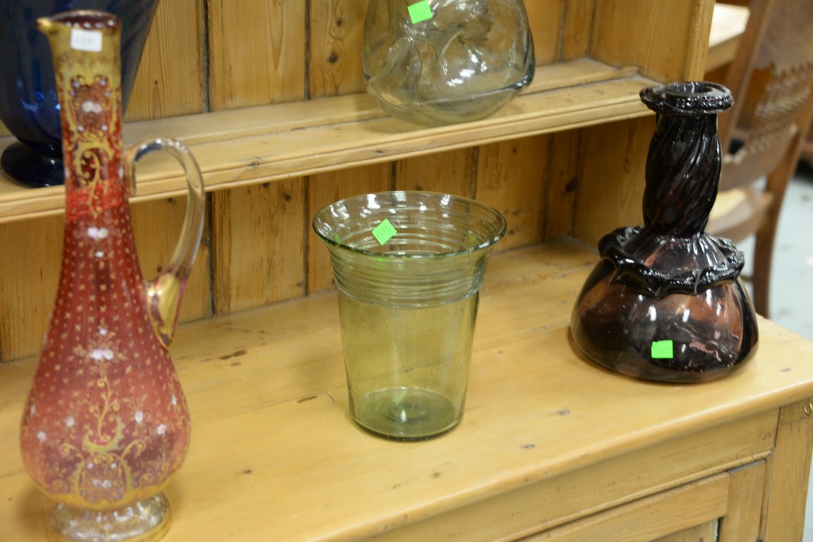 Thirteen piece lot to include two swirled bottles, two goblets, six blown glass vases, Moser pitcher, hand blown Peter Bramhall pinch vase, green hand blown pinch blown vase, and a large hand blown amethyst art glass bottle vase with applied collar and twisted neck, ht. 3 in. to 16 1/2 in.