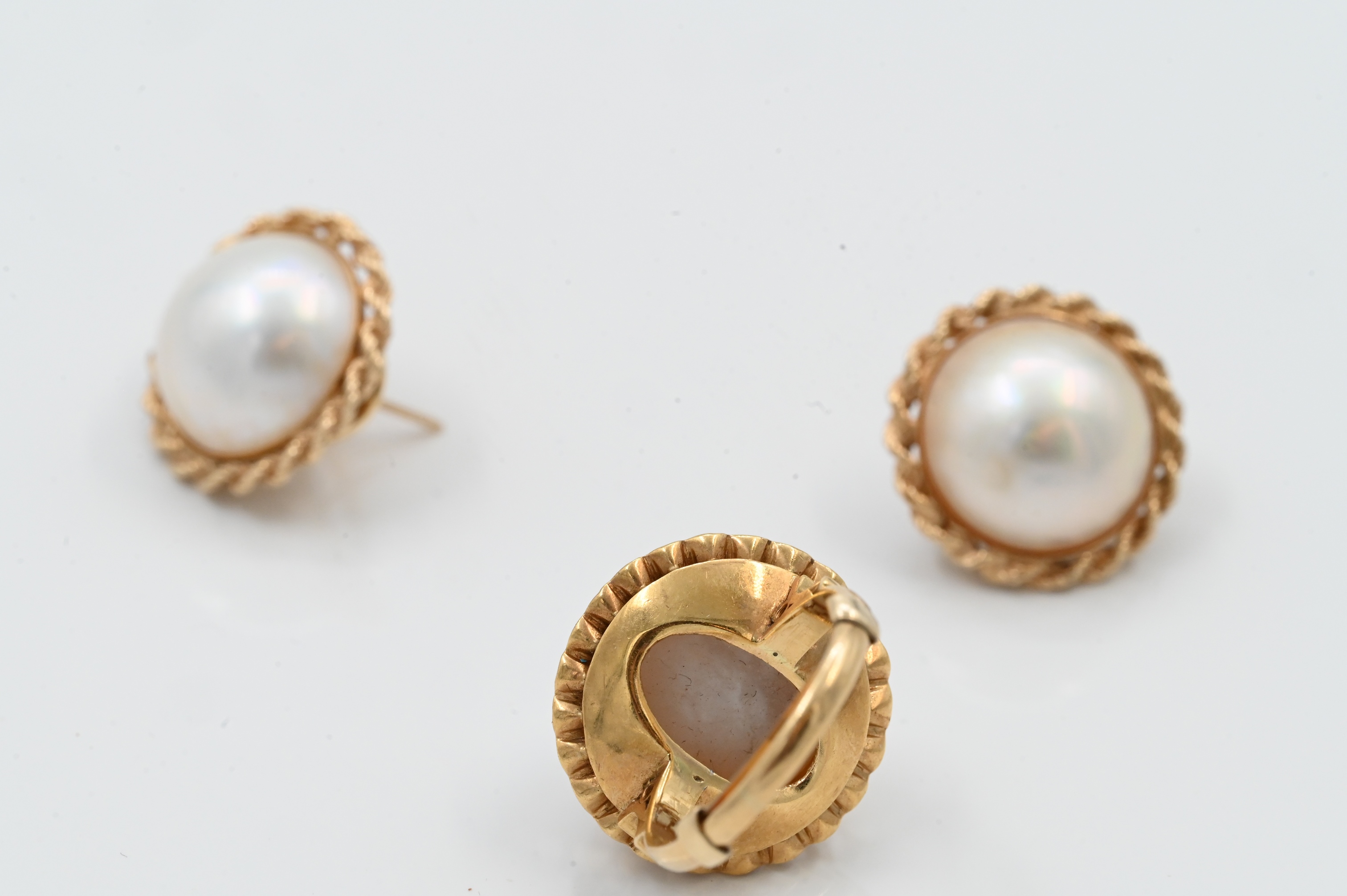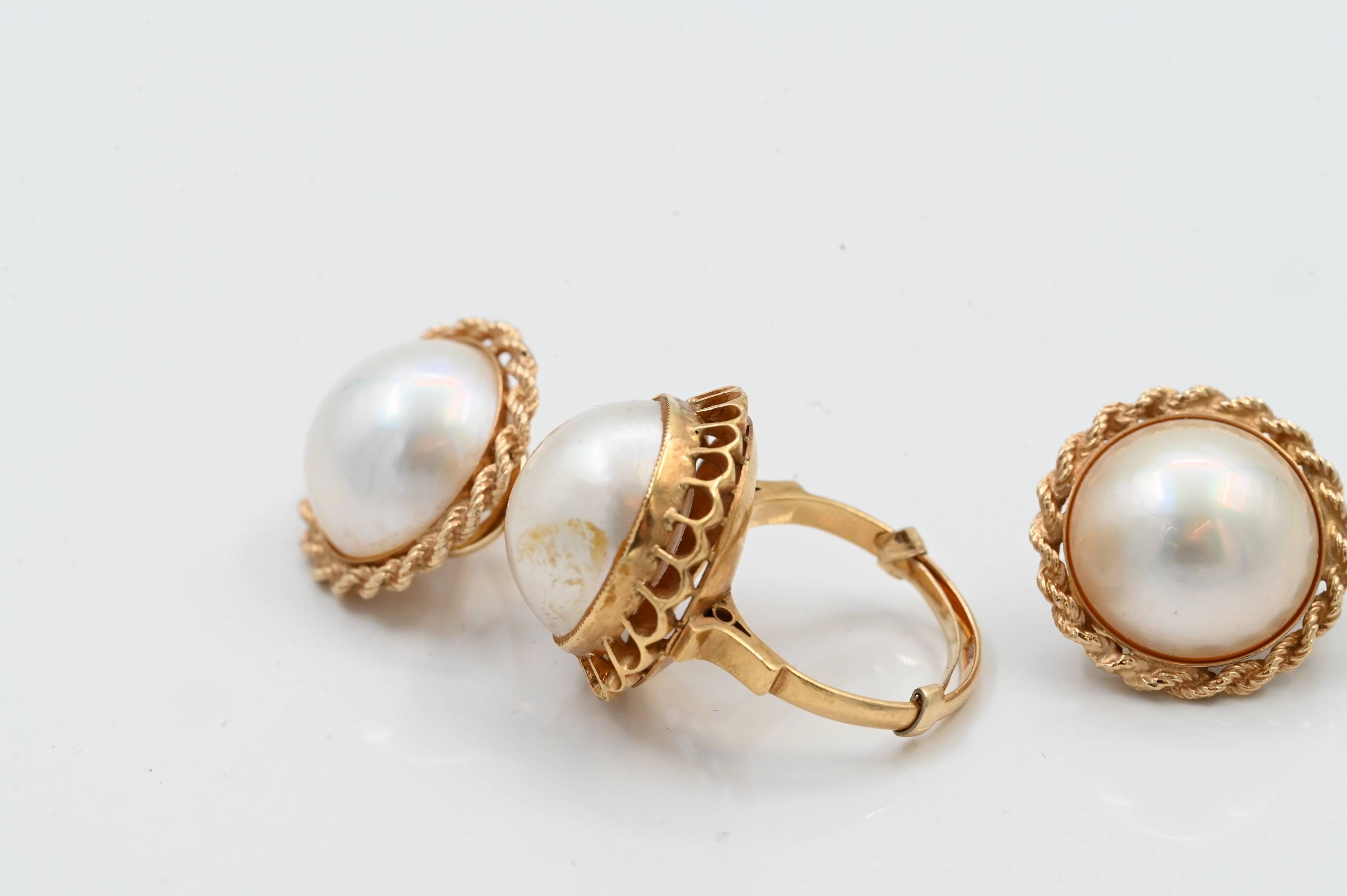 to include 18K gold ring with mabe pearl and similar mabe pearl 14K gold earrings
