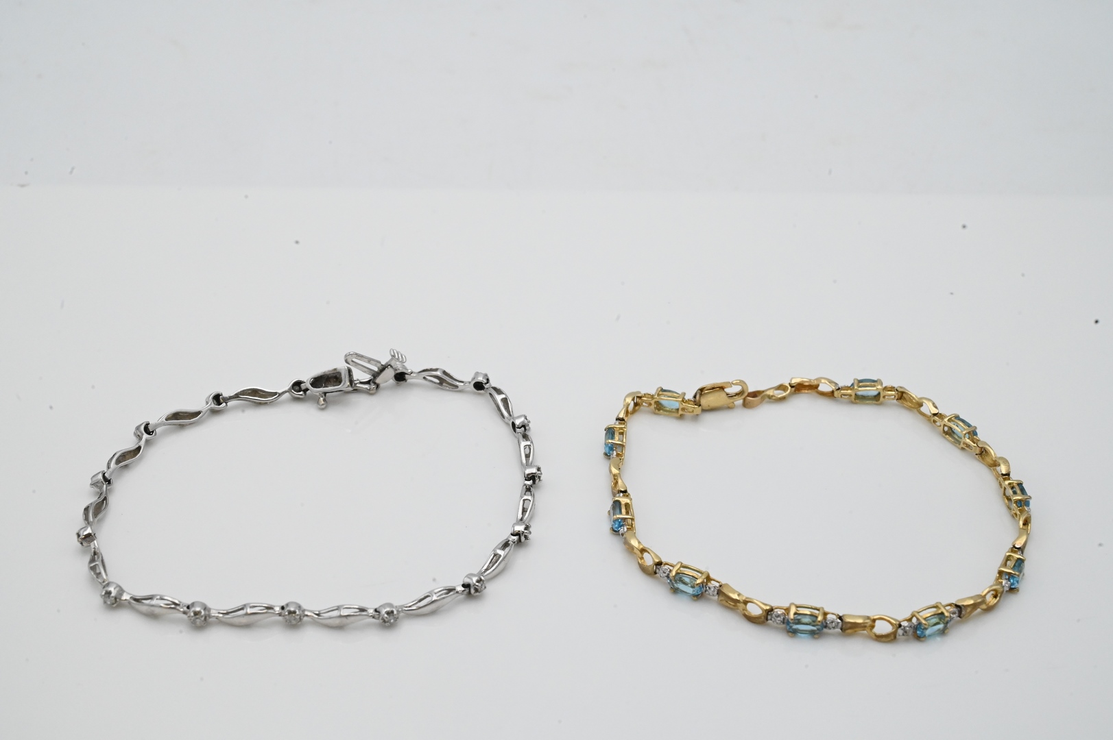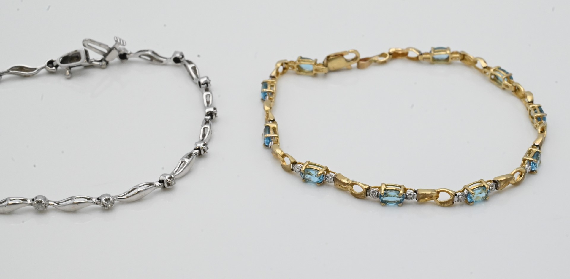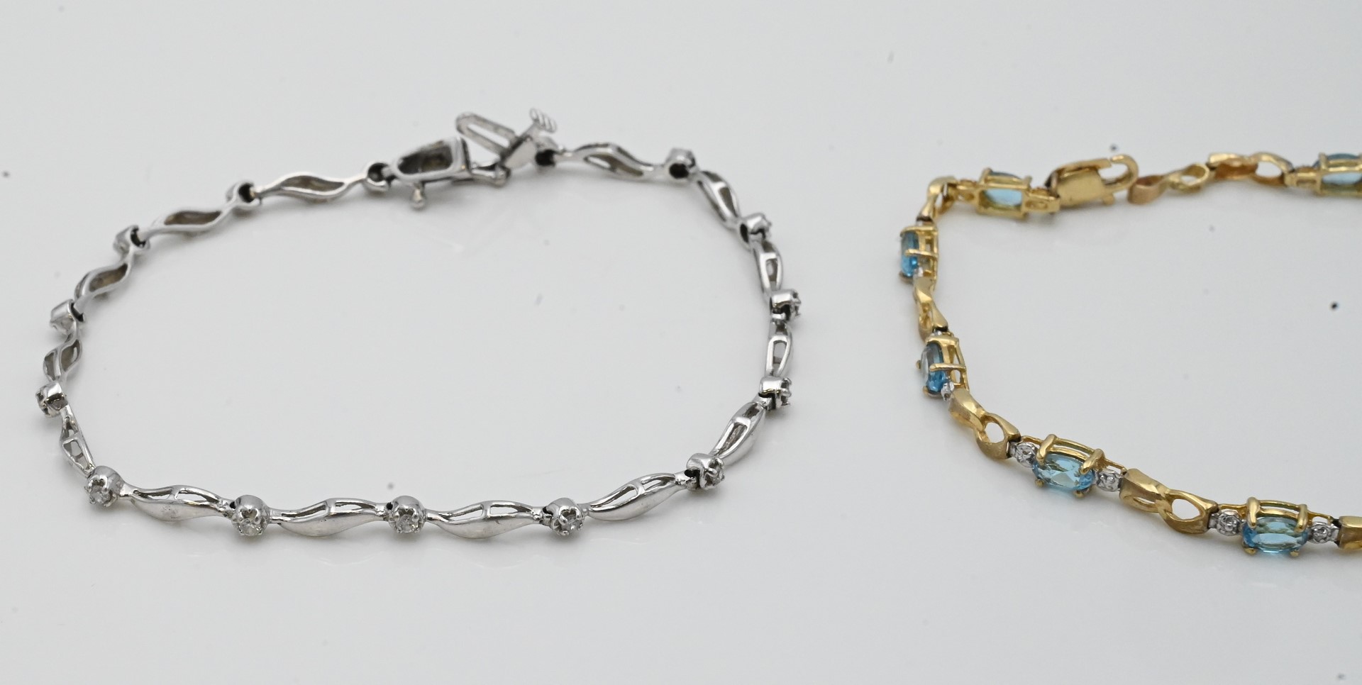 Two 14 Karat Gold and White Gold Bracelets, each mounted with small stones, lengths 7 and 7 1/4 inches, 8 grams.