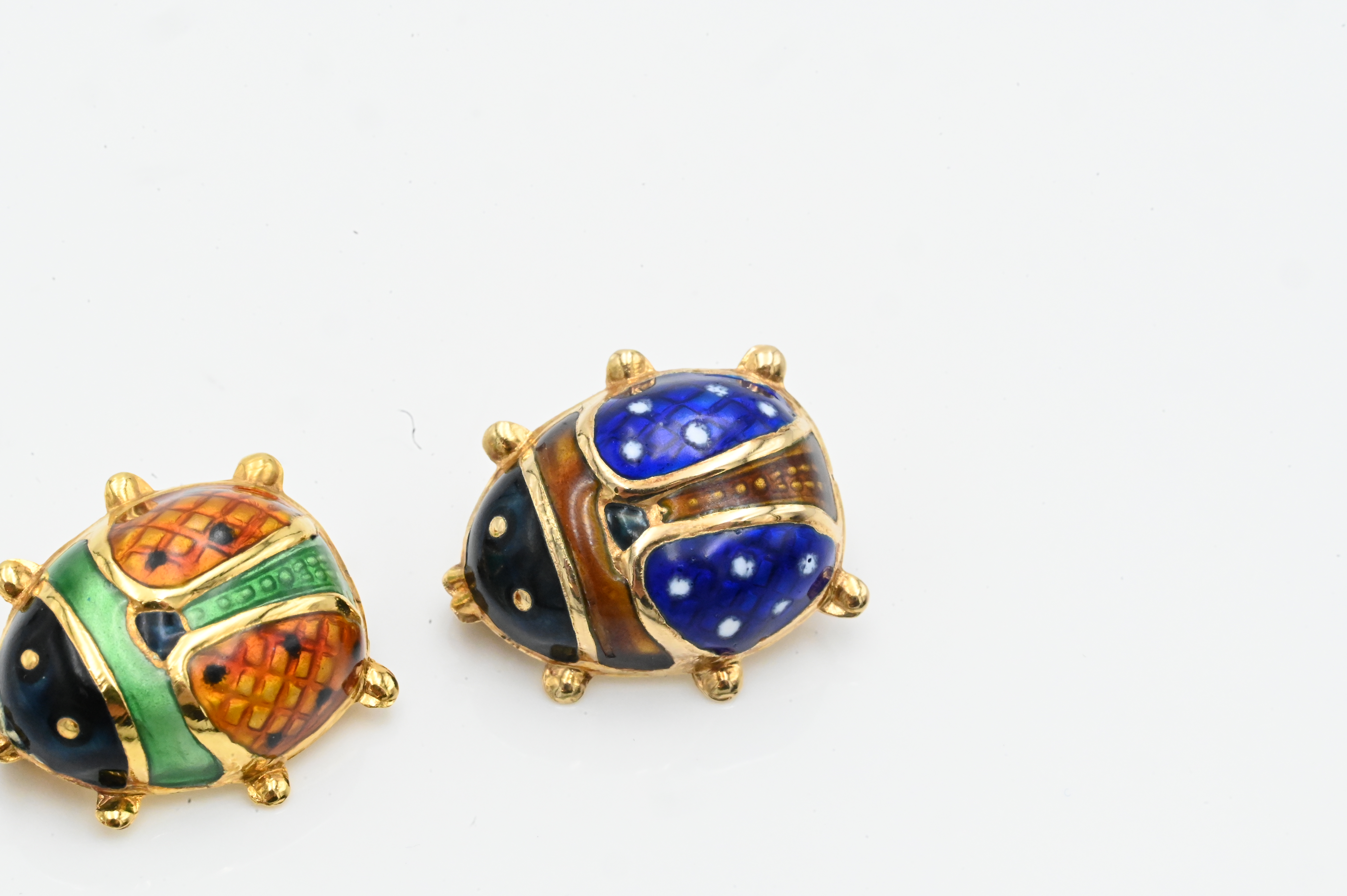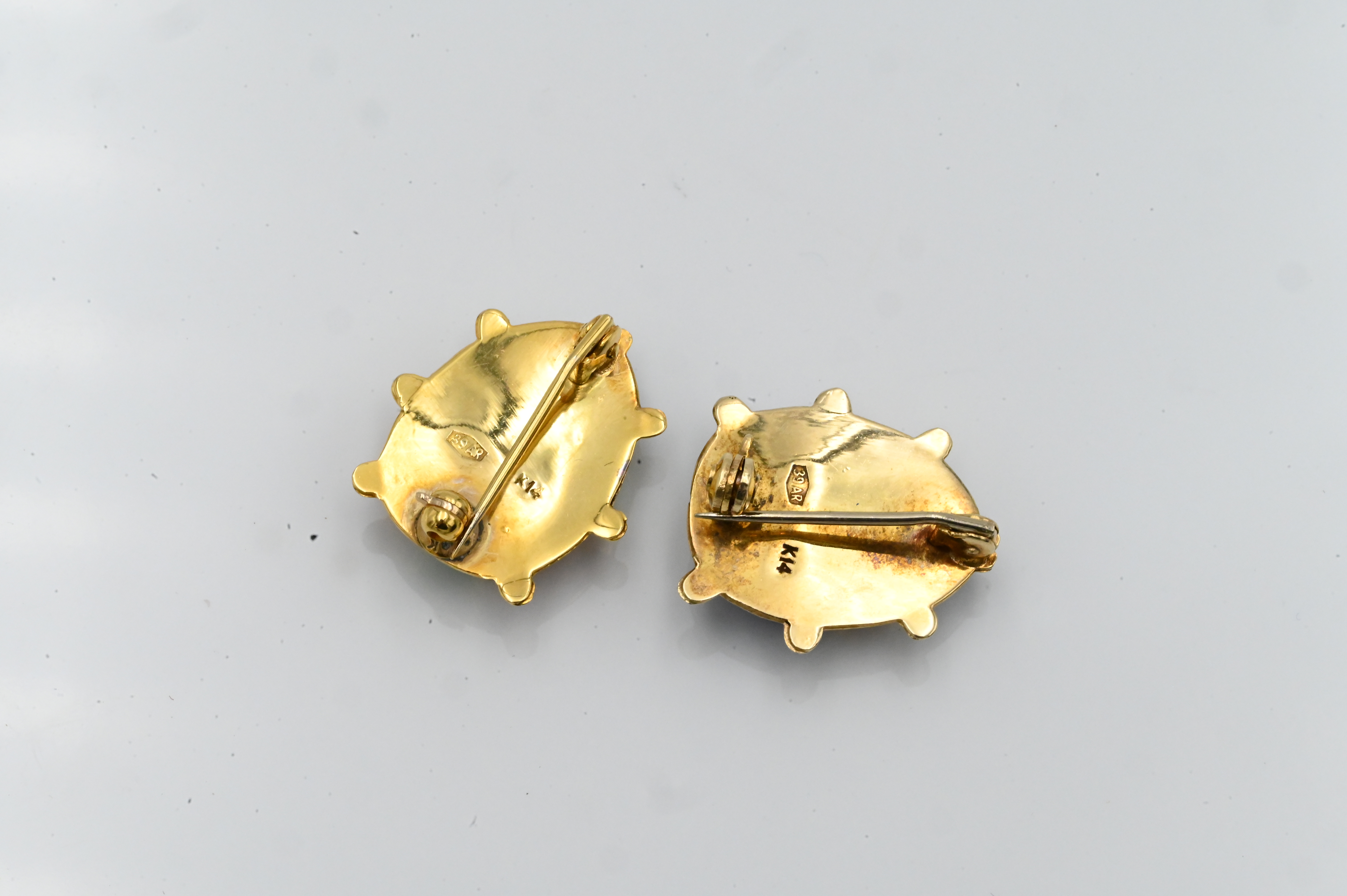 Two 14 Karat Yellow Gold Brooches, in the form of beetles, having enameling, 7/8 inches, 5.6 grams.