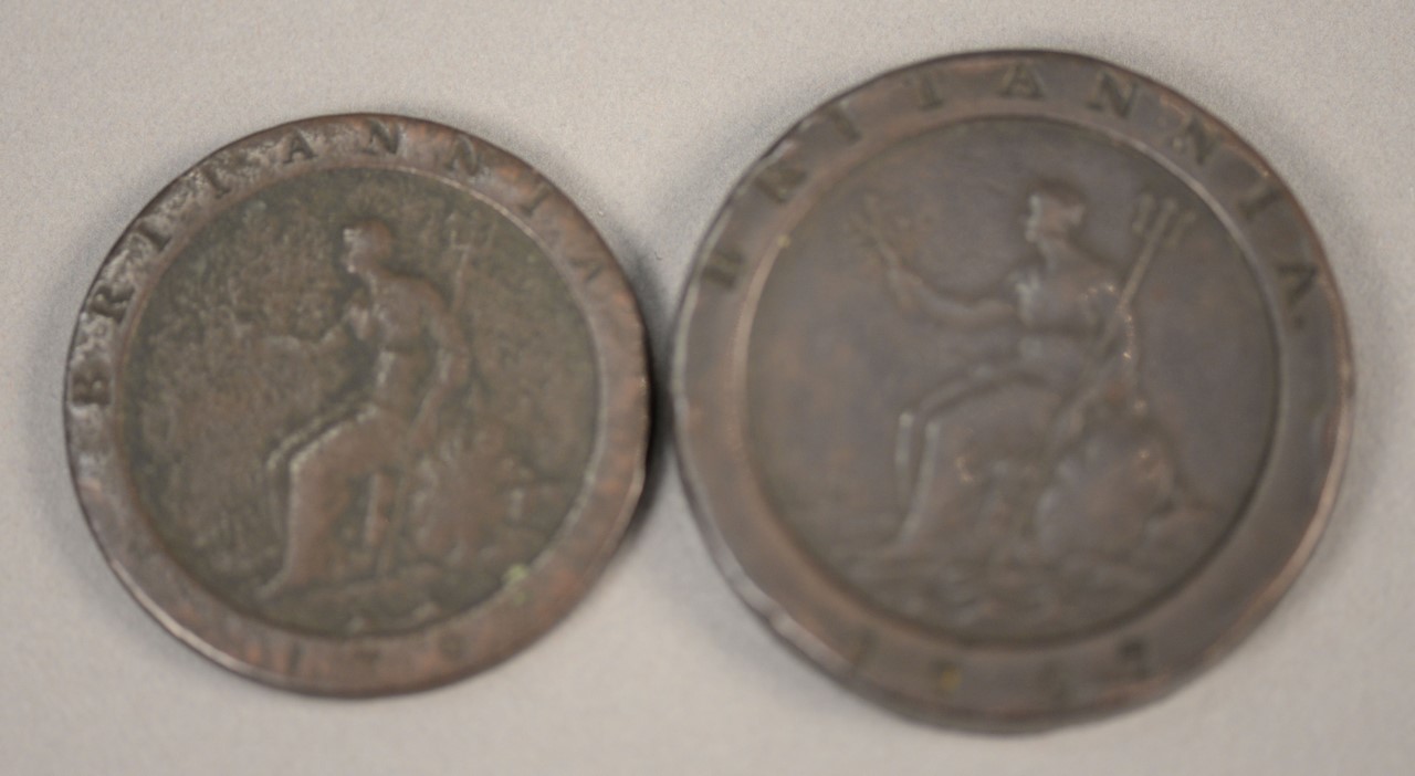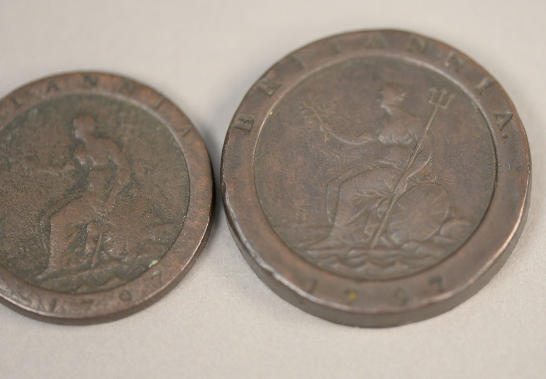 Lot 16: Two early copper coins including George III 1797 Britannia 2 pence cartwheel coin and a 1797 Britannia George III D. G. Rex large cent.