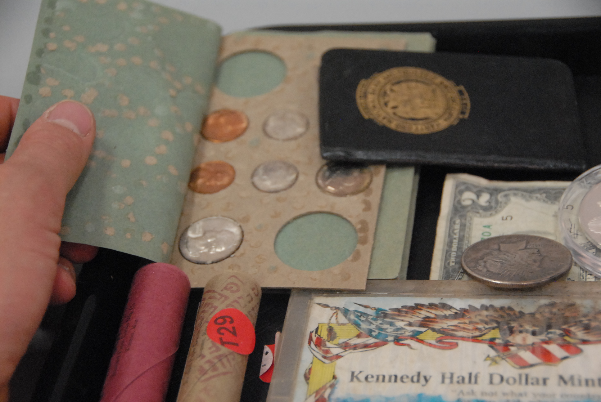 Two tray coin lot to include 1964 Kennedy Half dollar mint set, two uncirculated sets 1948 roll of uncirculated dimes, and roll of 1948 roll of uncirculated pennies, silver medallion, peace dollar, and 1964 Kennedy Half dollar.
