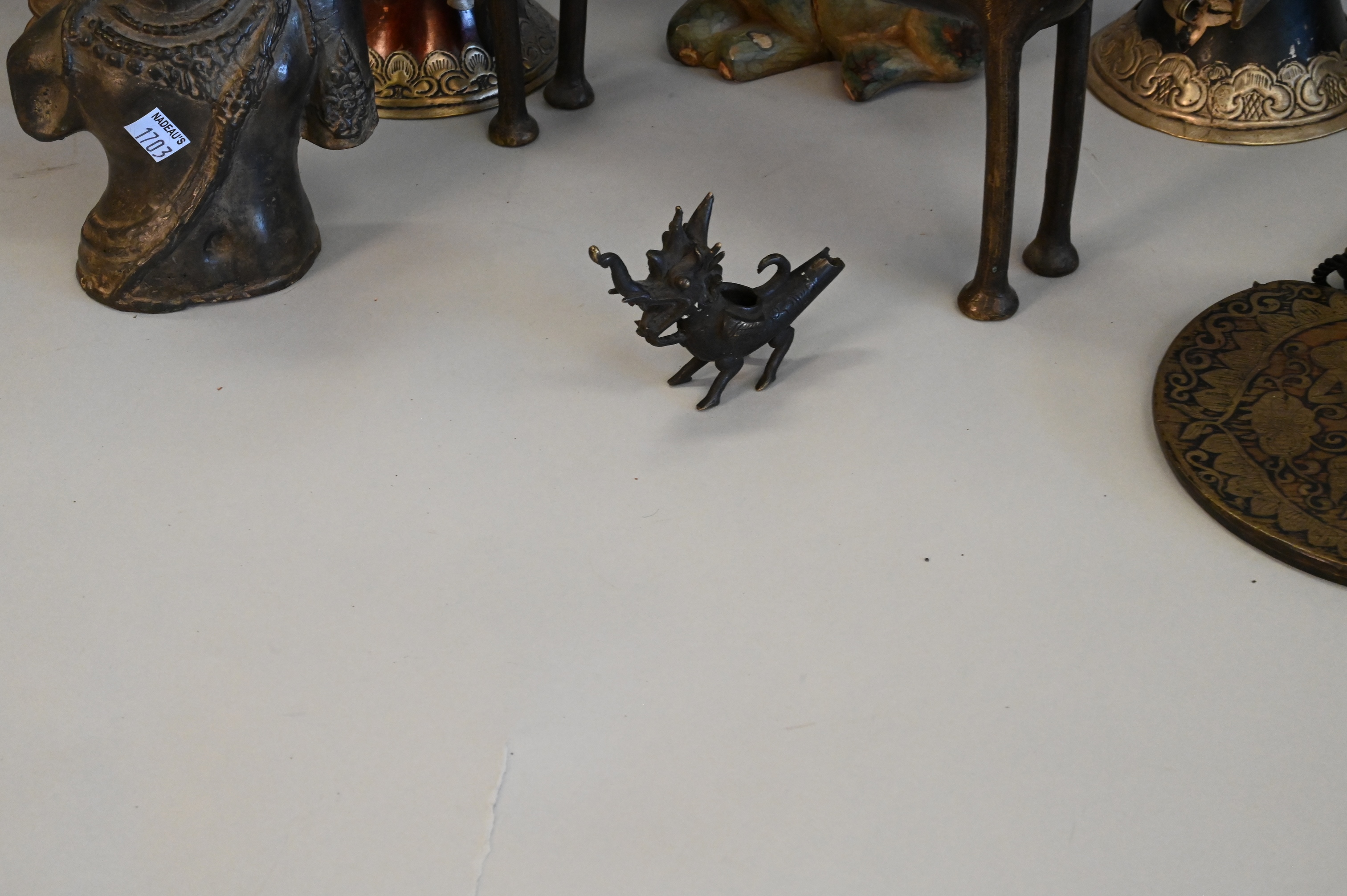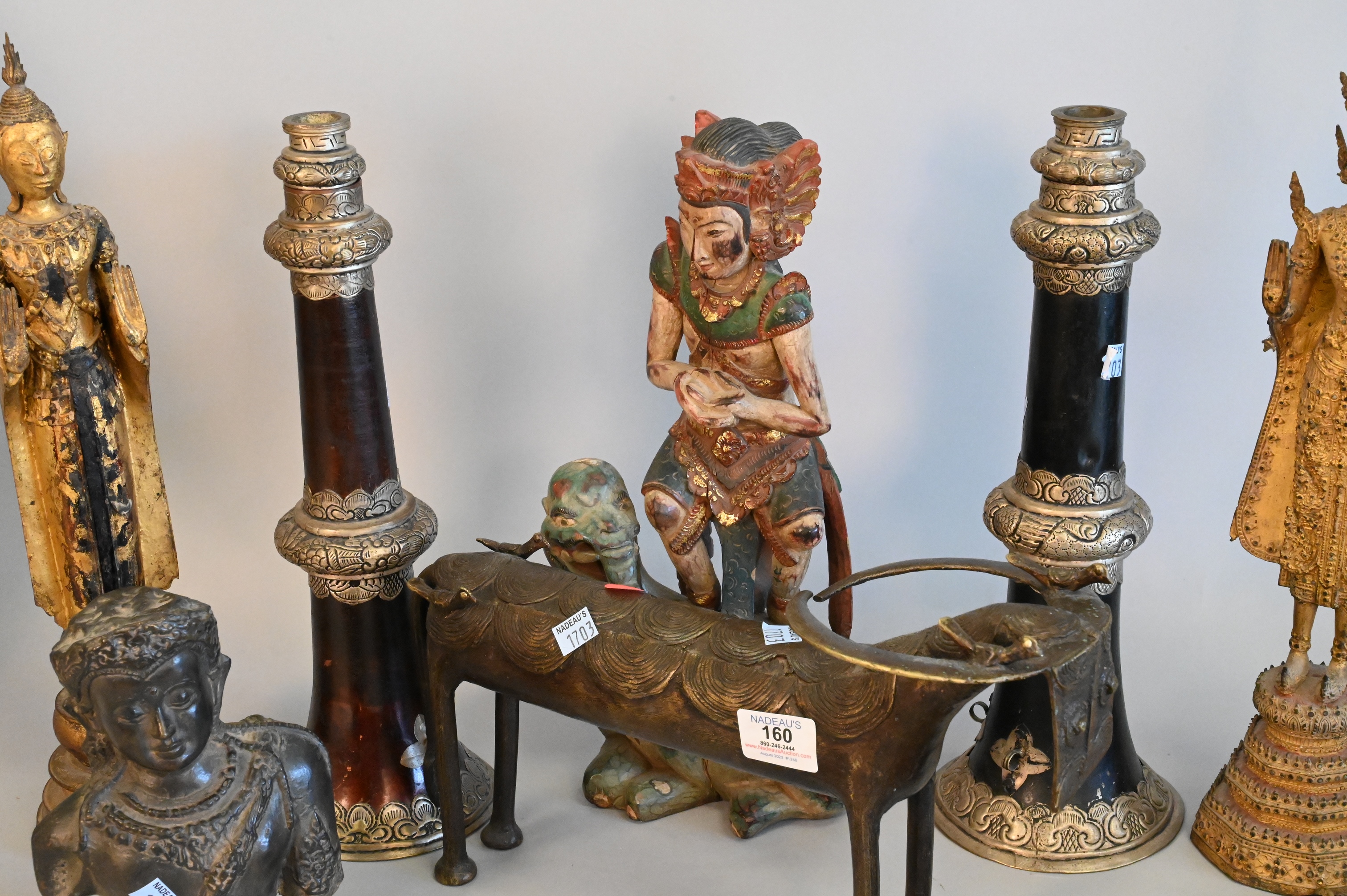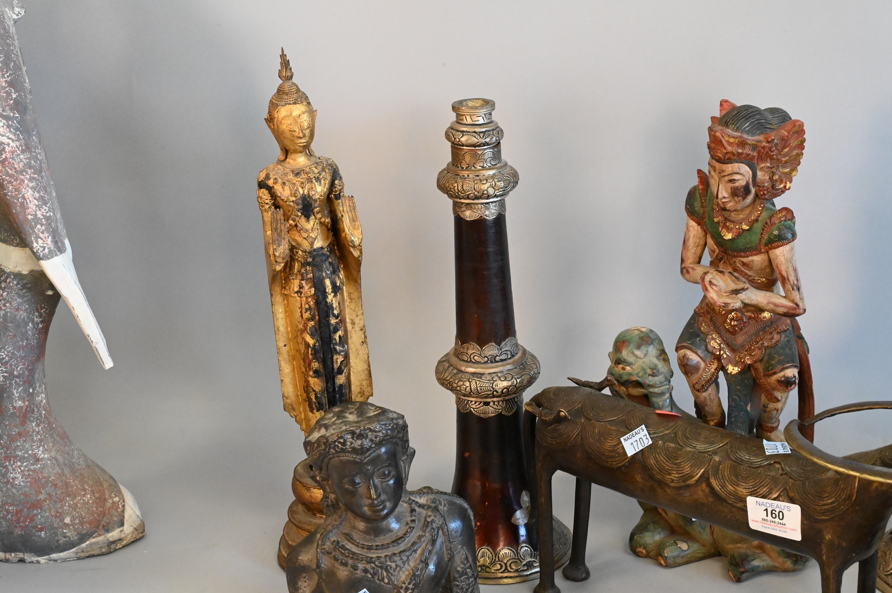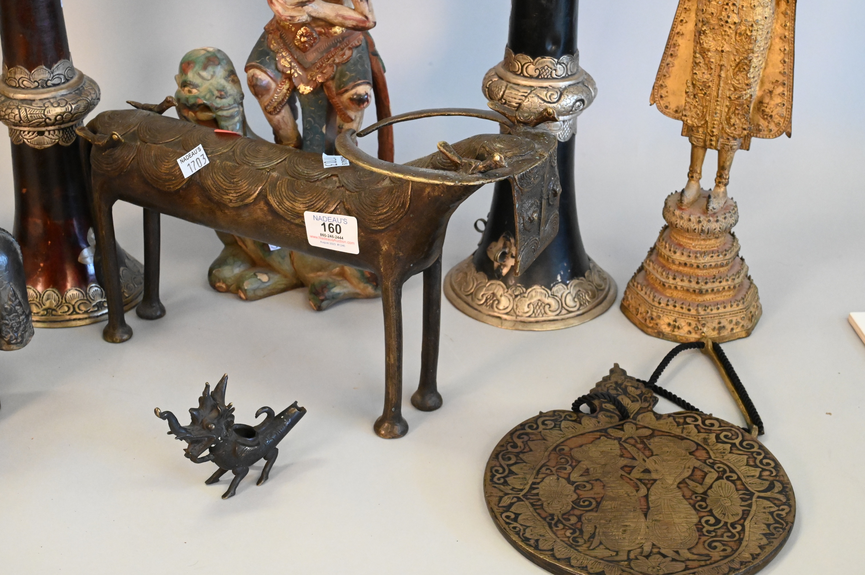 10 Piece East Asian Tibetan Group, to include two gilt Thai Rattanakosin buddhas, one metal and the other carved wood, a carved wooden sculpture of Vishnu riding a dragon, a small metal dragon sculpture, a metal foo dog/dragon snuff box having turquoise and coral inlay with detachable head, two antique Tibetan collapsable “Dungchen” horns, having silver alloy repousse floral banding, a metal etched woman with sword, a metal on clay Asian deity figure, along with a bronze animal, tallest heights 36 1/2 inches.