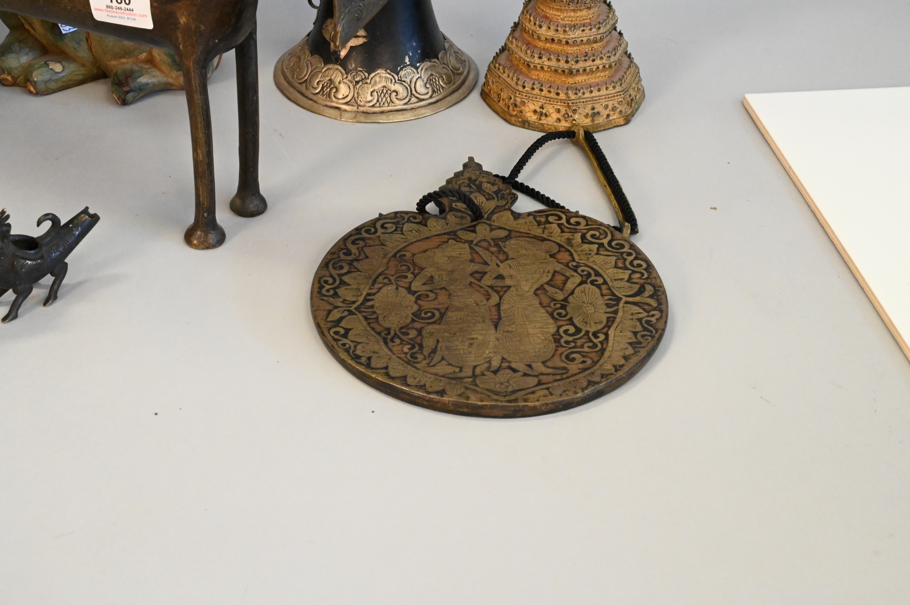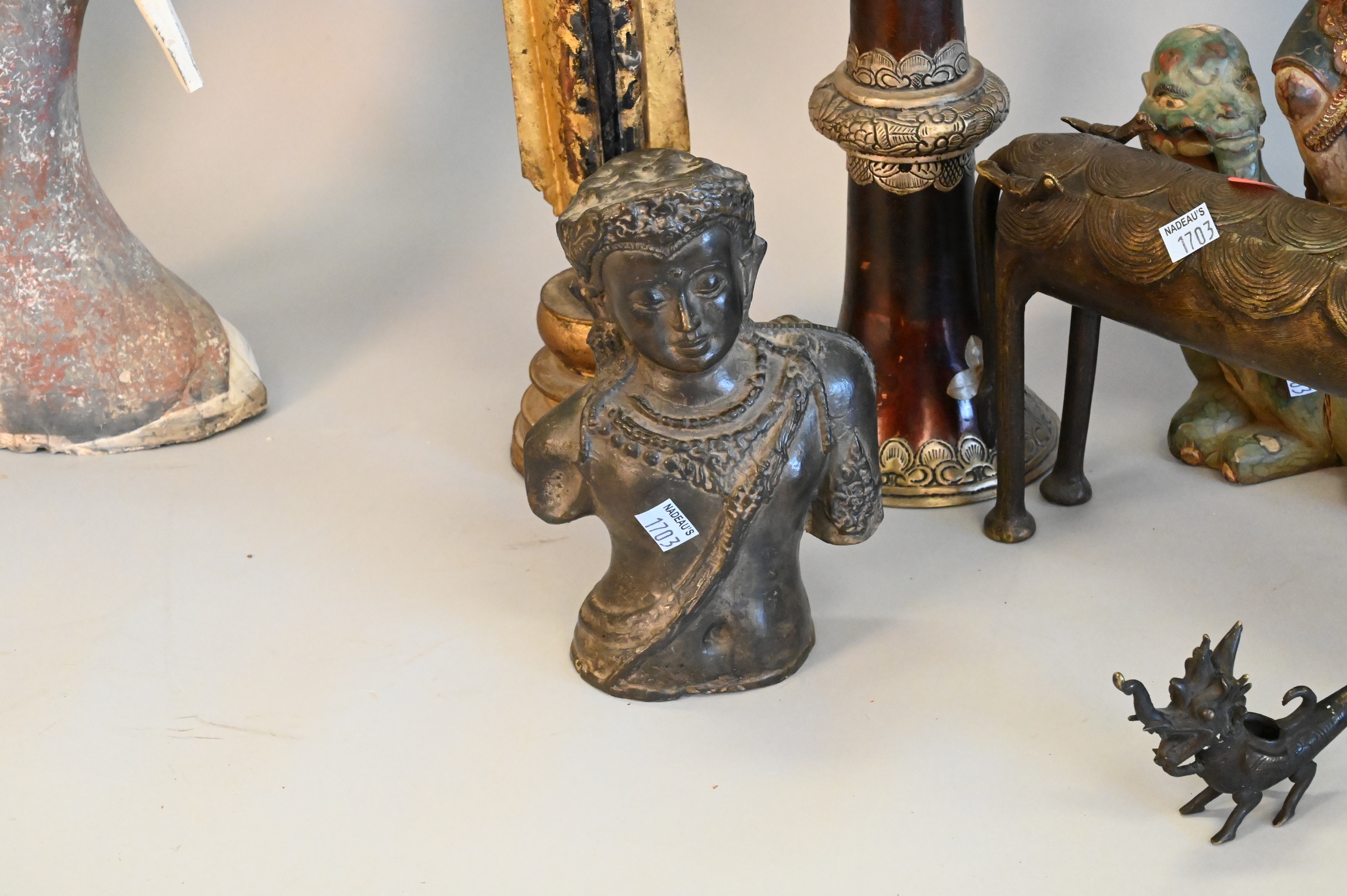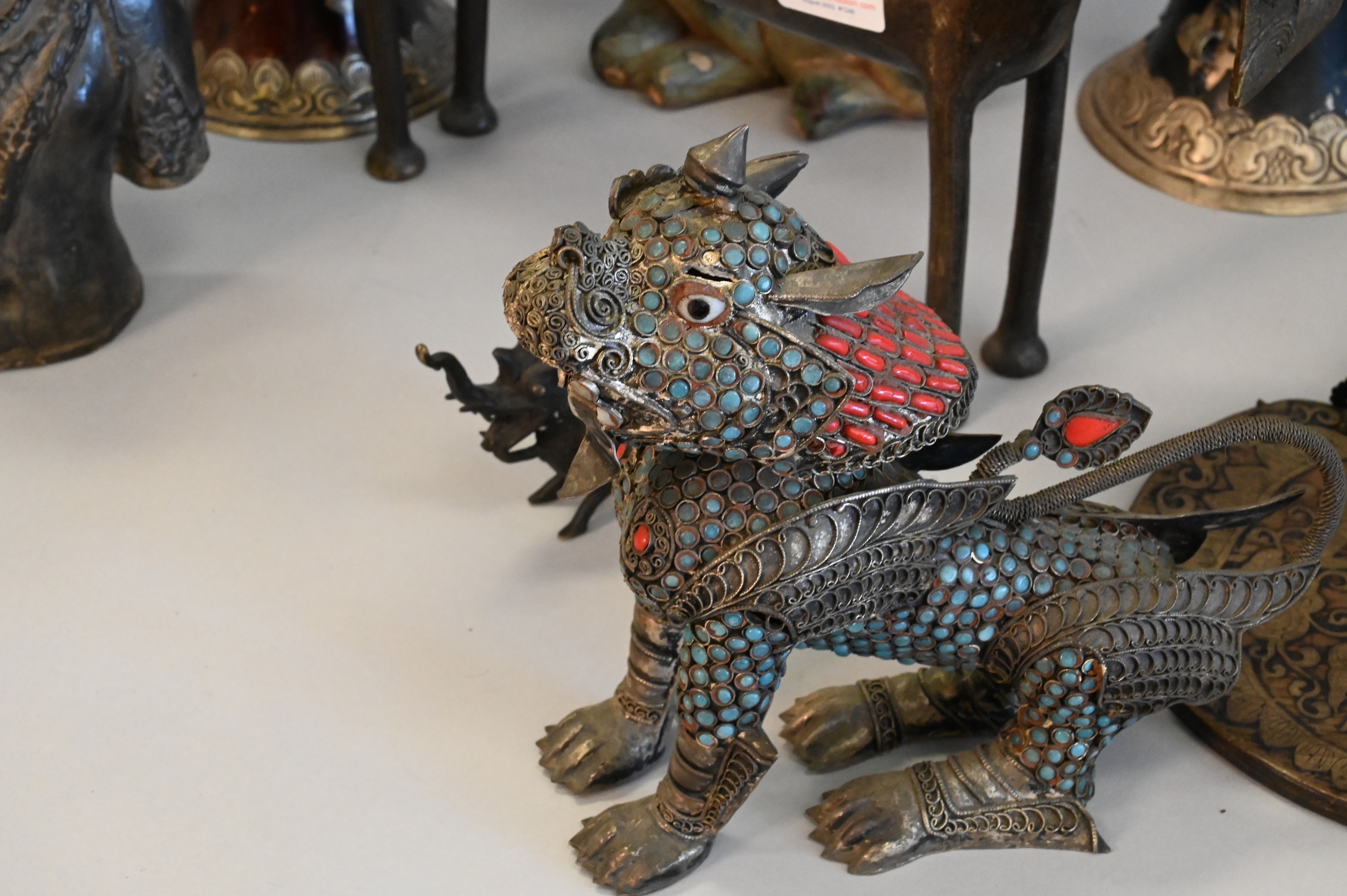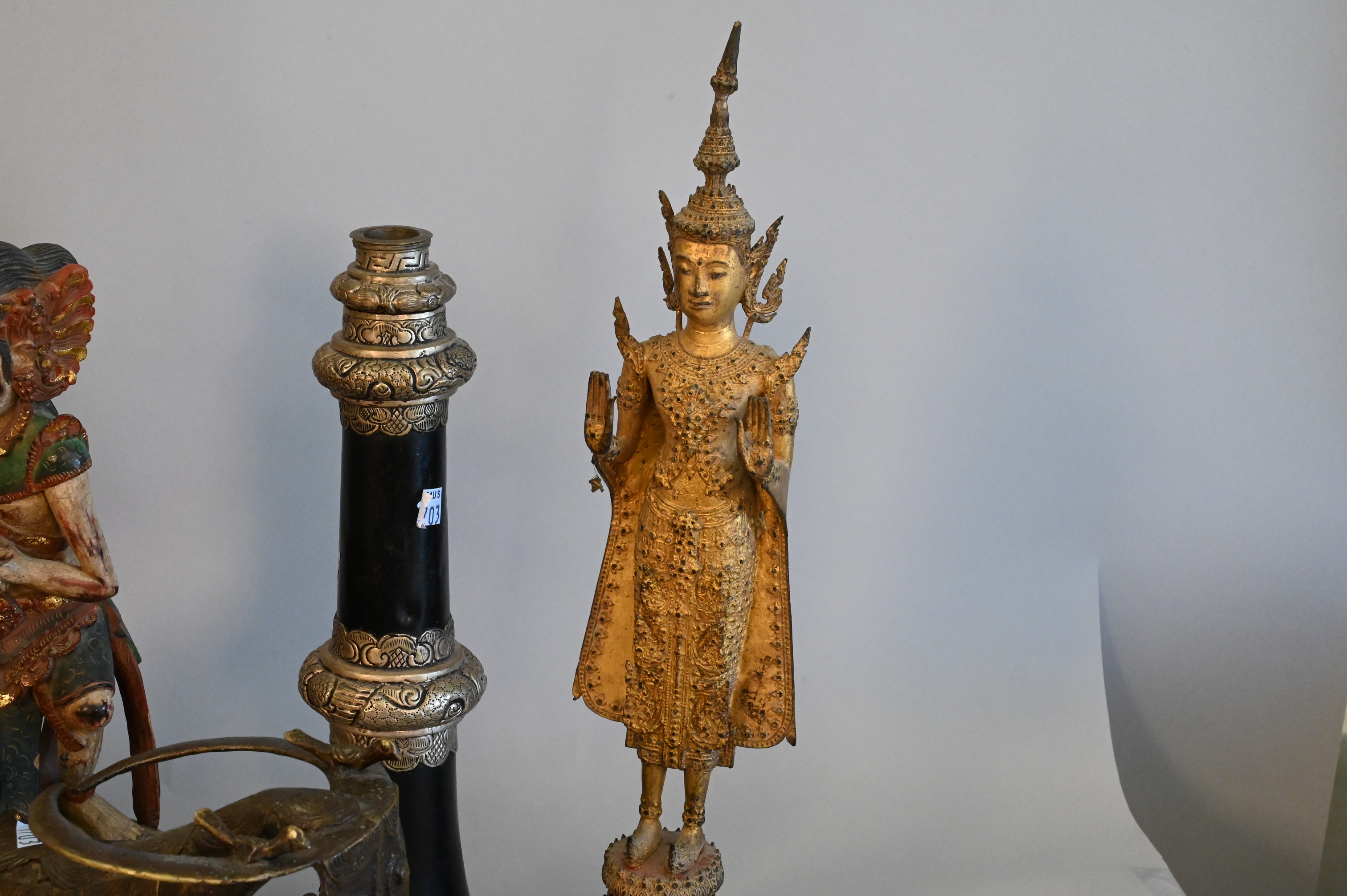 10 Piece East Asian Tibetan Group, to include two gilt Thai Rattanakosin buddhas, one metal and the other carved wood, a carved wooden sculpture of Vishnu riding a dragon, a small metal dragon sculpture, a metal foo dog/dragon snuff box having turquoise and coral inlay with detachable head, two antique Tibetan collapsable “Dungchen” horns, having silver alloy repousse floral banding, a metal etched woman with sword, a metal on clay Asian deity figure, along with a bronze animal, tallest heights 36 1/2 inches.