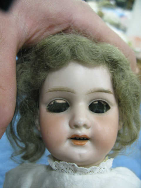 12 Bisque Head AM 390 on Ball jointed Compo Body BJCB right forearm missing, sleep eyes, open mouth.
