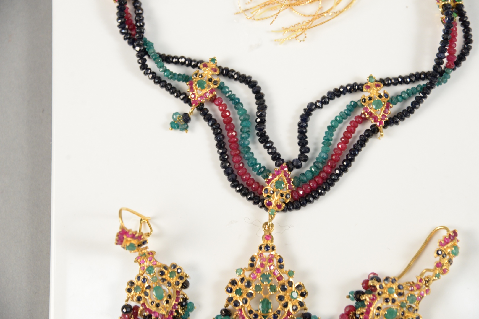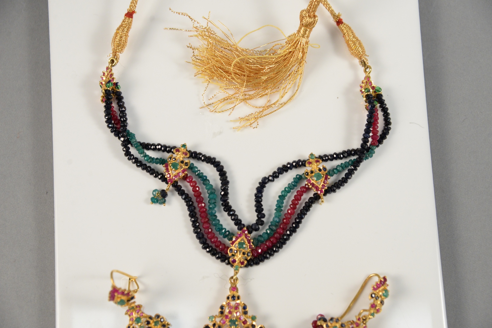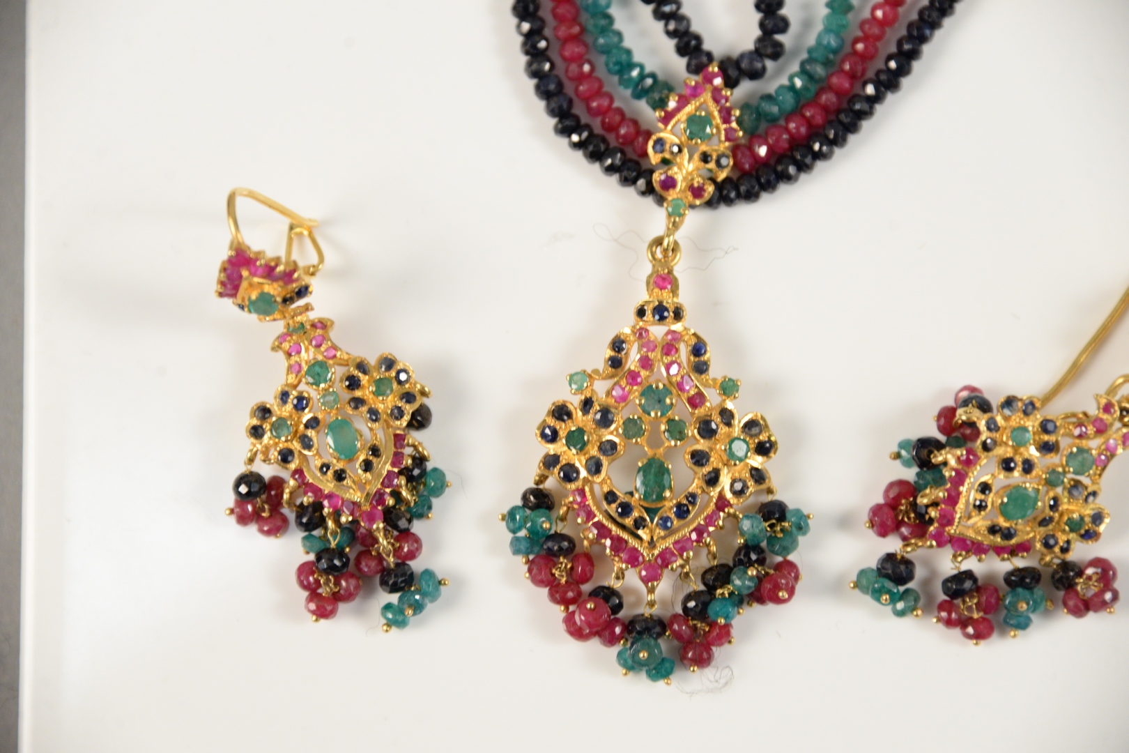 Lot 160: 22 Karat Gold Three Piece Necklace and Earrings set with emeralds, rubies, and sapphires 47 grams total weight without string