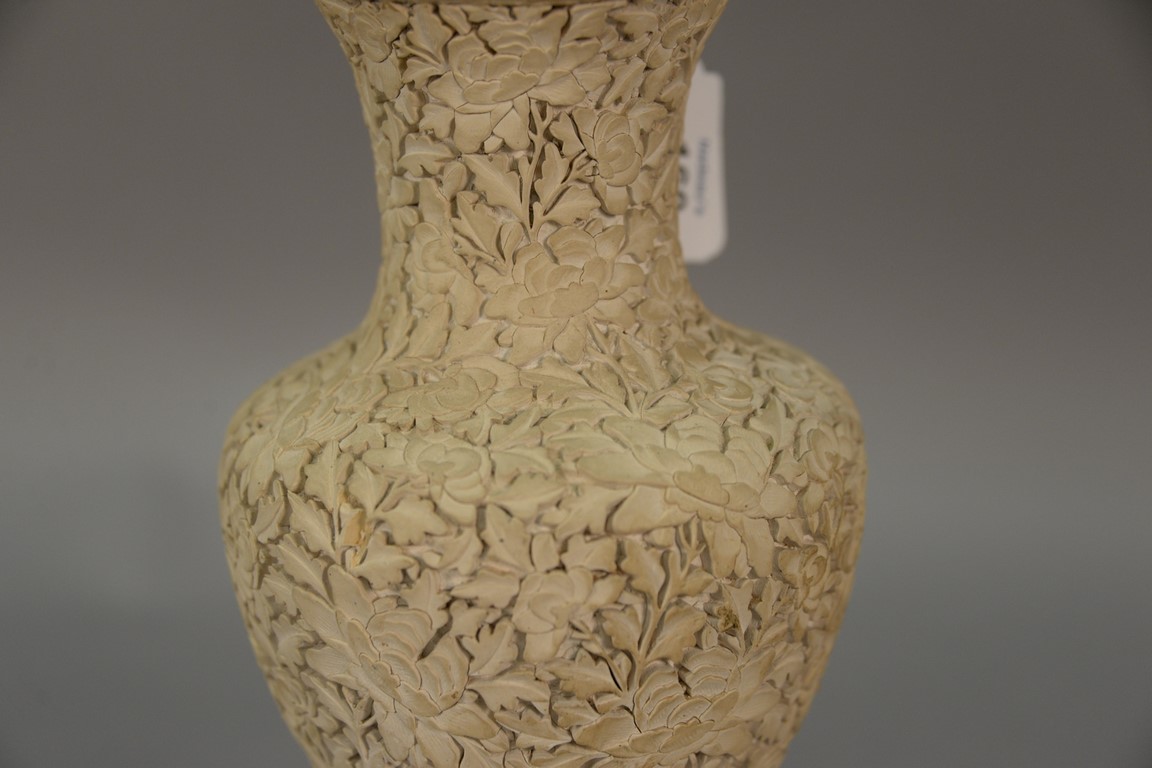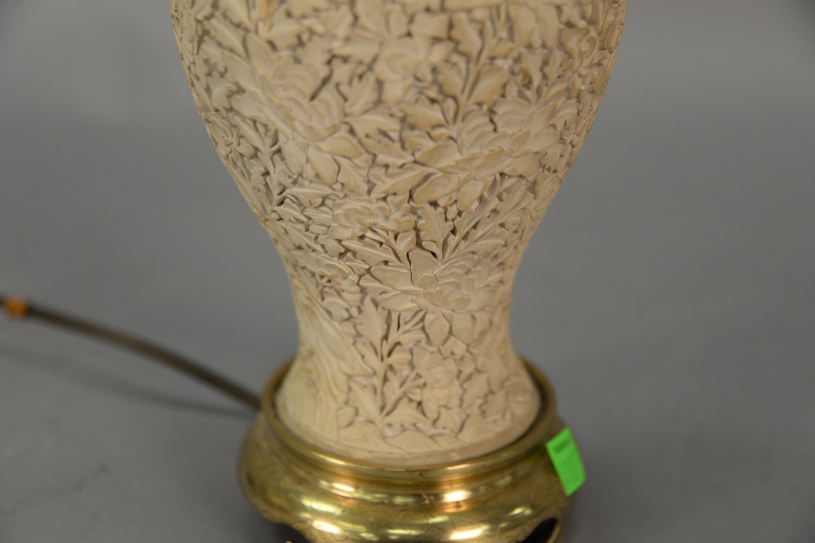 Chinese white cinnabar vase with carved blossoming flowers made into a table lamp. ht. 9in.