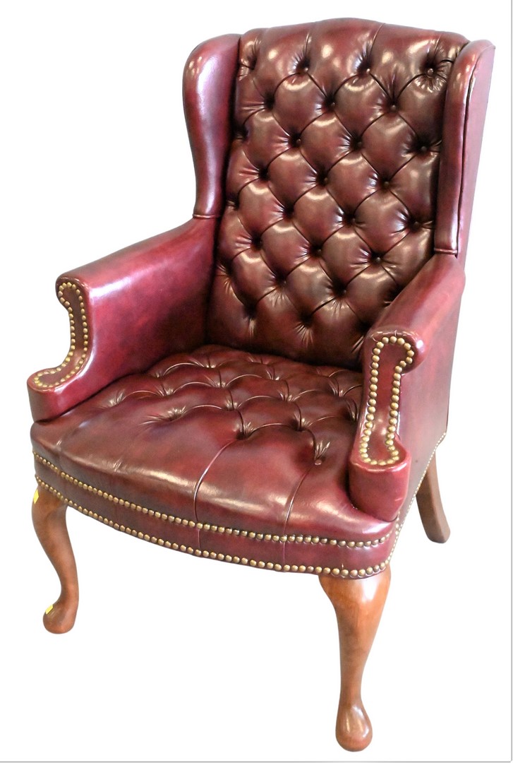 Diminutive Queen Anne Style Tufted Leather Wing Chair, height 37 inches, width 27 inches.