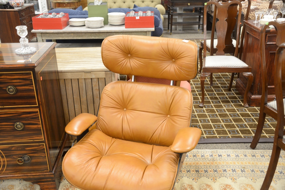 Eames Style Brown Leather Lounge Chair, along with matching ottoman, height 38 1/2 inches.