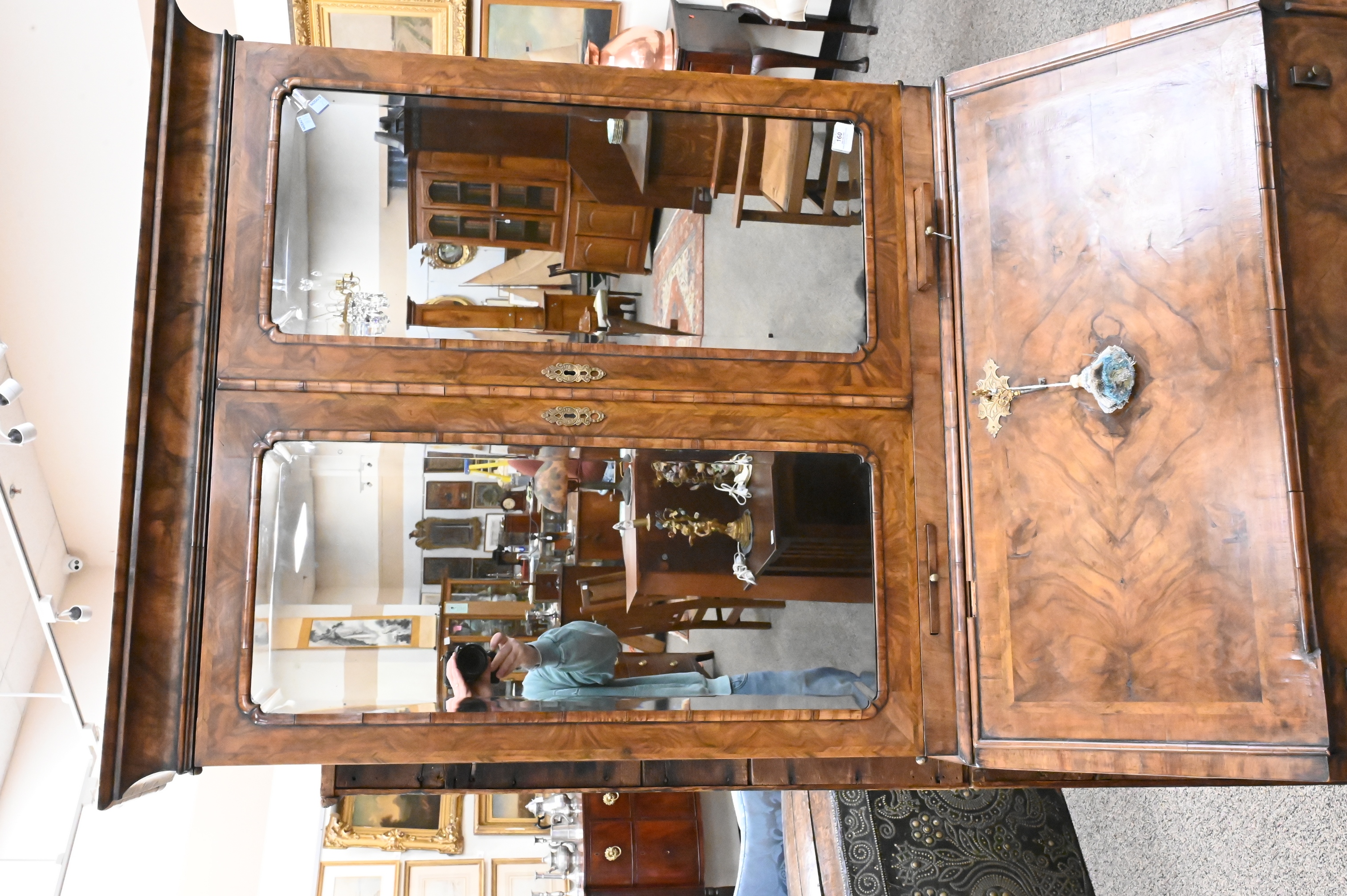in two parts, upper section having two beveled mirrored doors opening to shelves on lower section with slant lid over two over two drawers on bracket base, interior drawers and well England, circa 1750, small chips, backboards replaced