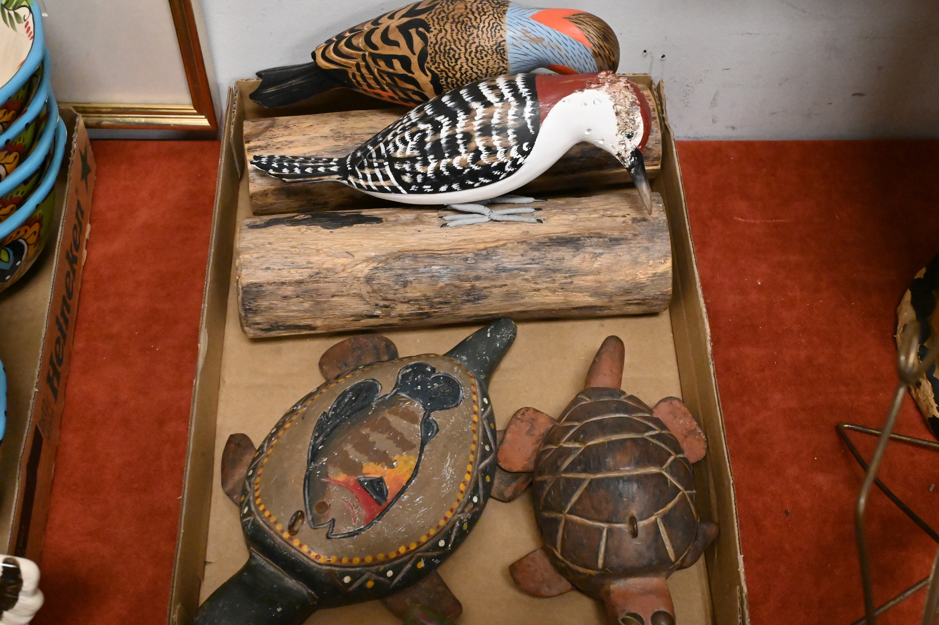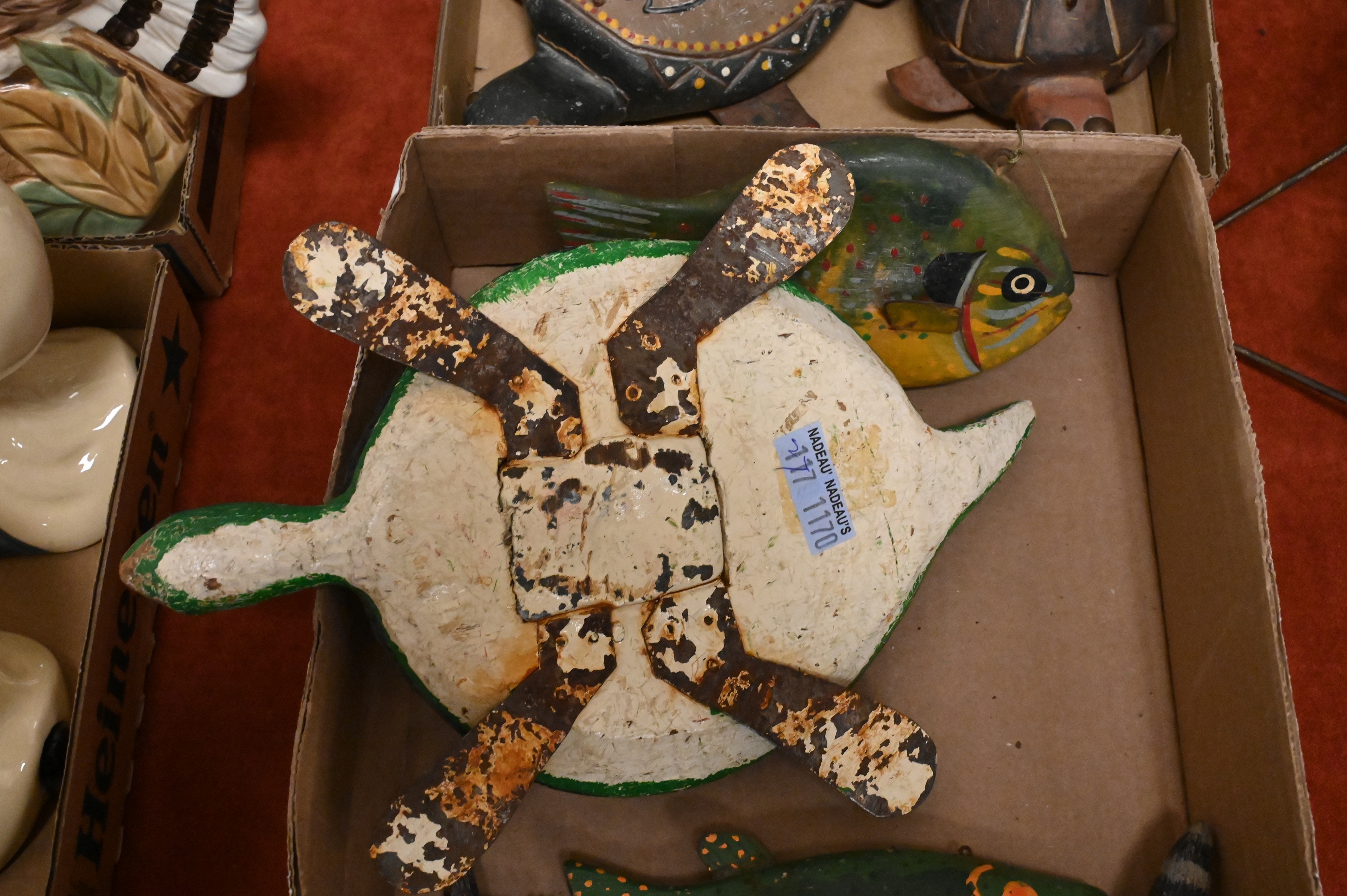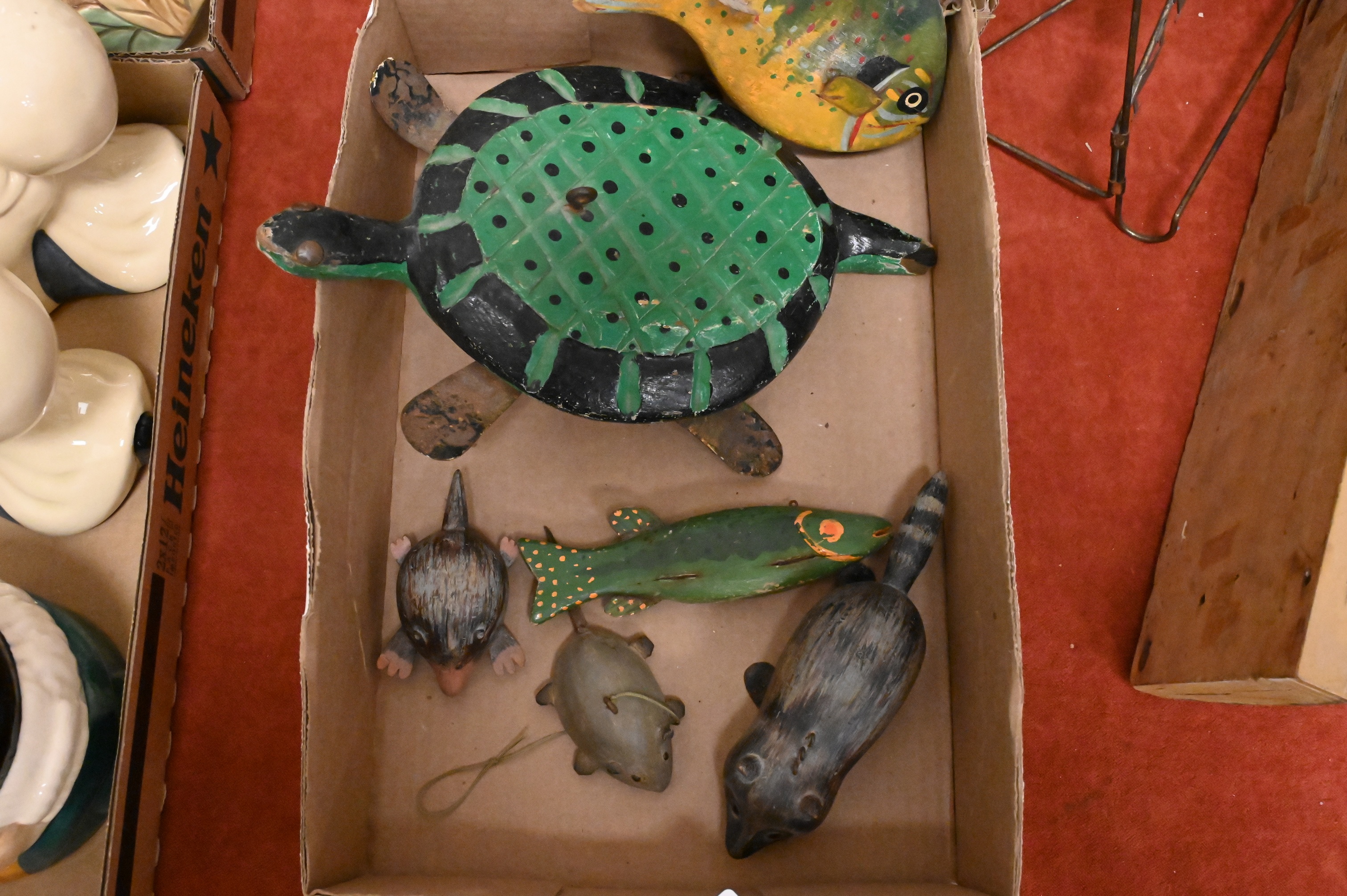 two green fish, three larger turtles (one painted with fish) racoon with glass eyes, vole/mole, mouse