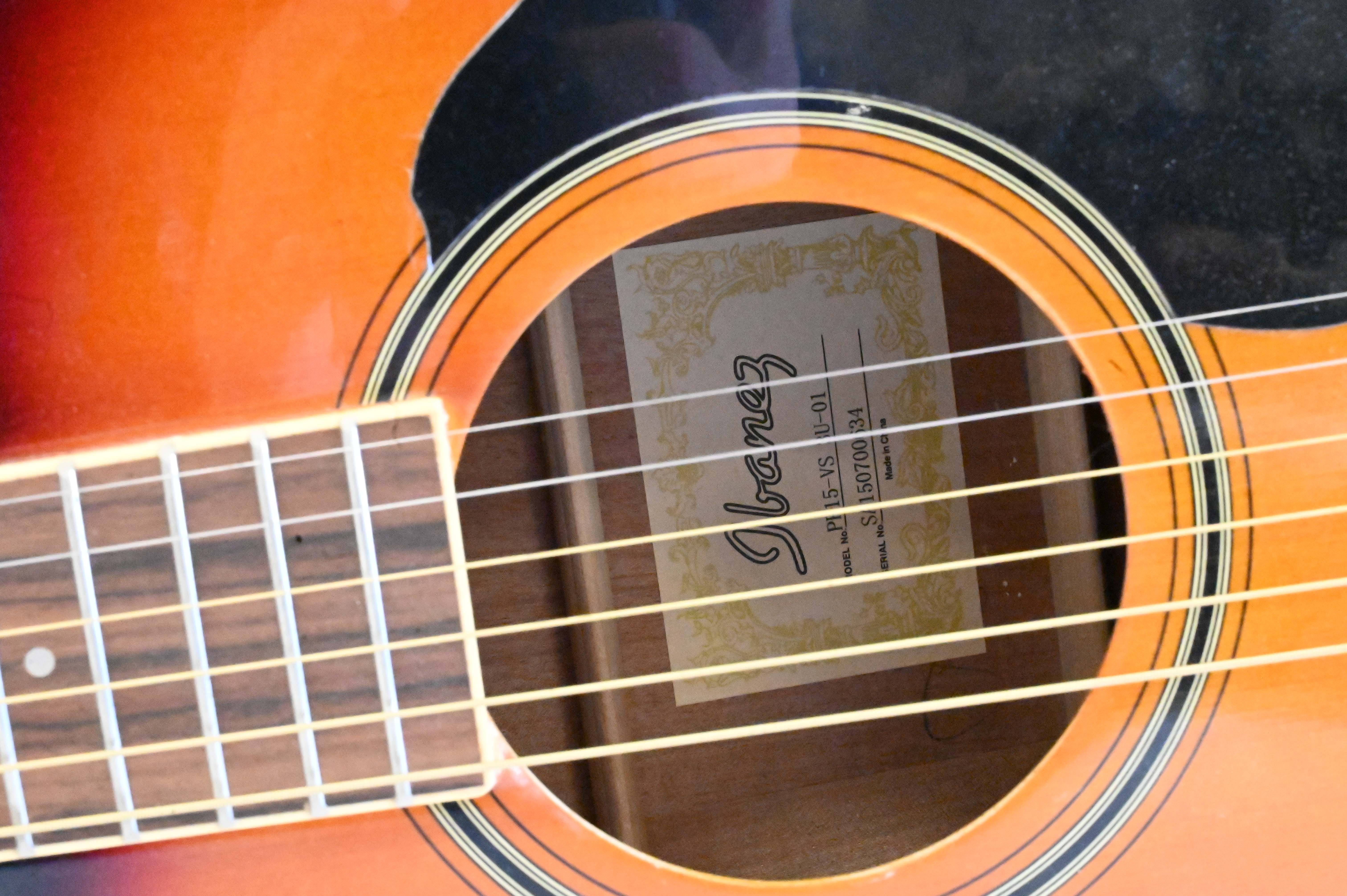 Ibanez Guitar, model PF15VS, Dreadnought Acoustic Guitar Glass Vintage Sunburst, six string, 41 inches x 15 3/4 inches x 5 inches.