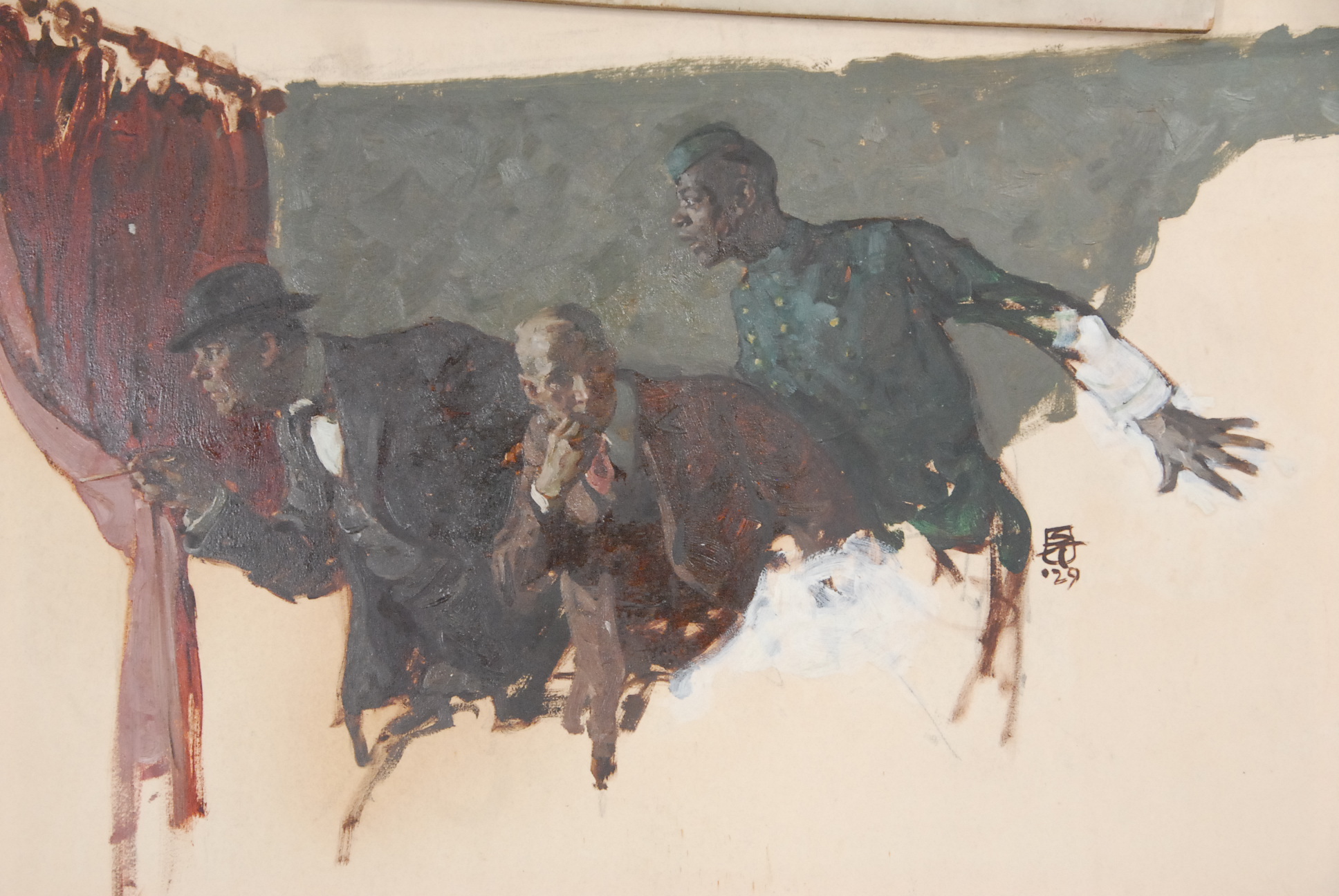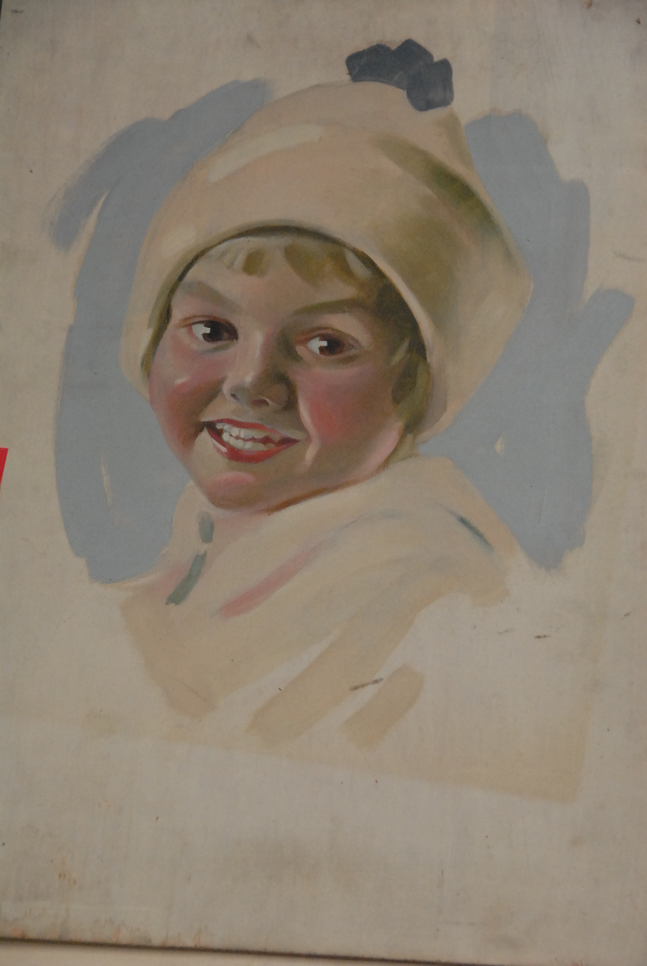 Illustrated art, two oil paintings, one of three men monogrammed Edward Tevis 29, and an oil on board of a young girl, unsigned
