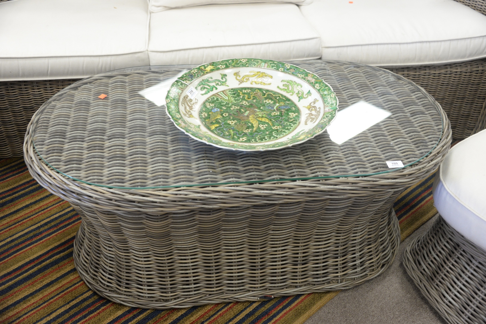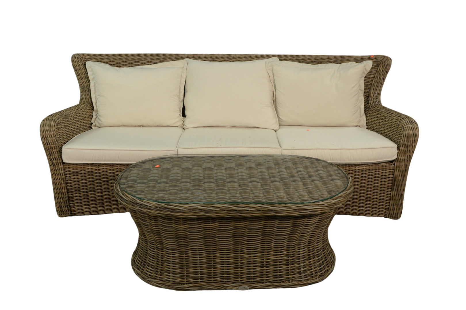 Lot 160: Kingsley Bate Two Piece Woven Sofa and Oval Coffee Table having upholstered cushions, sofa height 33 inches, length 84 inches; table height 19 1/2 inches, top 25″ x 45″.