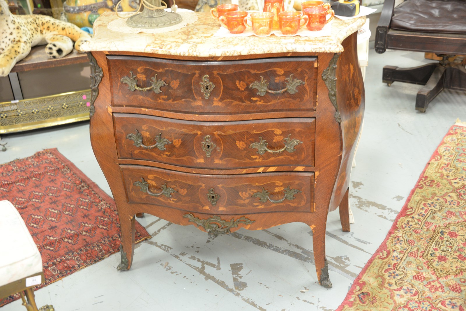 Lot 160: Louis XV style marble top commode with inlaid front and metal mounts, early 20th century veneer damage.ht. 37 in. wd. 39 in. …