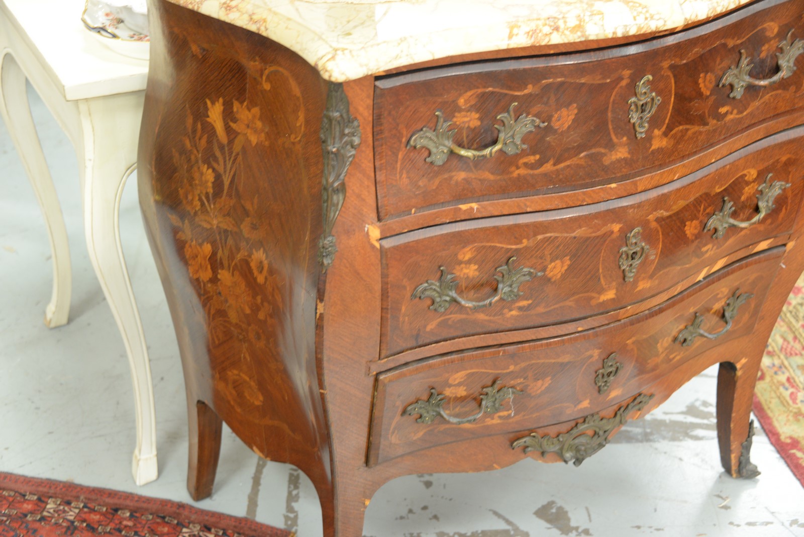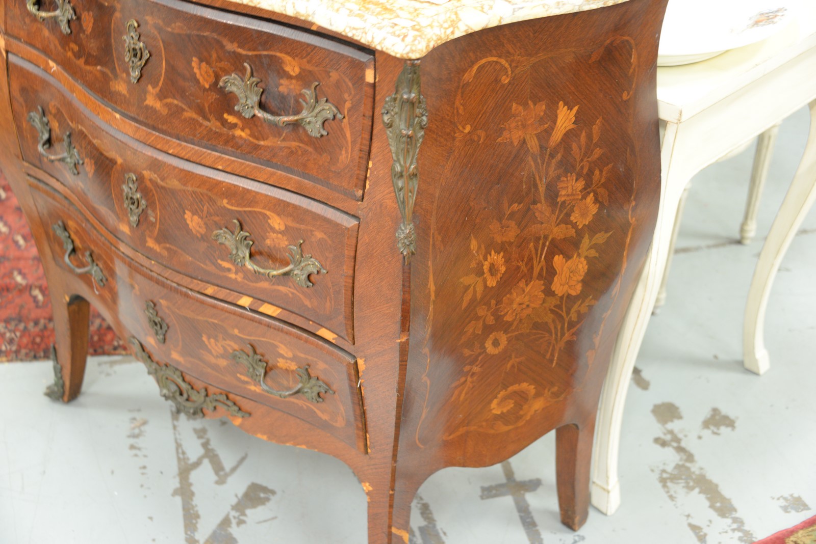 Louis XV style marble top commode with inlaid front and metal mounts, early 20th century veneer damage. ht. 37 in. wd. 39 in. dp. 18 1/2 in.