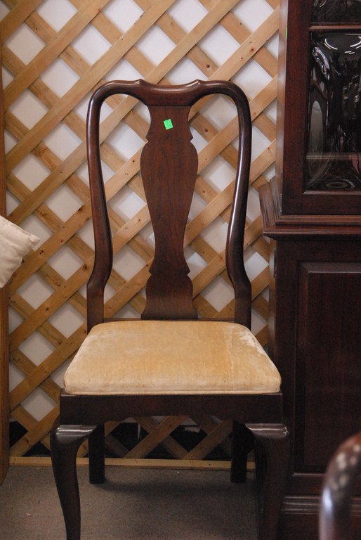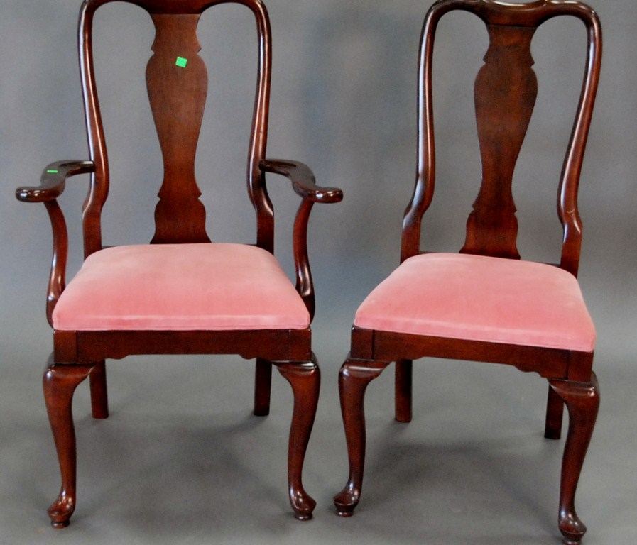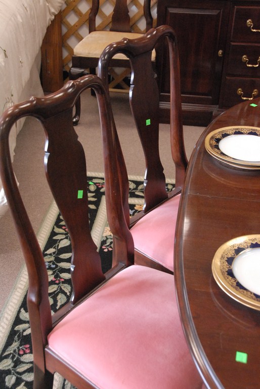 Nine piece Ethan Allen dining set having oval Queen Anne style dining table and eight Queen Anne style dining chairs with upholstered seats, table: ht. 29 top: 44 x 66 with two leaves and custom pads, each leave is 18 inches, total open lg. 102in.