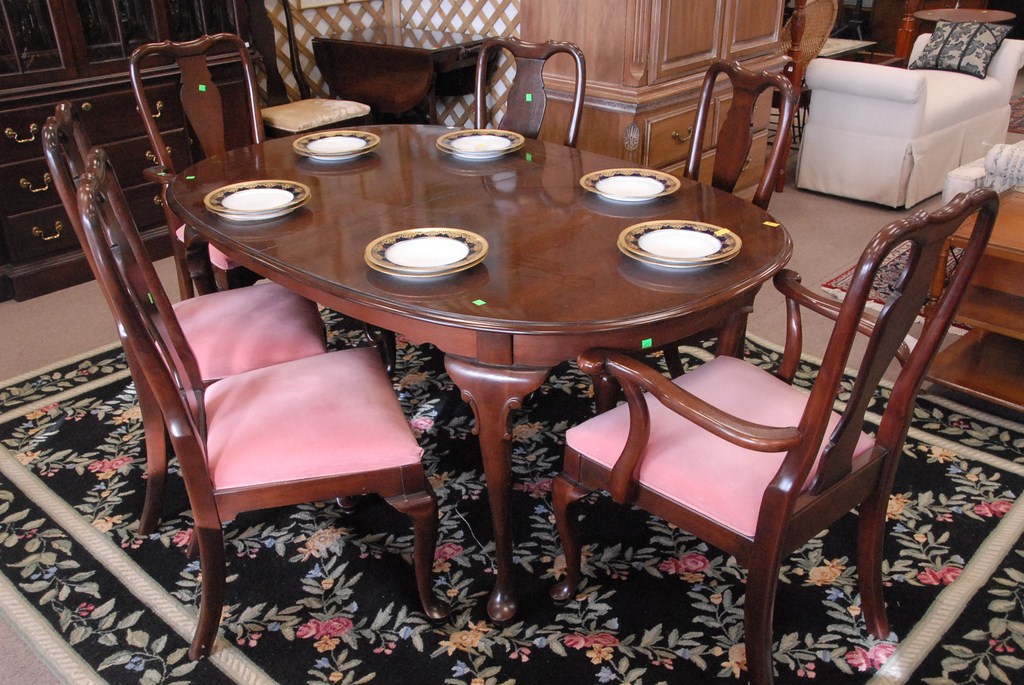 Lot 160: Nine piece Ethan Allen dining set having oval Queen Anne style dining table and eight Queen Anne style dining chairs with upholstere…