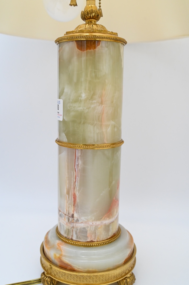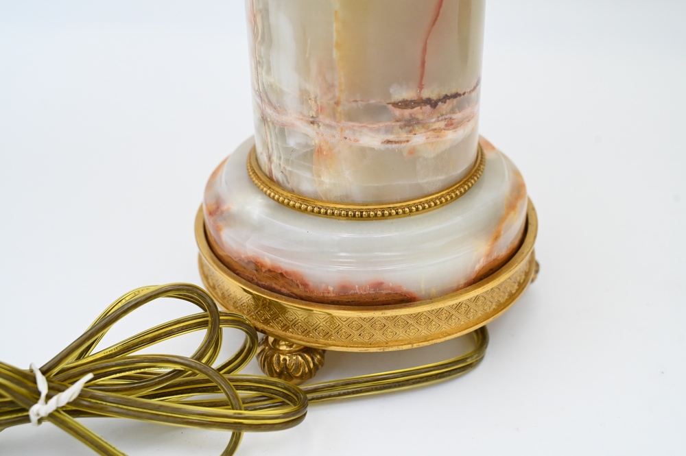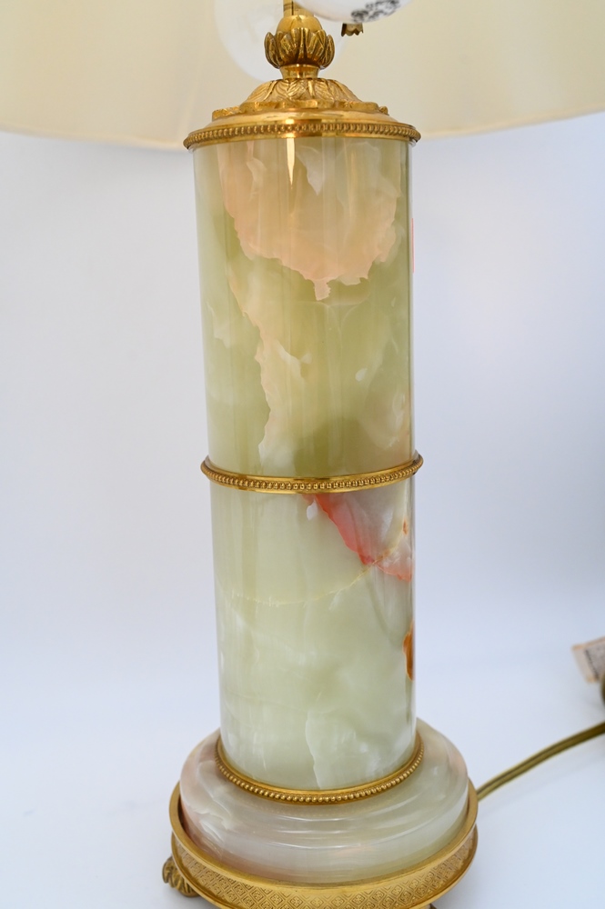 Pair of Alabaster Lamps, on bronze feet, height 23 inches.