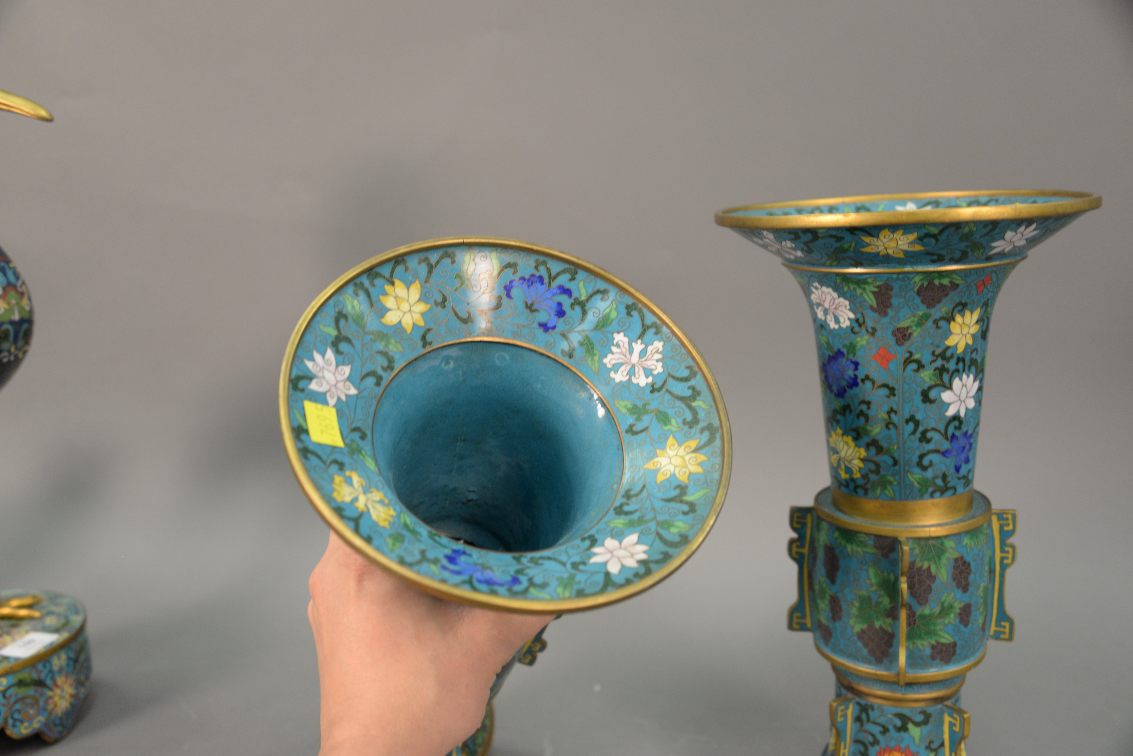 Lot 160: Pair of cloisonne enameled sleeve form vases with scrolling vines, wild flowers, and grapes. ht. 15 1/2 in.