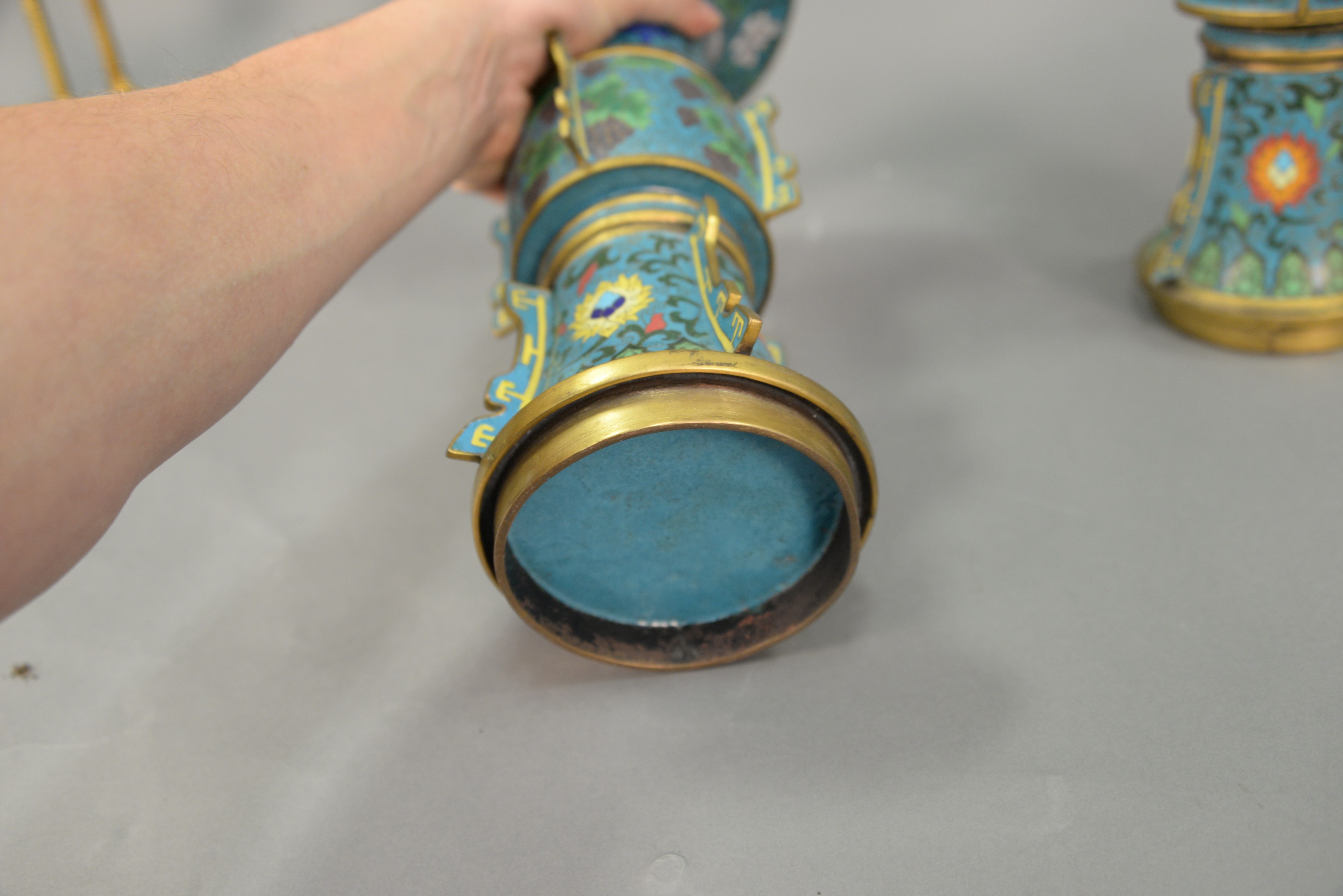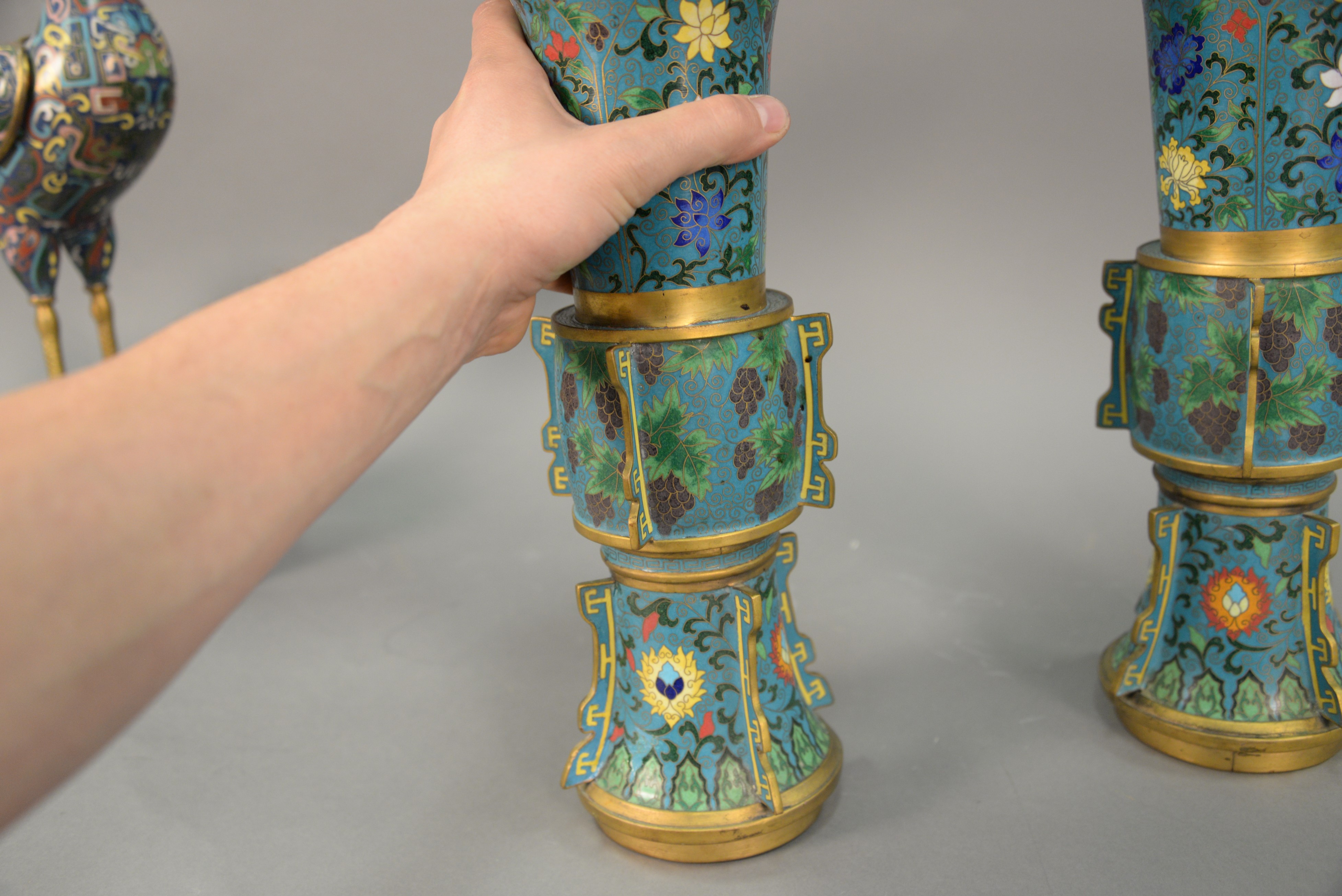 Pair of cloisonne enameled sleeve form vases with scrolling vines, wild flowers, and grapes. ht. 15 1/2 in.