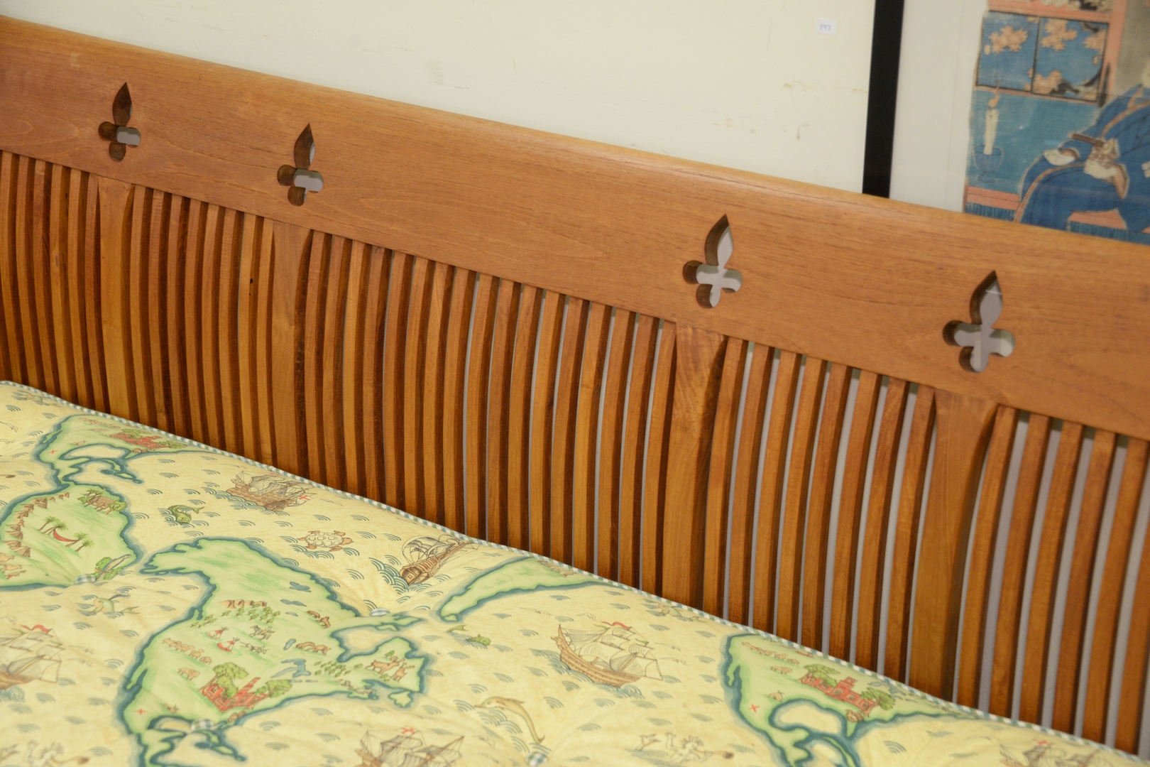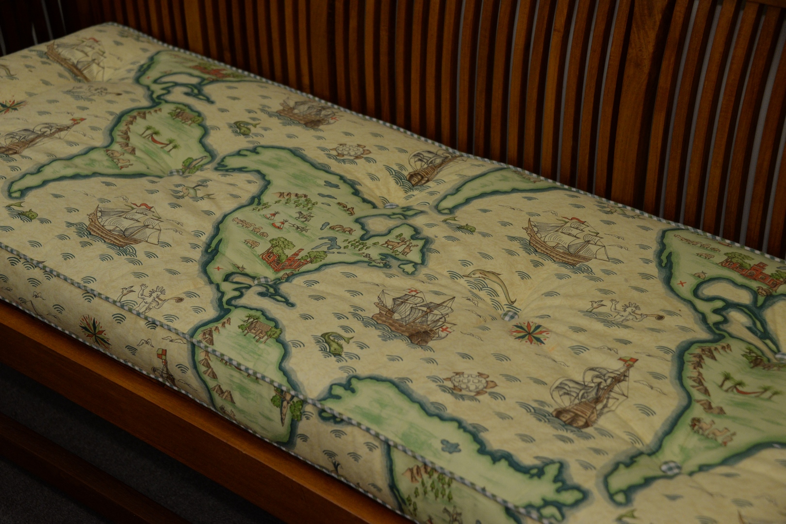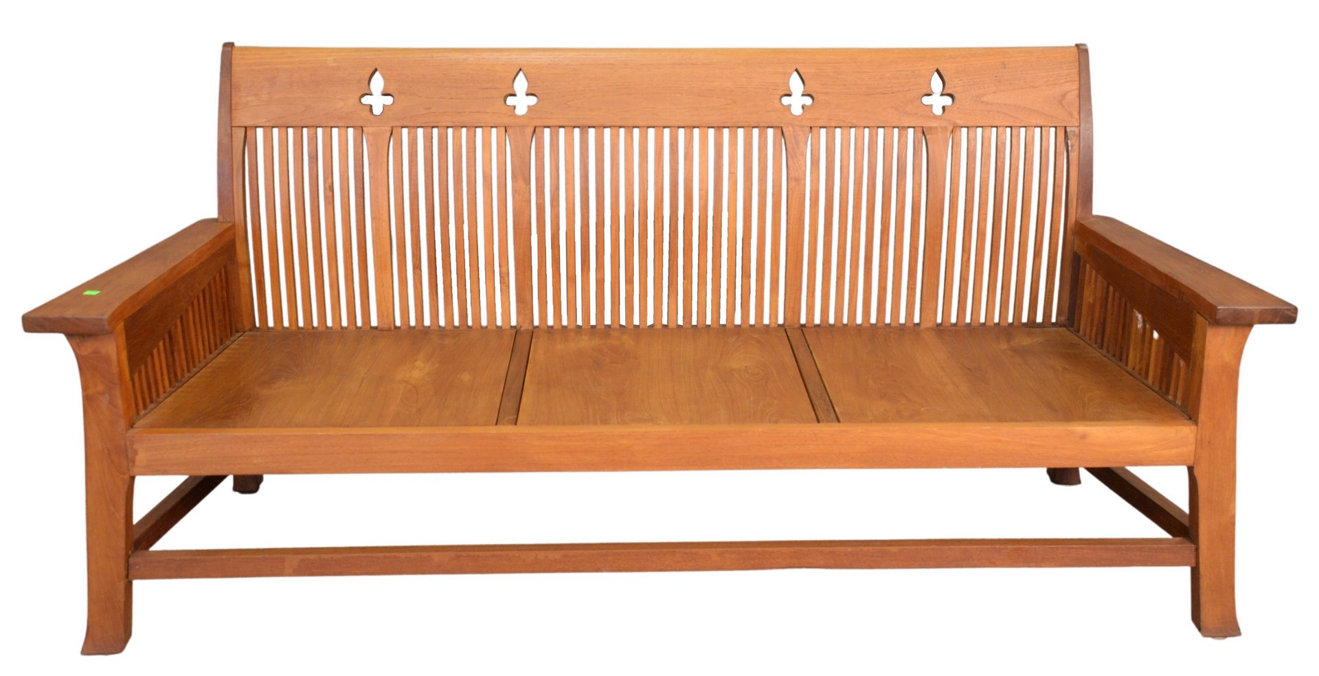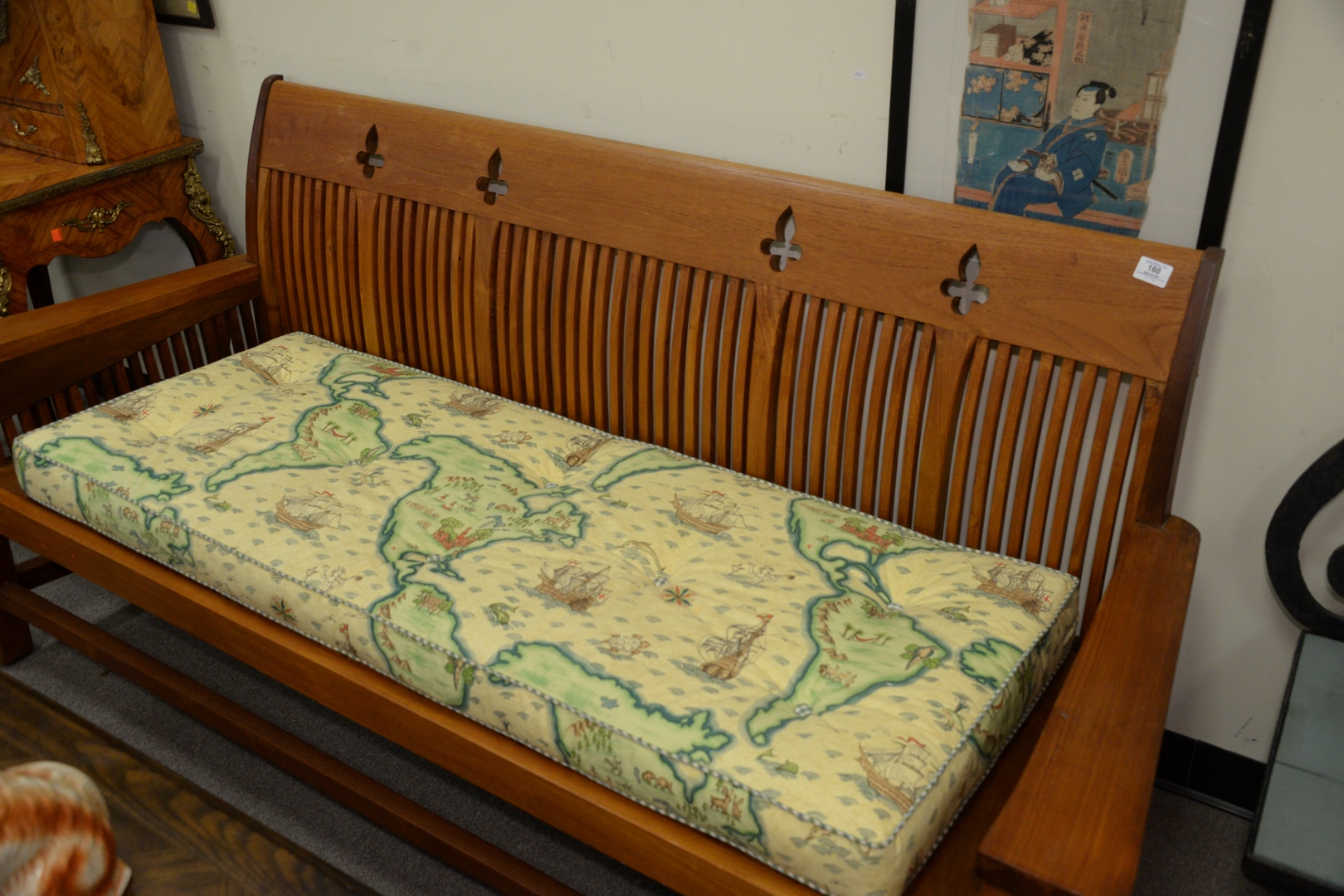 Teak Bench, having upholstered cushion, seat height 15 inches, length 75 inches.