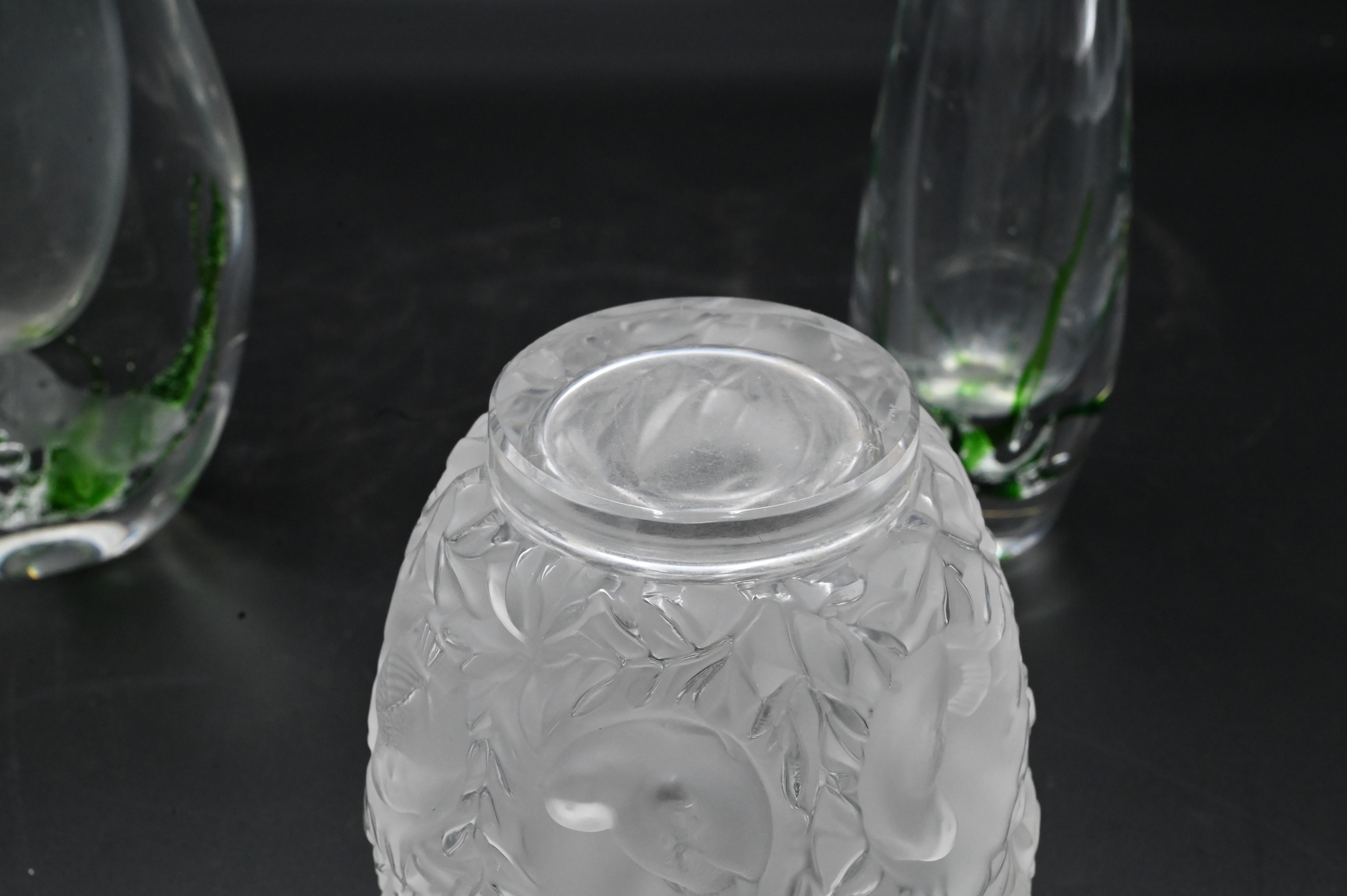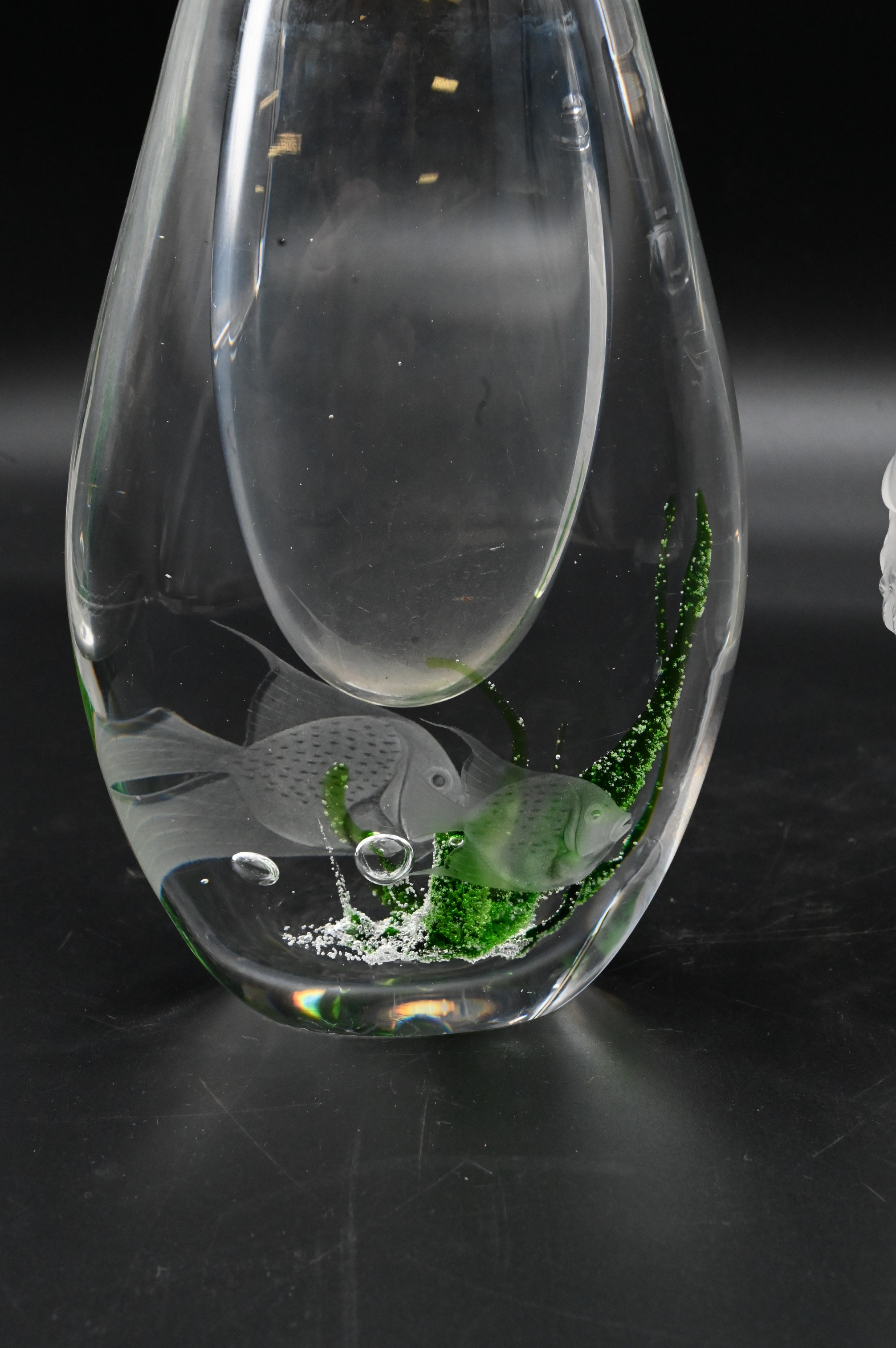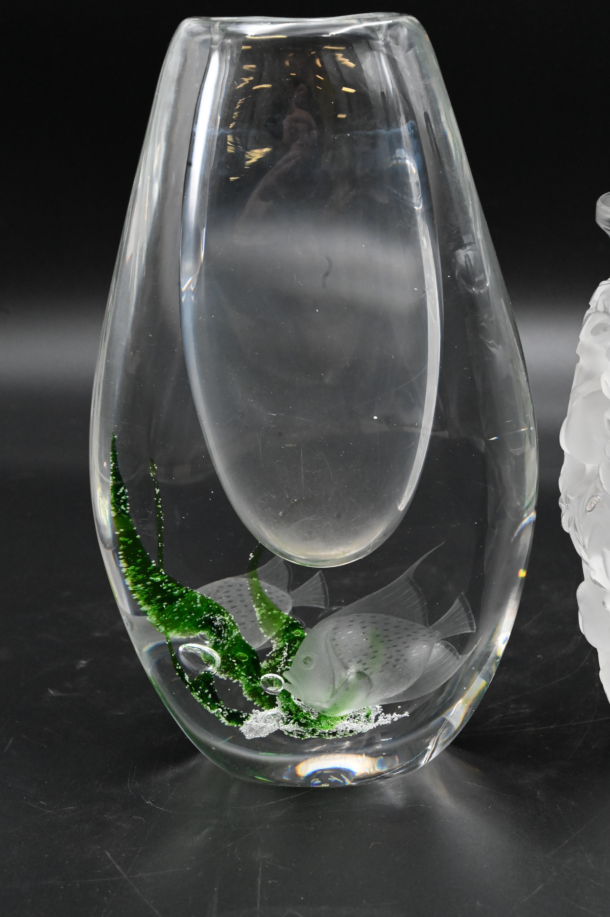 Three Art Glass Vases, to include a Lalique frosted bird vase, along with two Murano fish vases, tallest 9 1/2 inches.