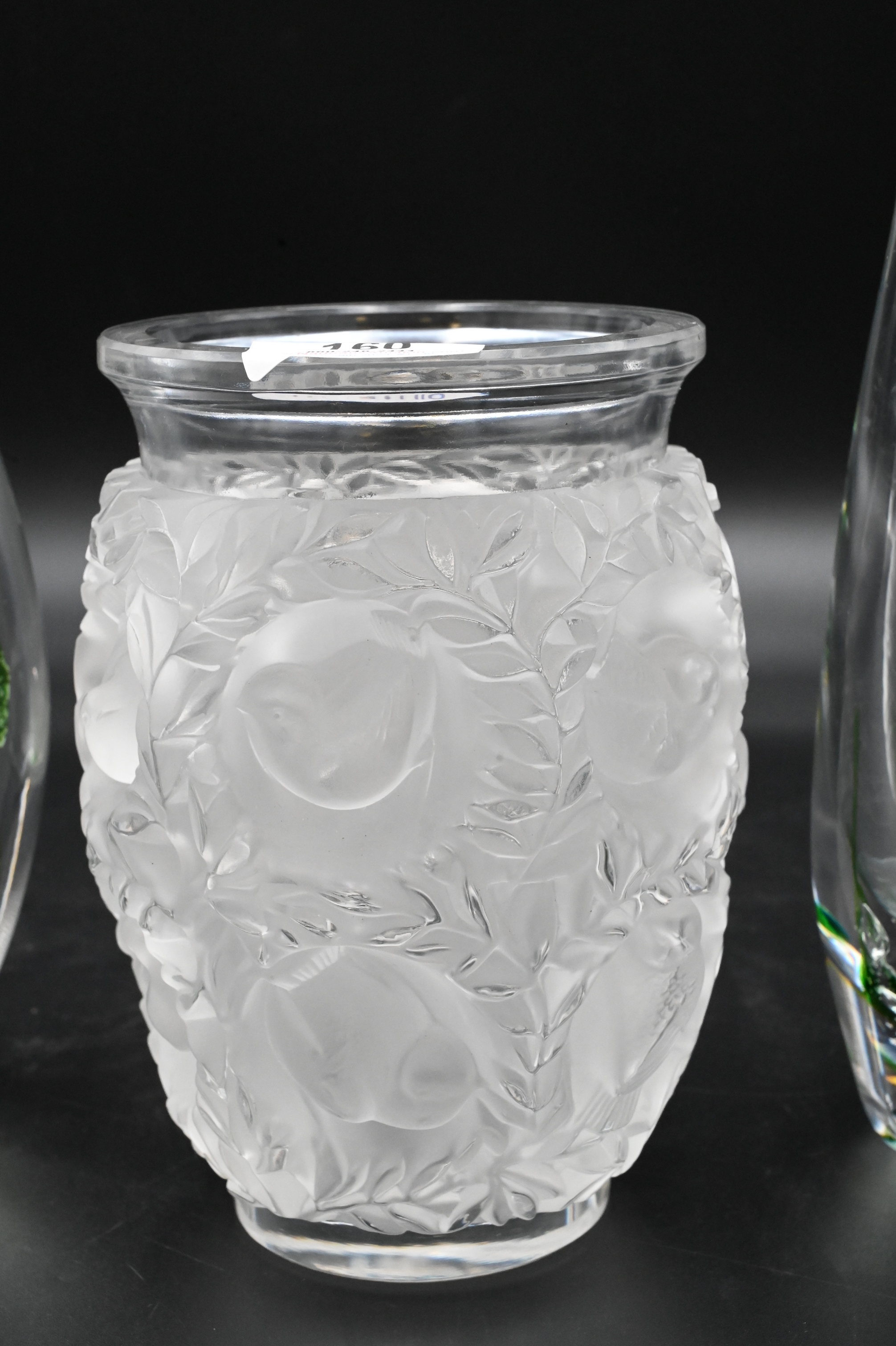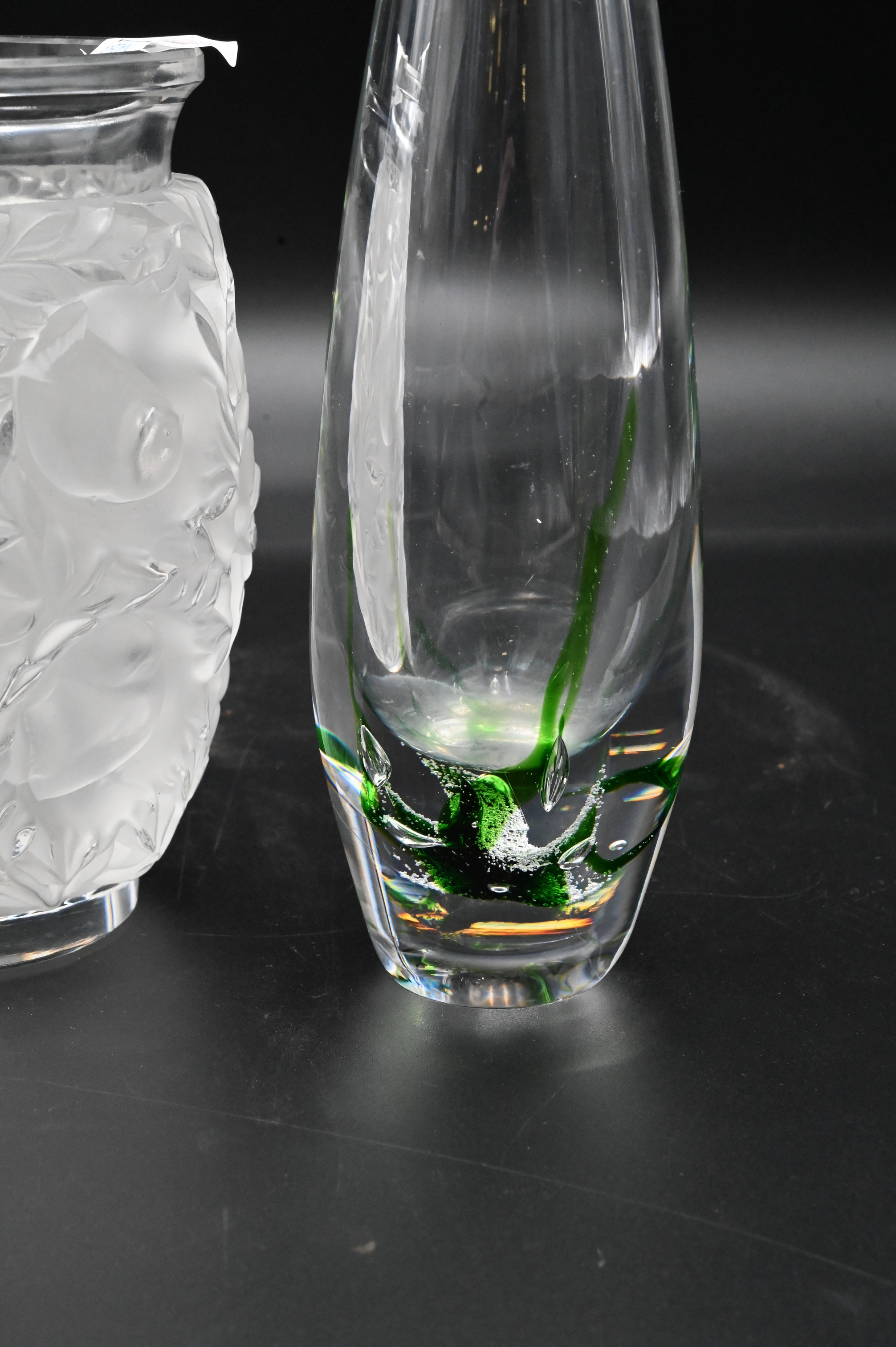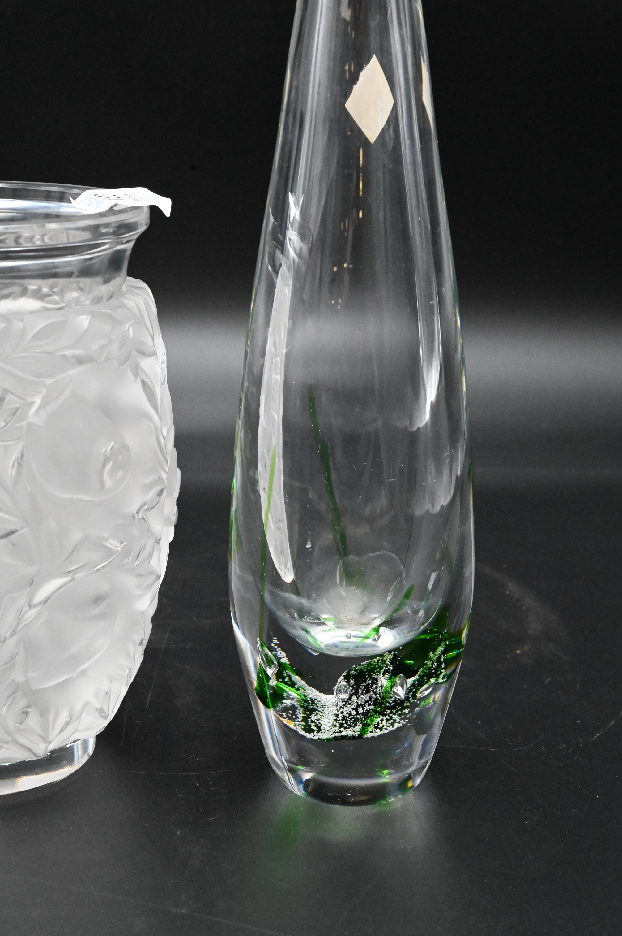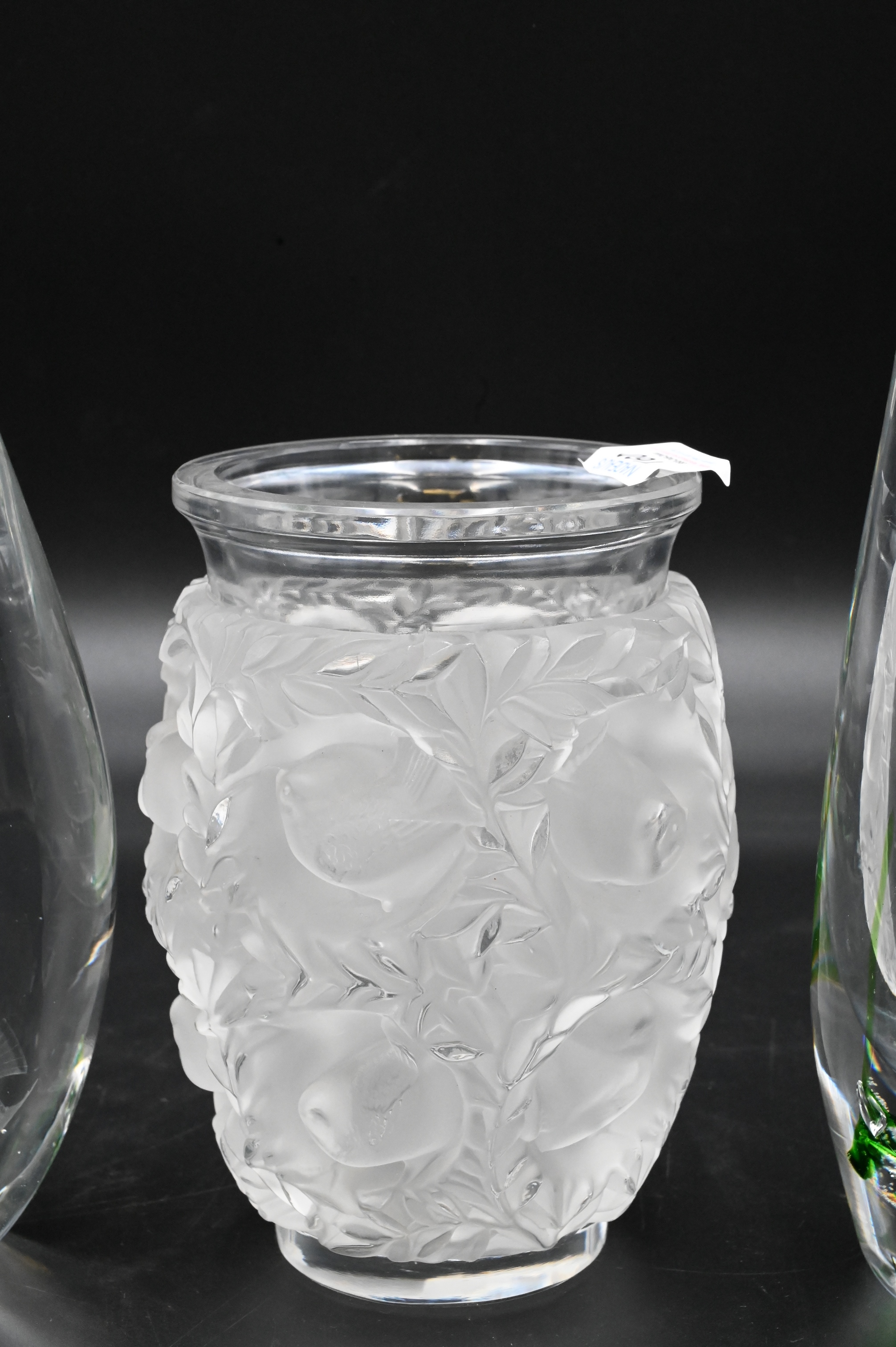 Three Art Glass Vases, to include a Lalique frosted bird vase, along with two Murano fish vases, tallest 9 1/2 inches.