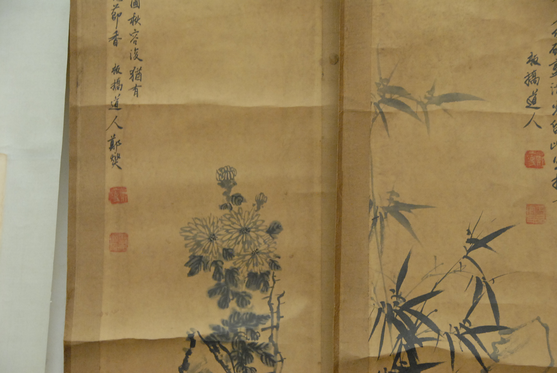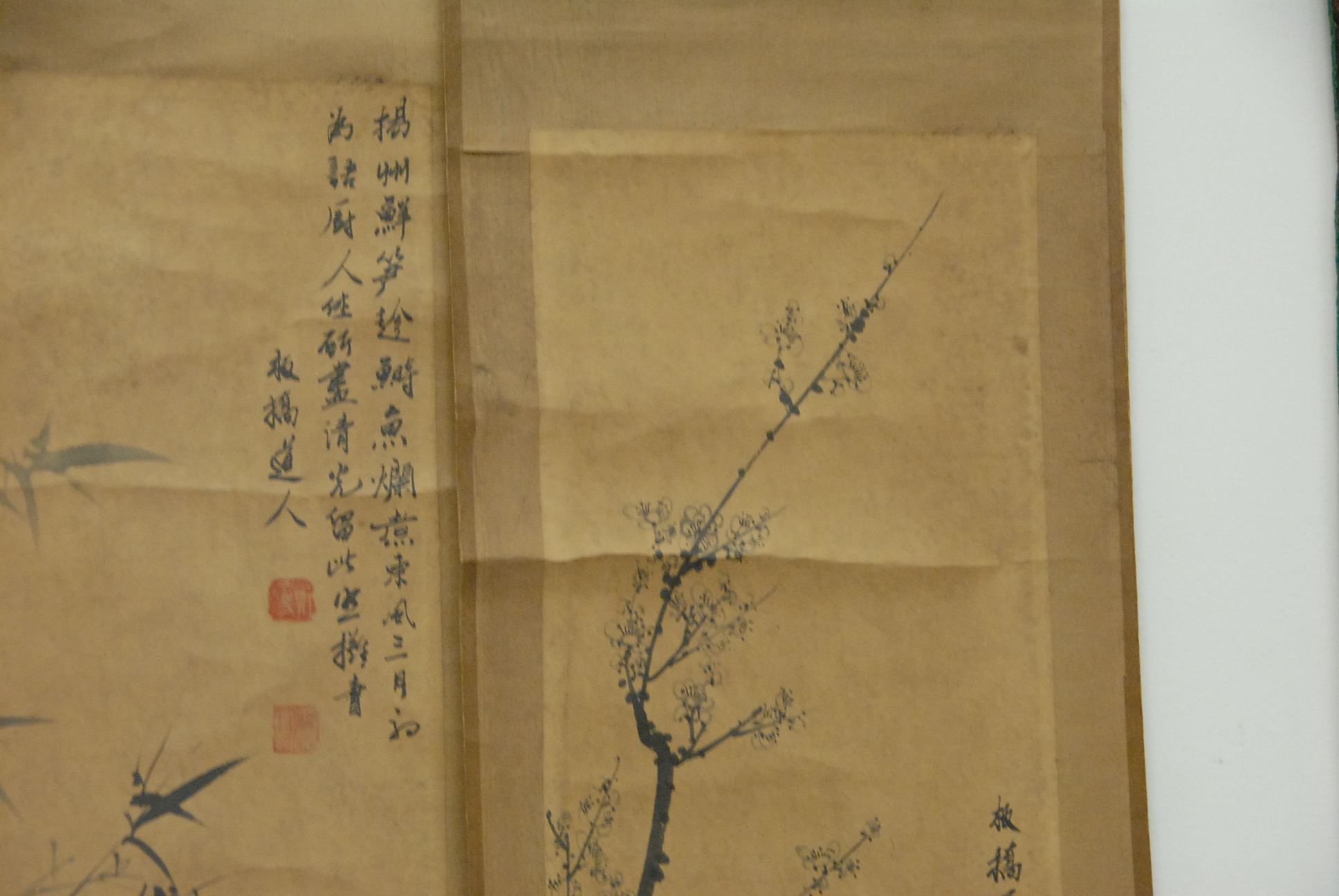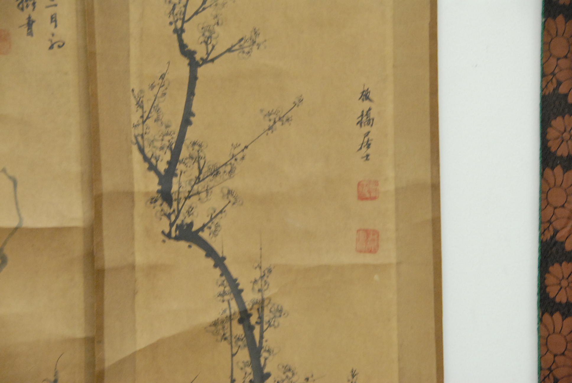 Three black and white watercolor on paper, blossoming apple tree, bamboo trees and wild flowers.