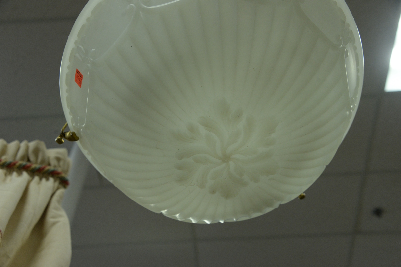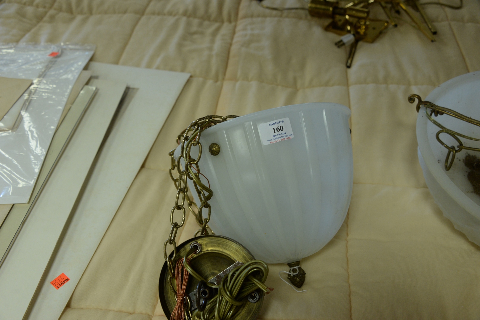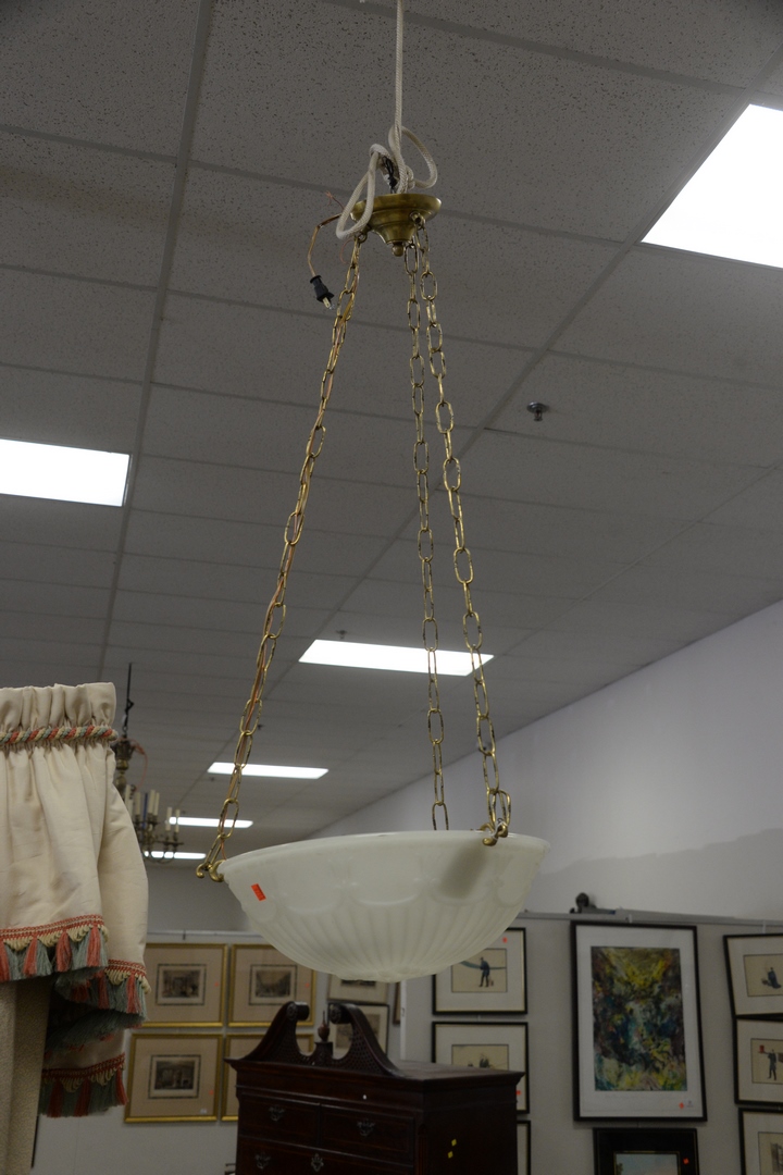 Lot 160: Three Hanging Lights, both having opaque glass dome with brass fittings, heights 9 inches and 5 1/2 inches.