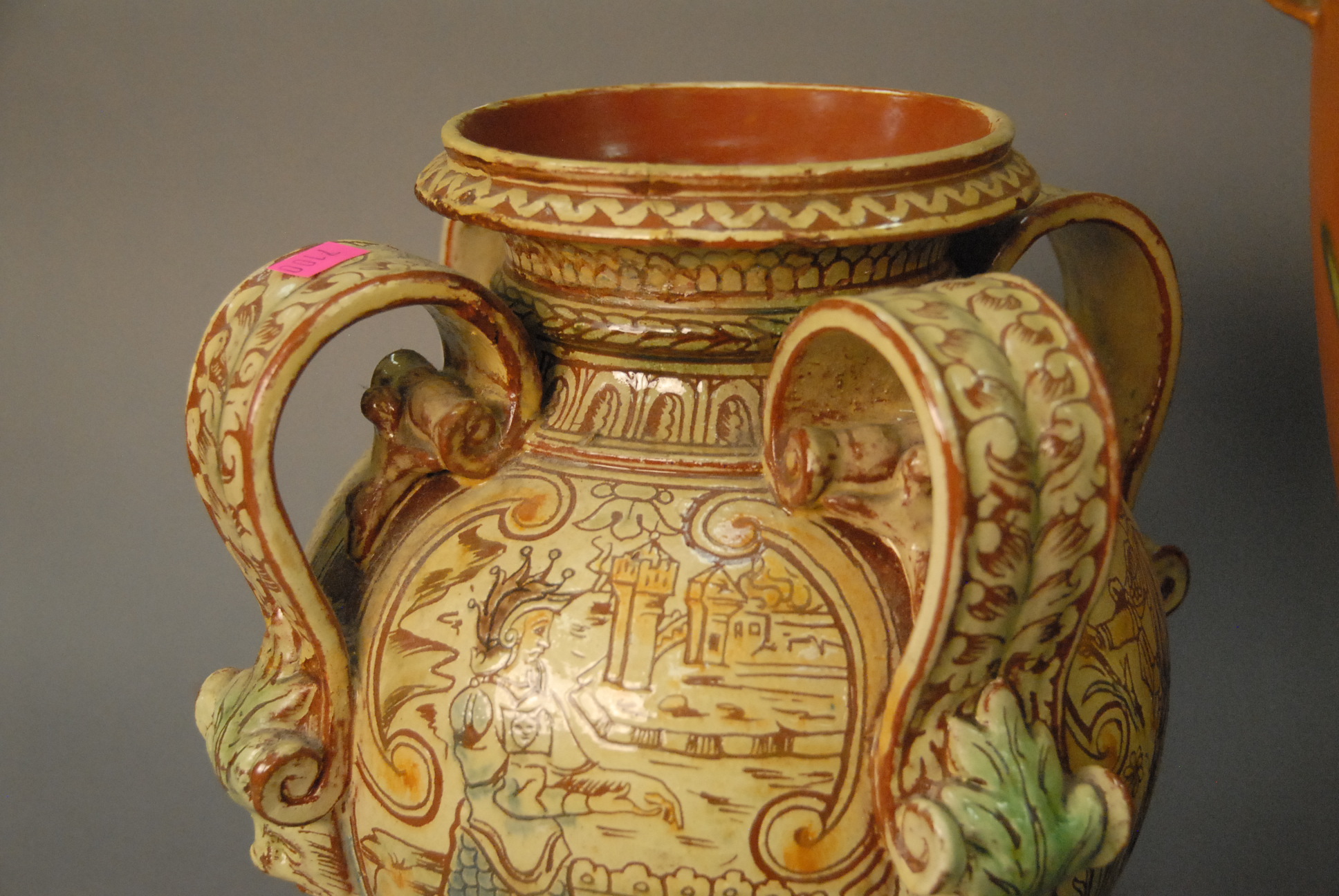 Lot 160: Three large vases including large Roseville vase ht. 16in., Demaray vase ht. 12in., and large pottery vase with handles ht. 12in.
