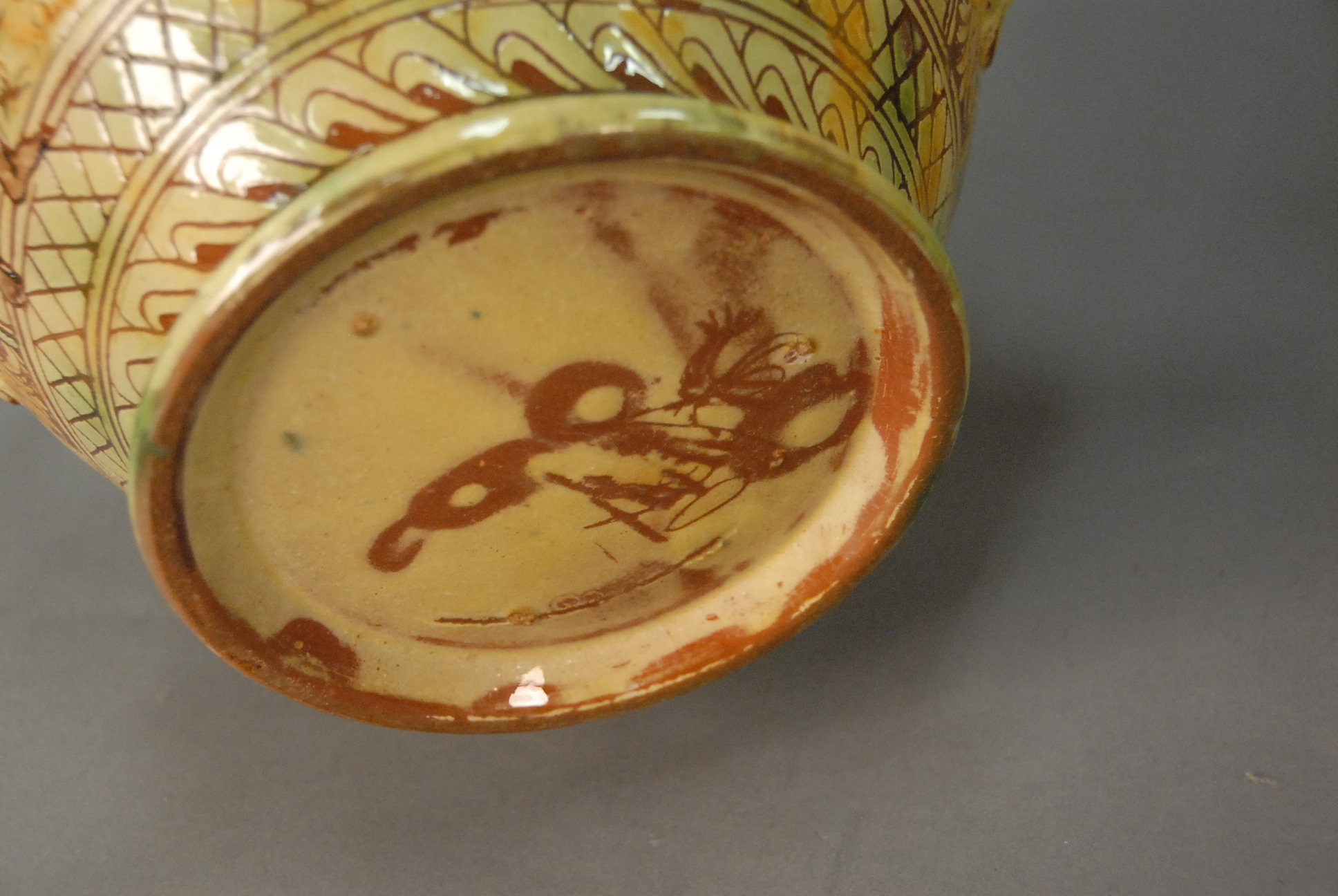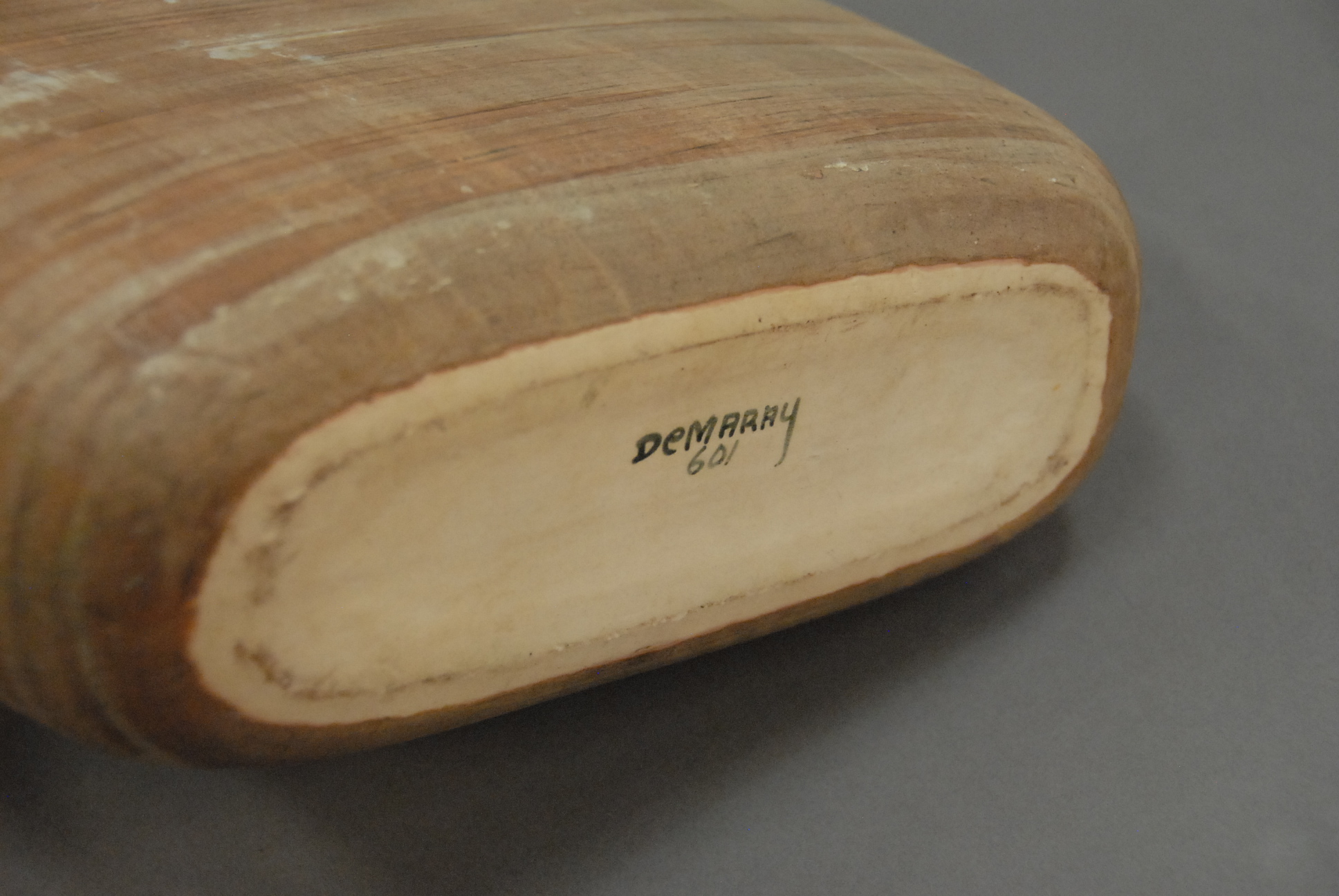 Three large vases including large Roseville vase ht. 16in., Demaray vase ht. 12in., and large pottery vase with handles ht. 12in.