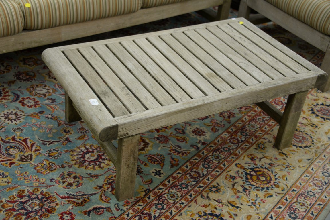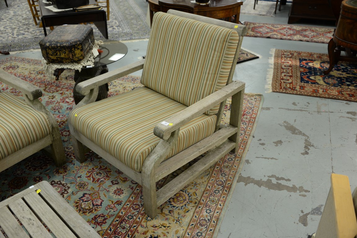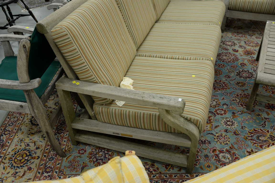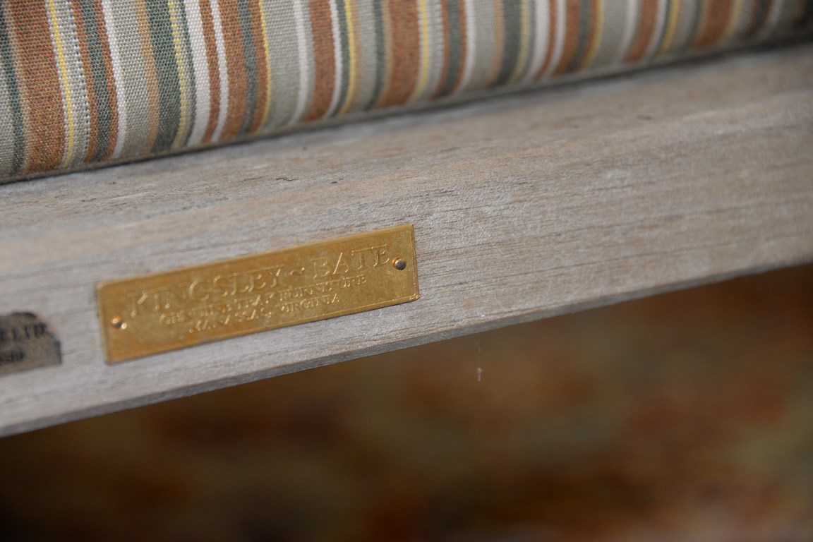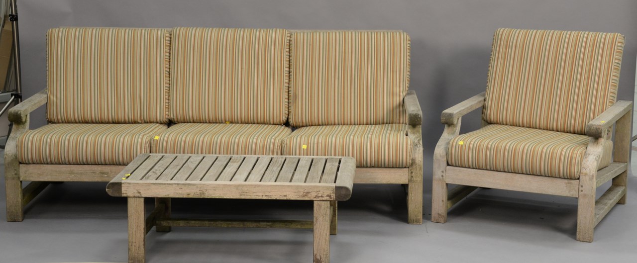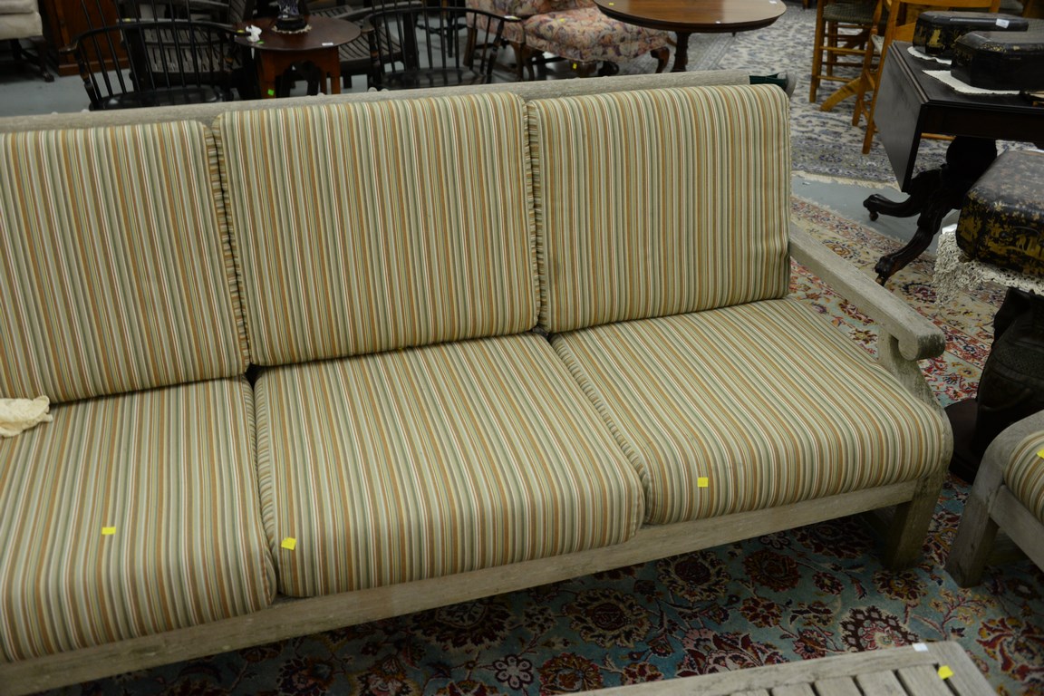 Lot 160: Three piece Kingsley-Bate sofa and armchair with cushions and a teak coffee table. sofa: wd. 80 in., table: ht. 15 in. top: 23 x 41