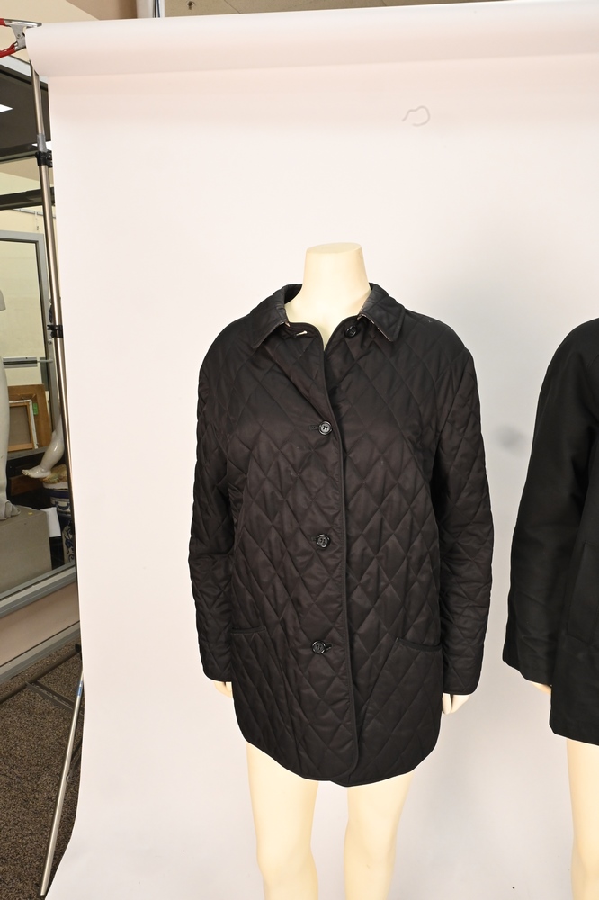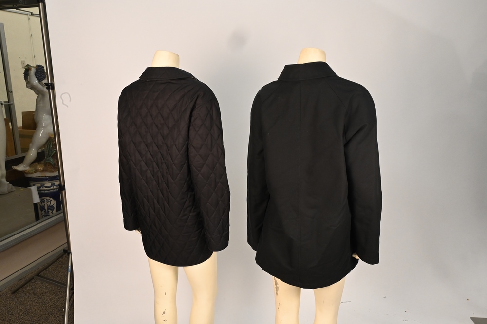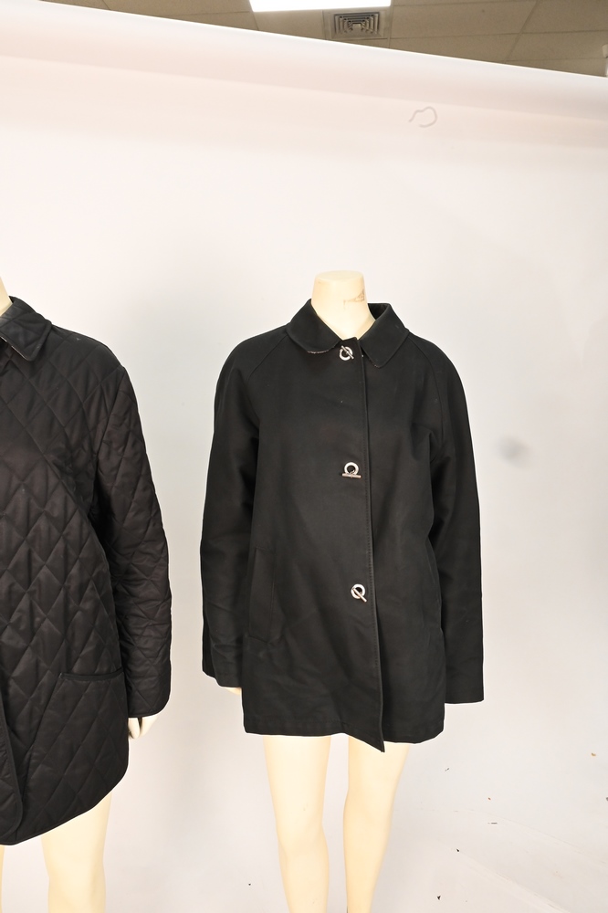 Lot 160: Two Burberry Coats, to include black quilted coat with classic plaid lining and black cotton coat with front toggle closure, both ha…