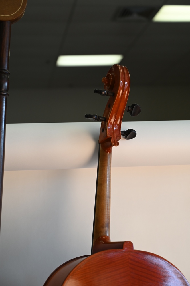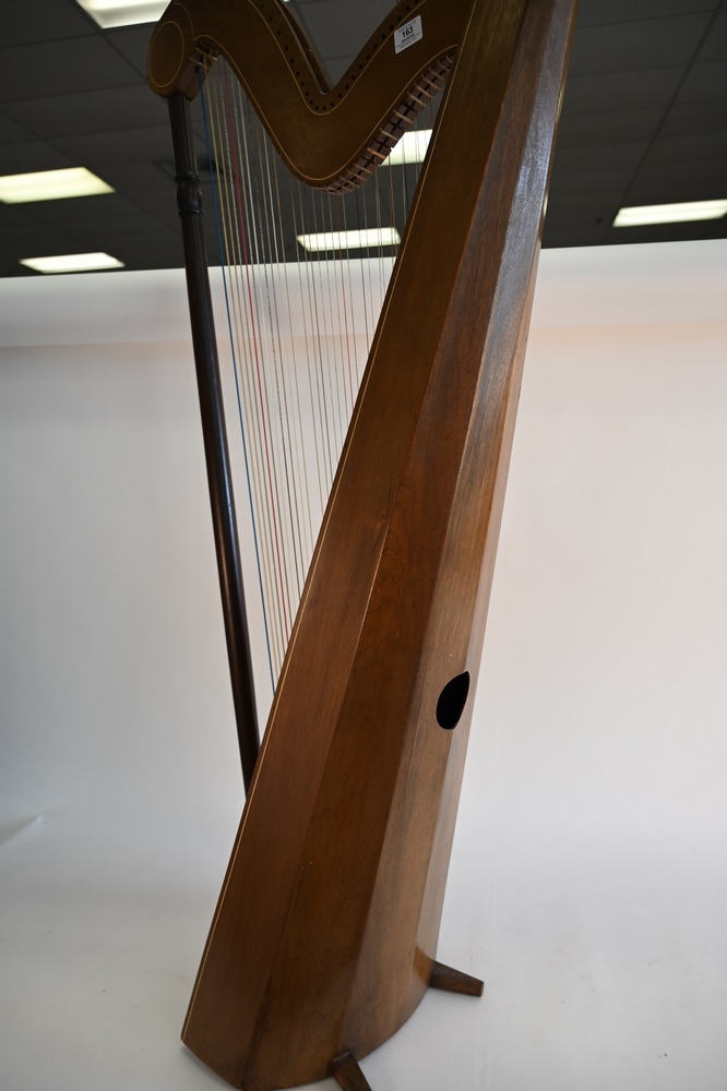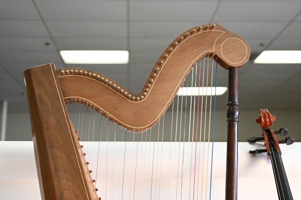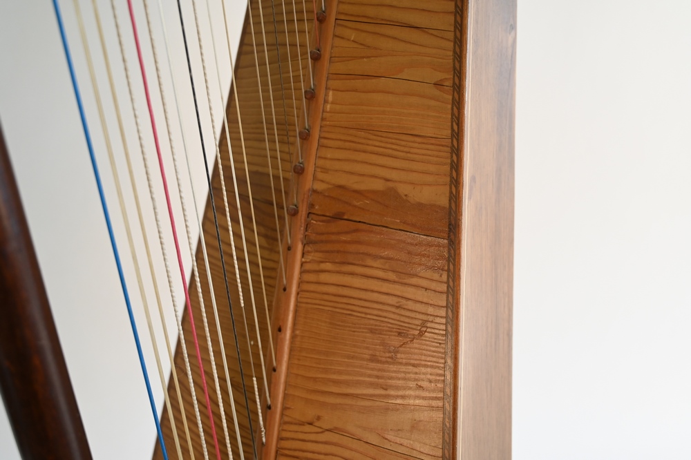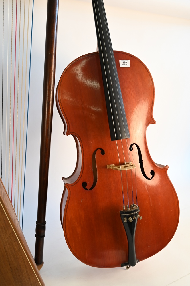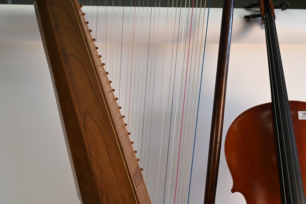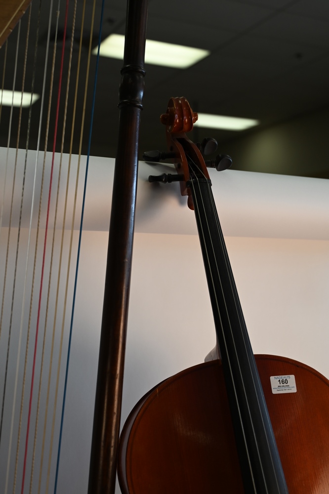 Lot 160: Two Piece Lot, to include a full size German cello, Wilhelm Eberle 4/4 cello, good condition, with bow, no case; along with a Celtic harp, 36 string, cracks to soundboard.