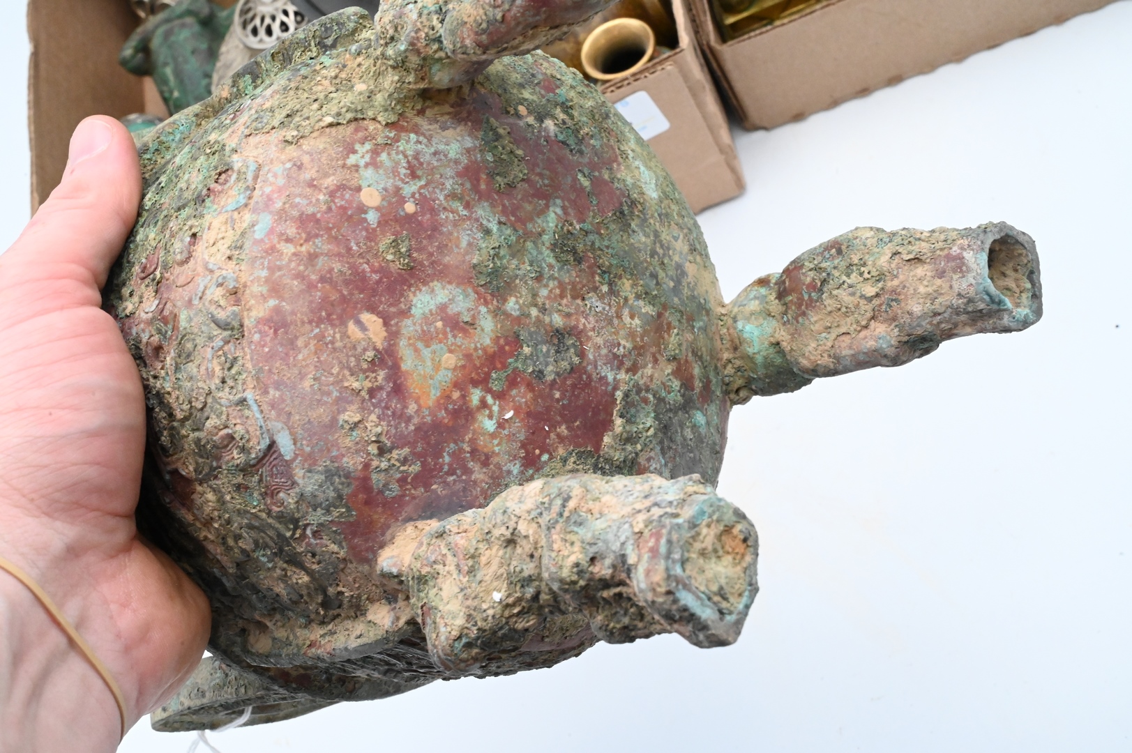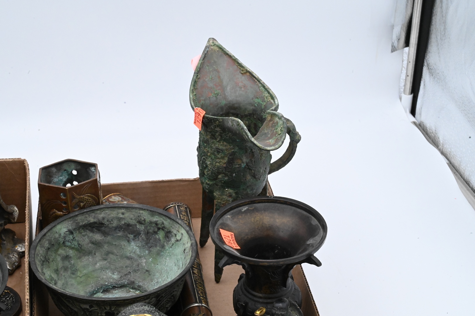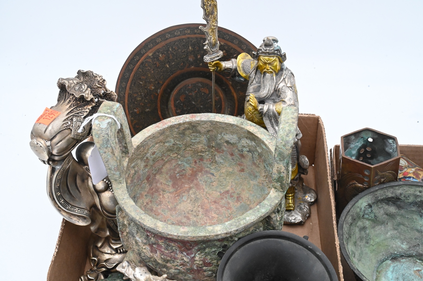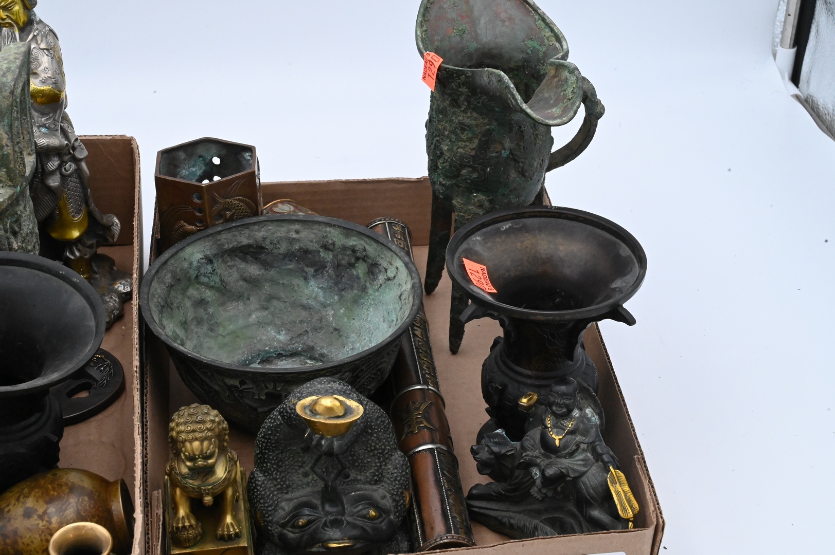 Two Tray Lots of Bronze and Brass Metal Items, to include silvered Buddha, archaic style wine cup figures, etc.
