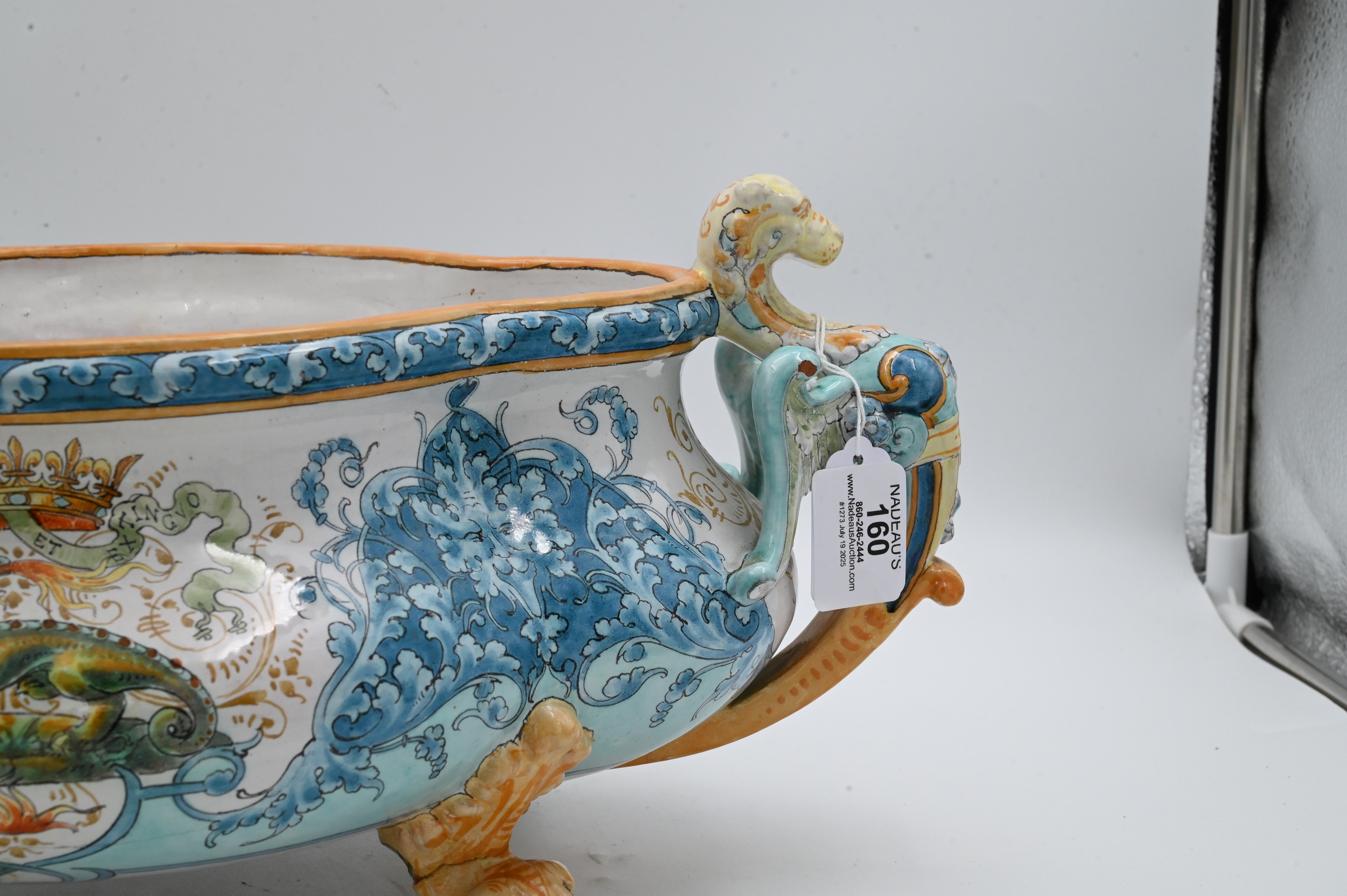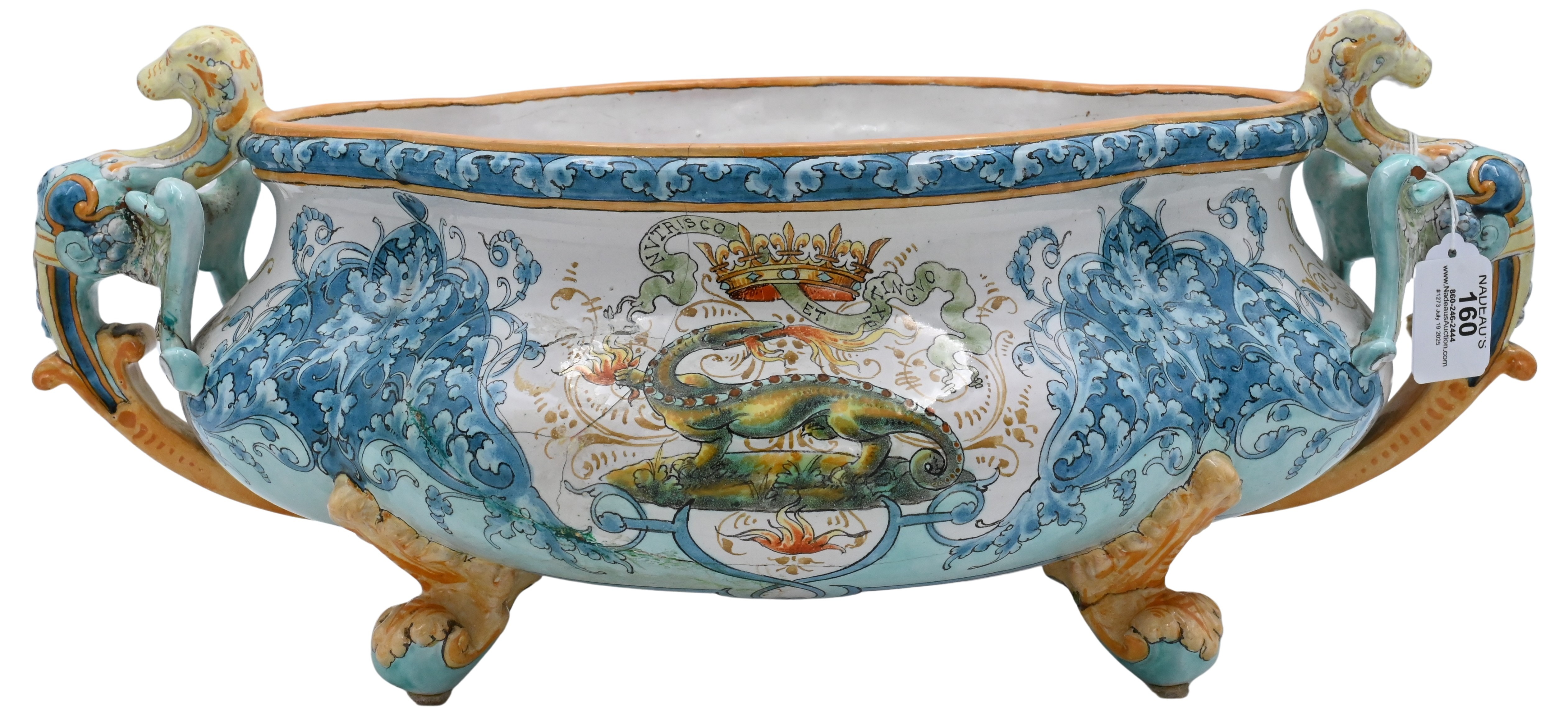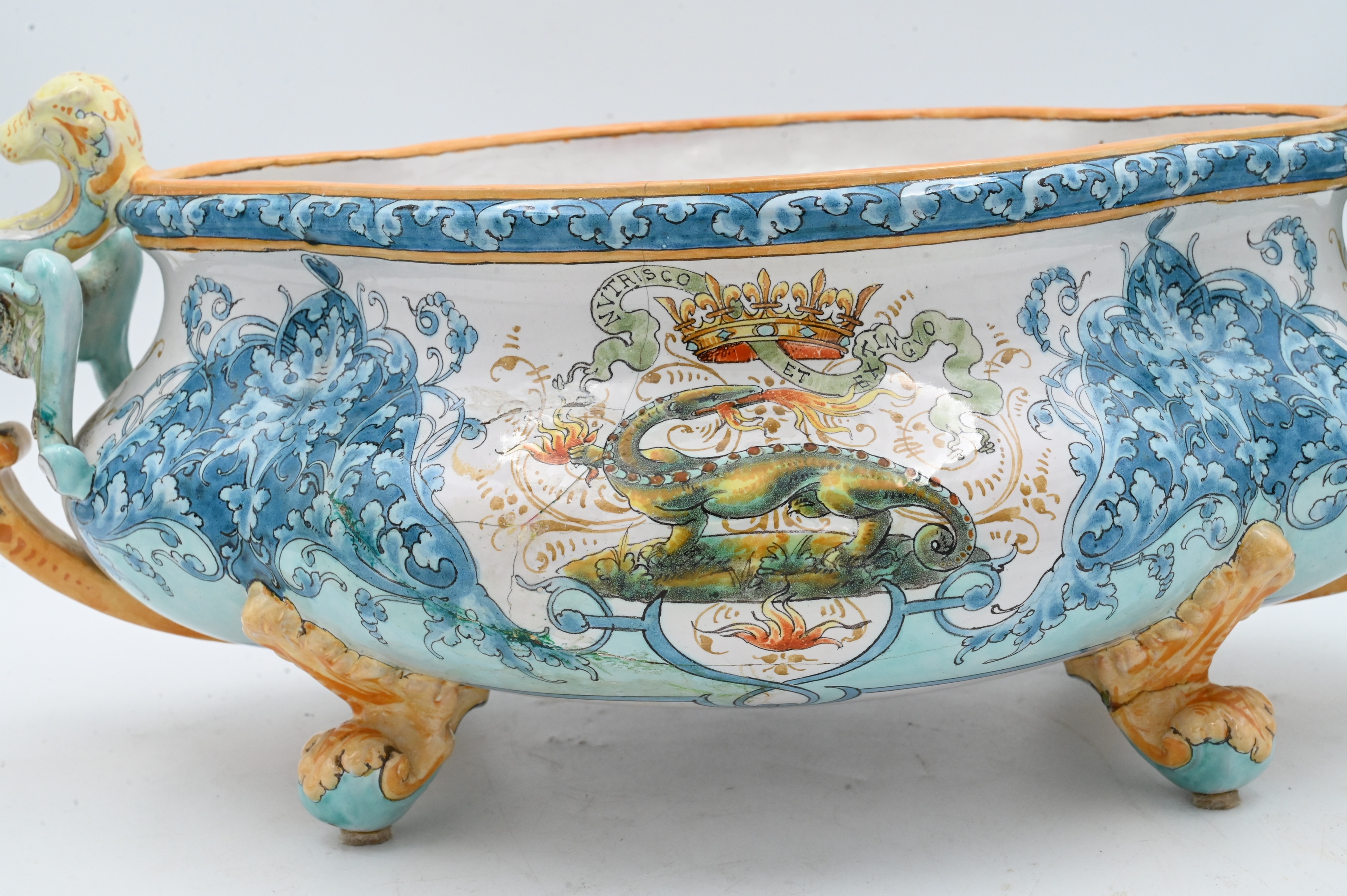 featuring a handpainted central dragon and coat of arms flanked by two dragon handles over claw ball feet, signed on underside
