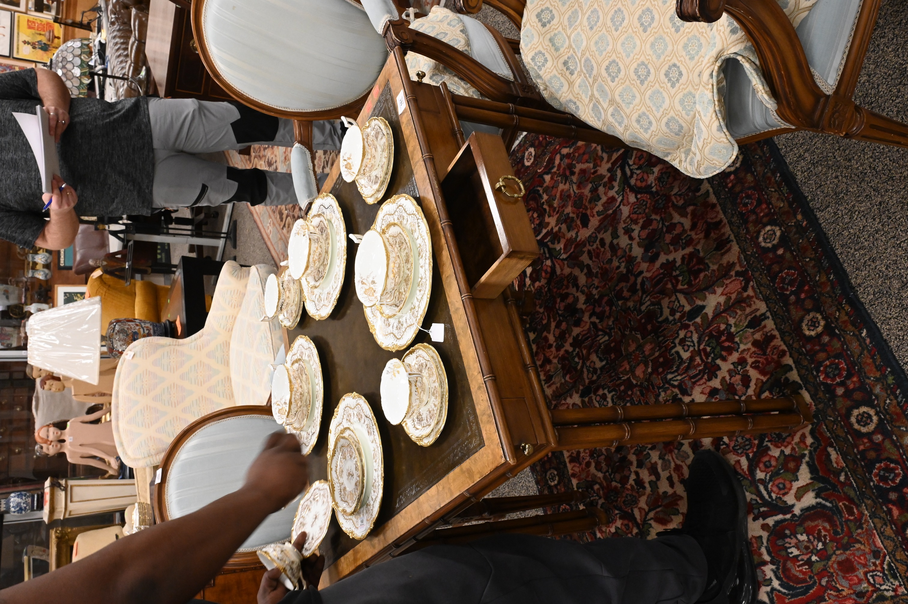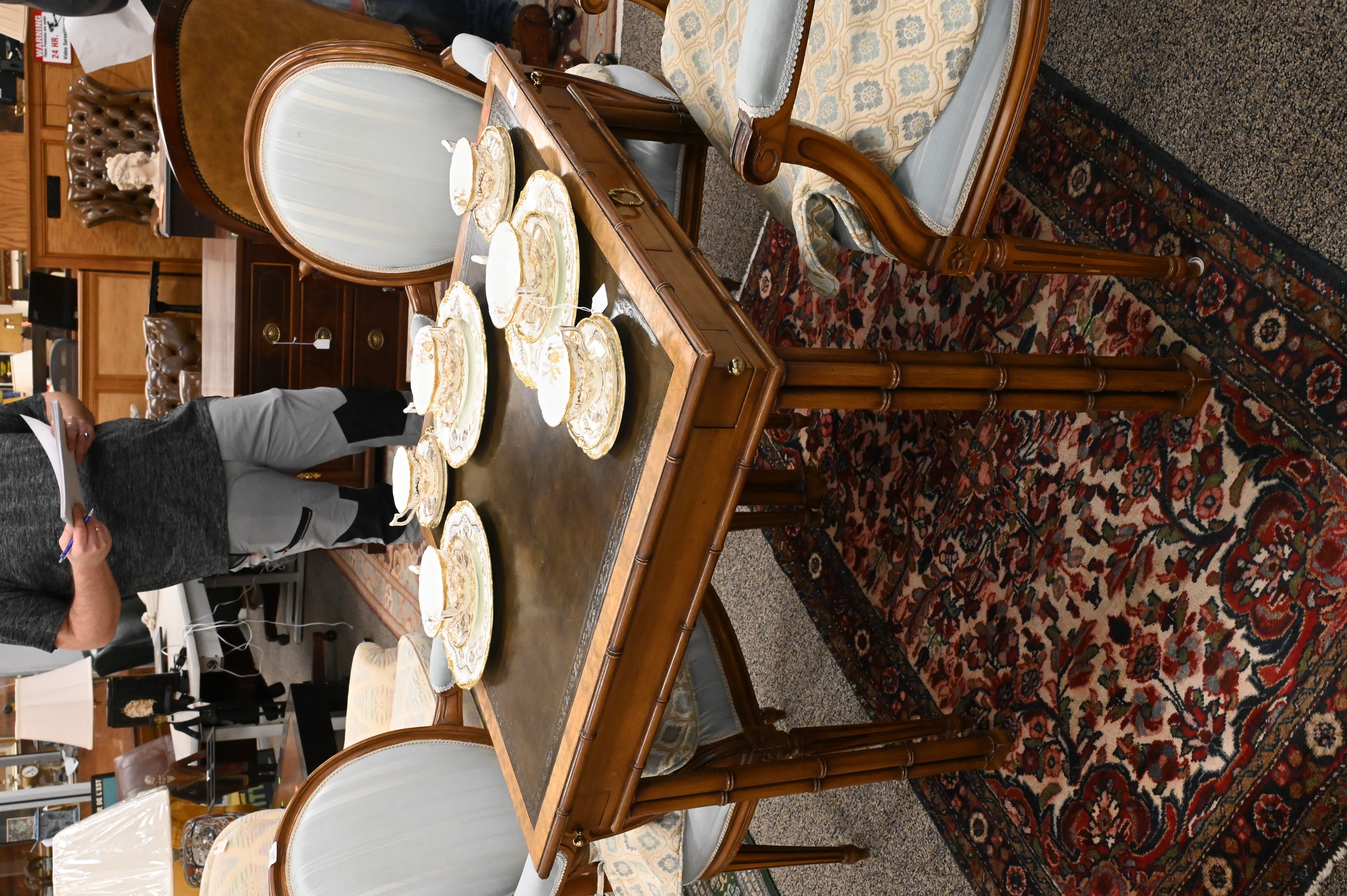 having inset tooled leather top, four corner drawers, one center drawer all set on faux bamboo legs