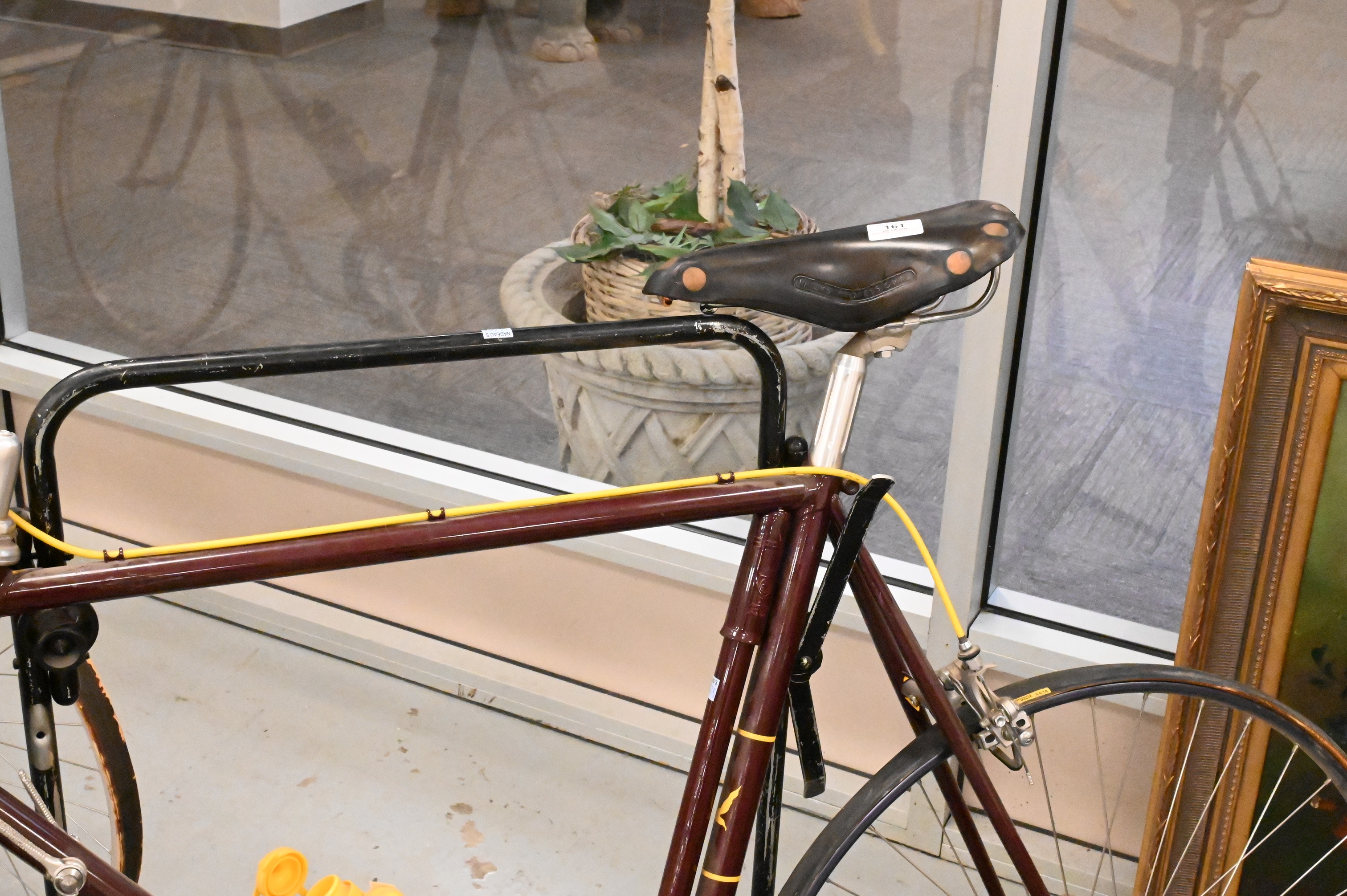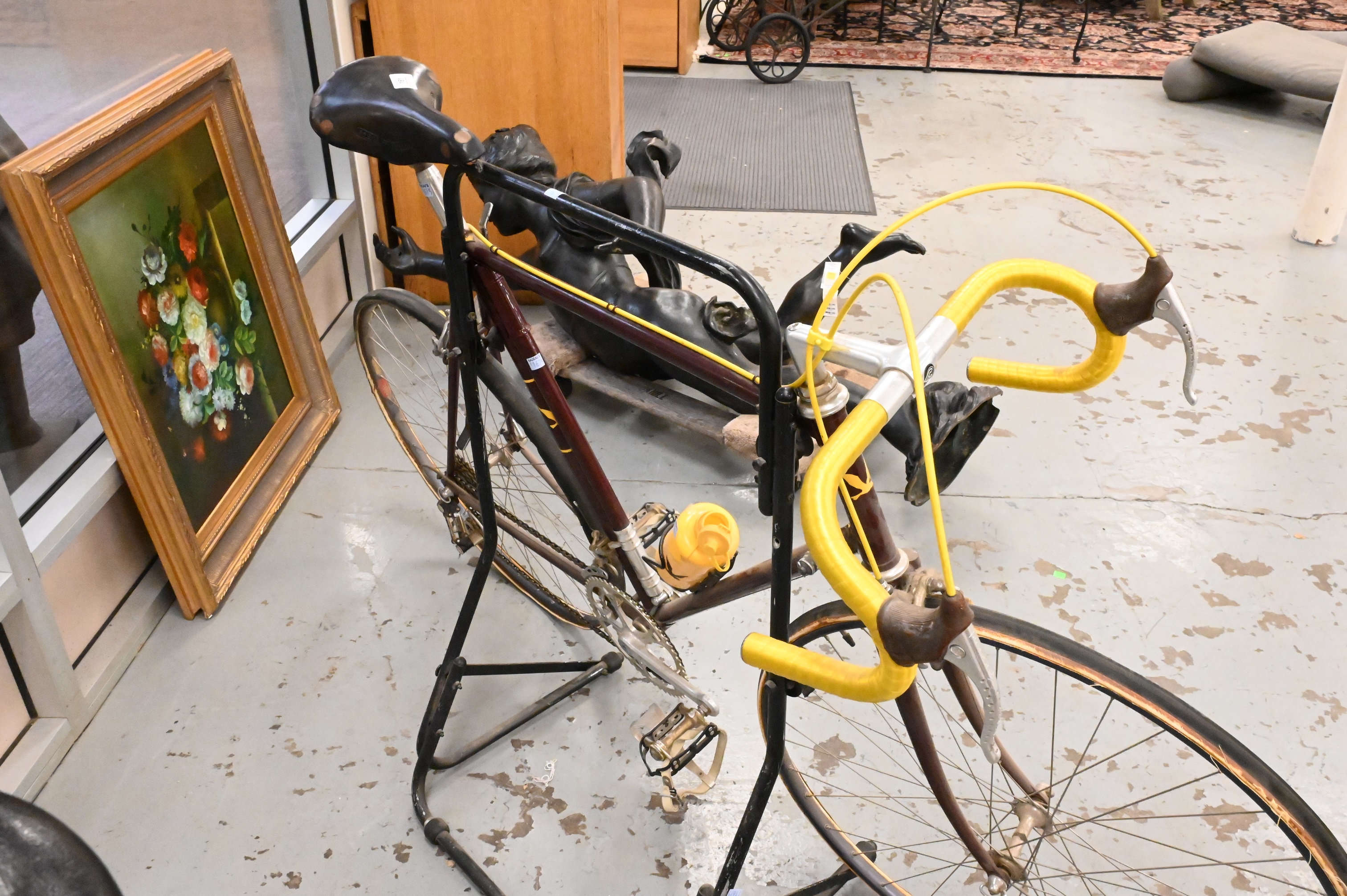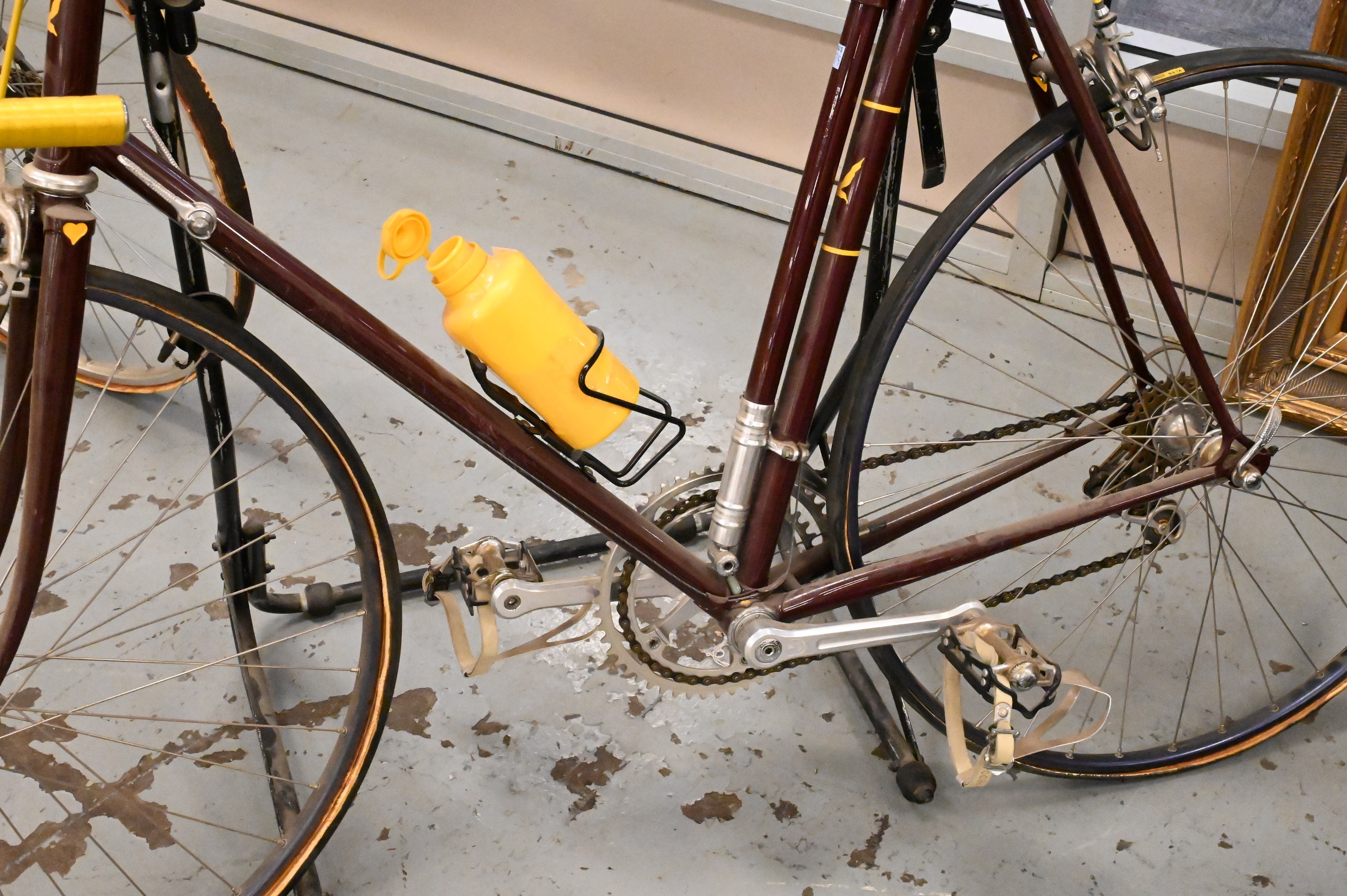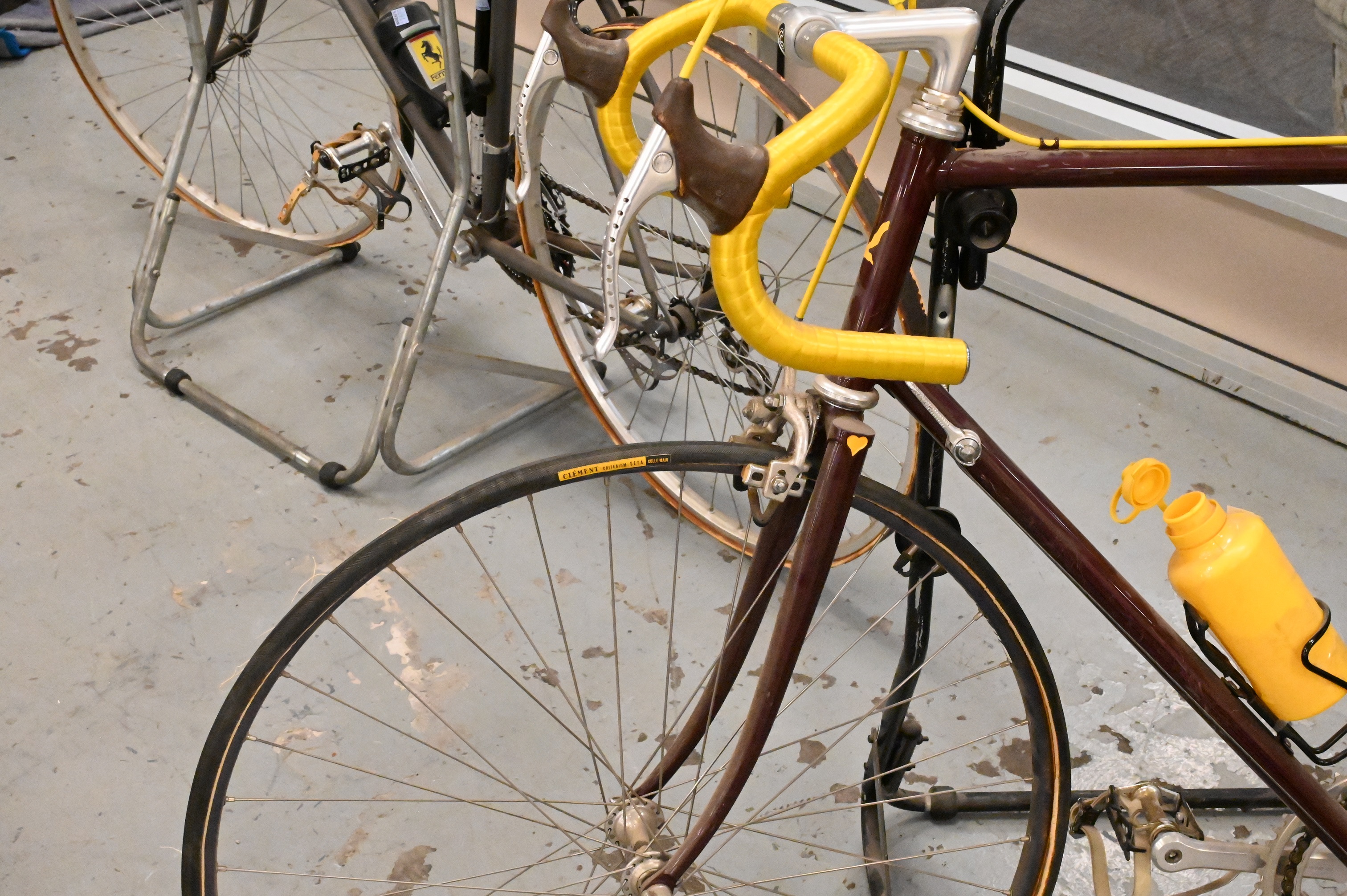 Cinelli Giro D’Italia 10 Speed Bicycle, having red and yellow paint, flat tires, as is, matching tire pumps, Campagnolo gear, Brooks seat, signed Cinelli Giro.