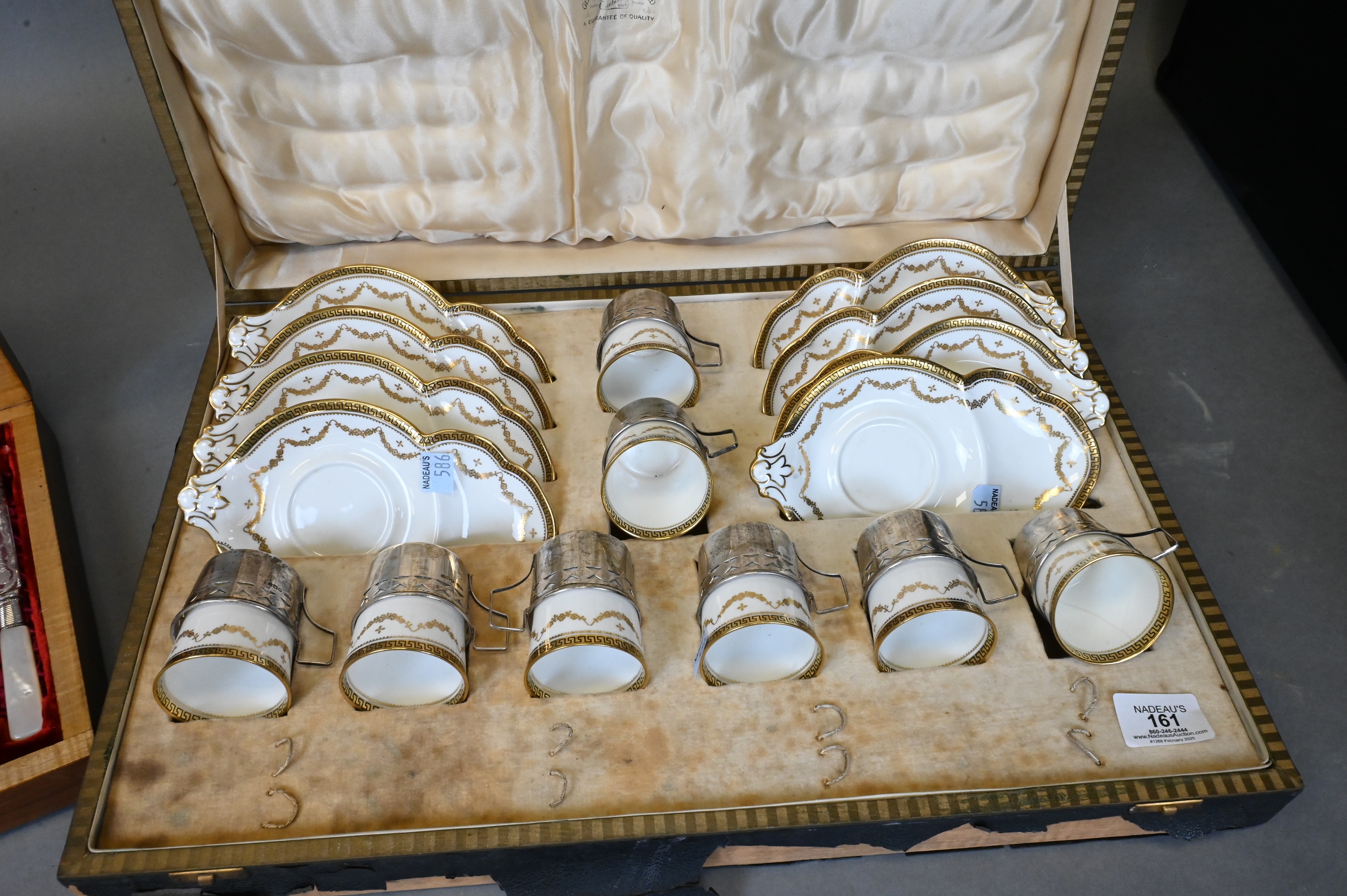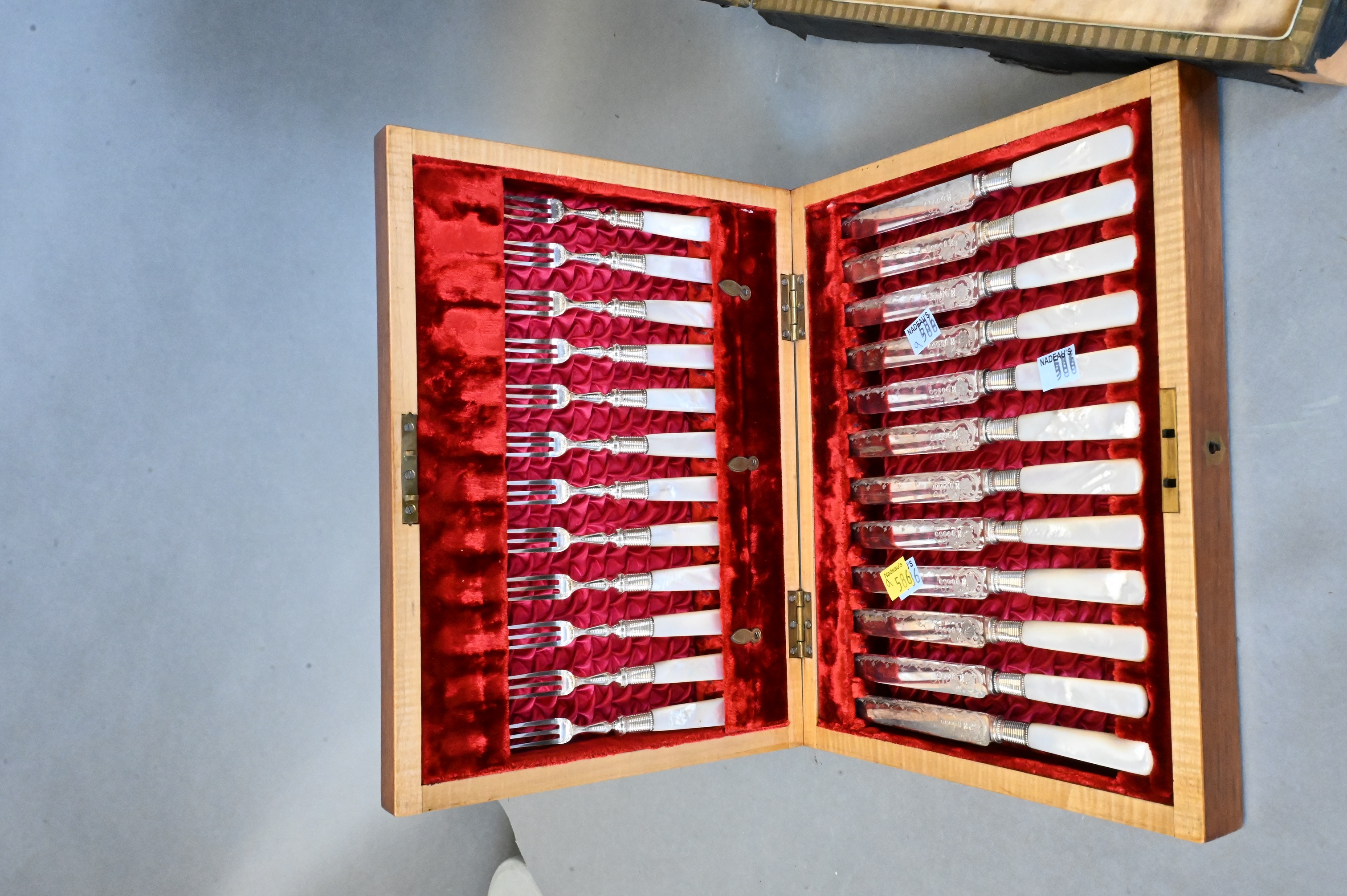 cups having sterling liners and 24 piece mother of pearl fork and knife fish set, each in fitted boxes