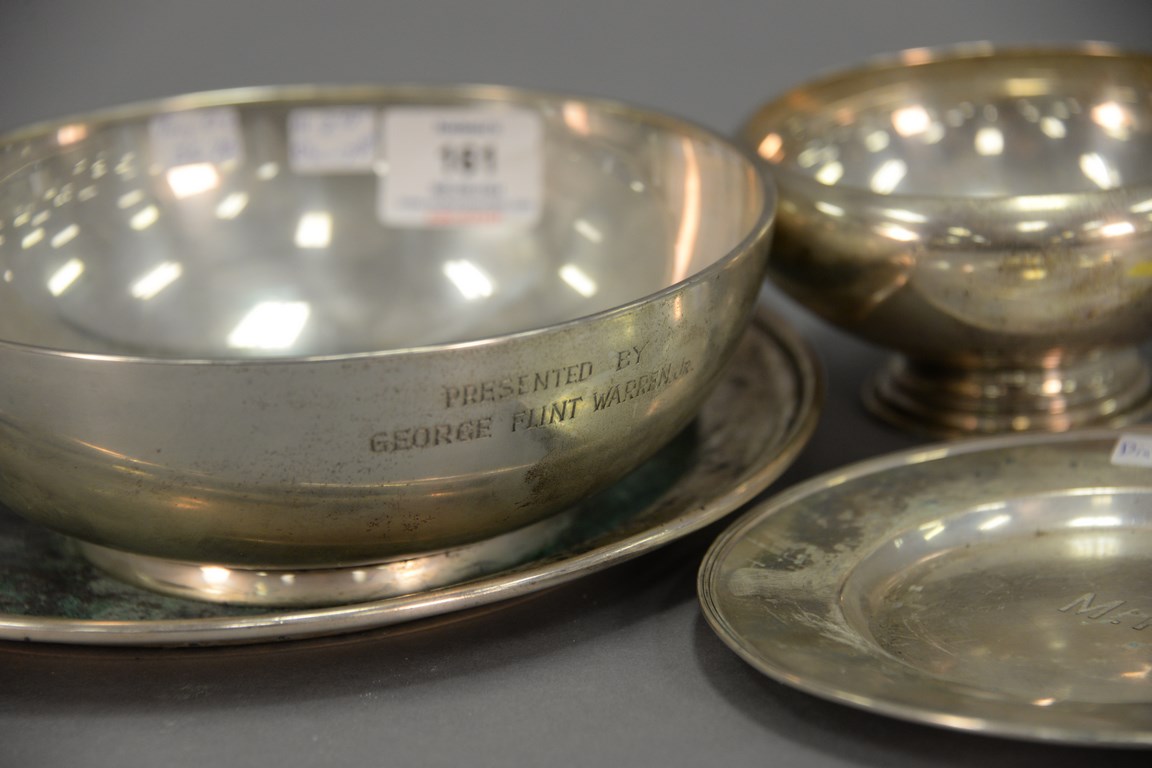 Lot 161: Four piece sterling silver lot to include two plates dia. 10 in. and 6 1/2 in. and two bowls 7 1/2 in. and 5 in., 36.7 t oz.