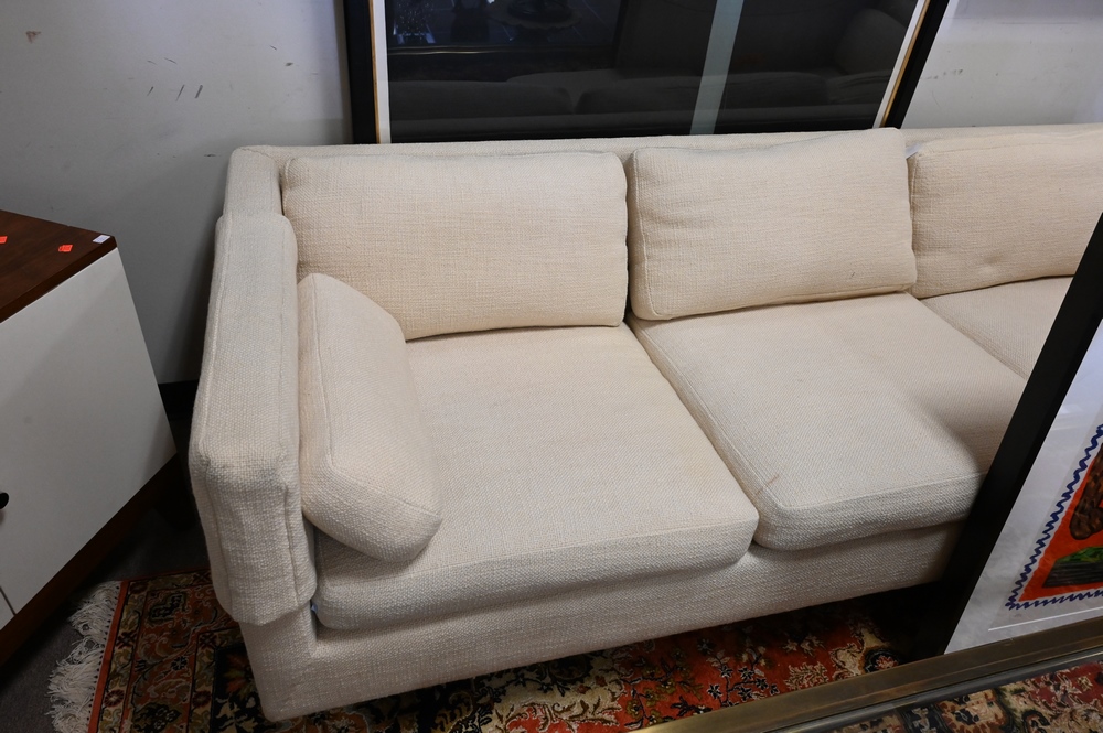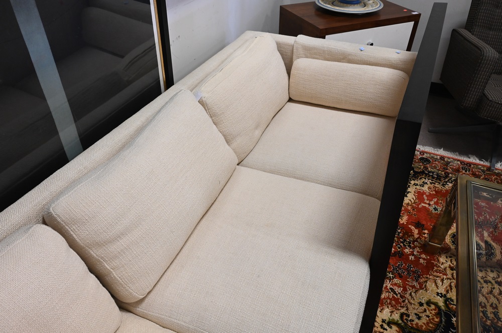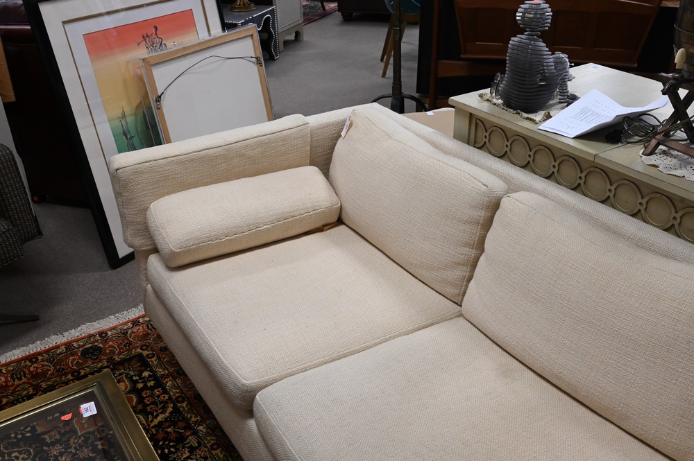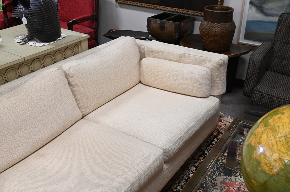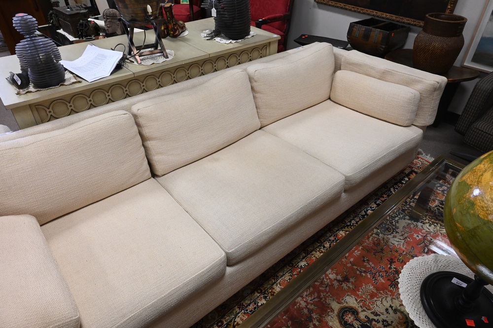 Lot 161: Pair of Harvey Probber Tuxedo Sofas, having Harvey Probber label on decking, stamped on tag 1970, height 27 inches, width 84 inches, depth 33 inches.