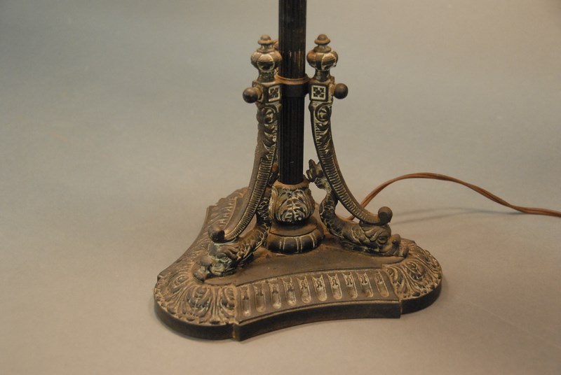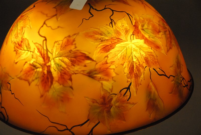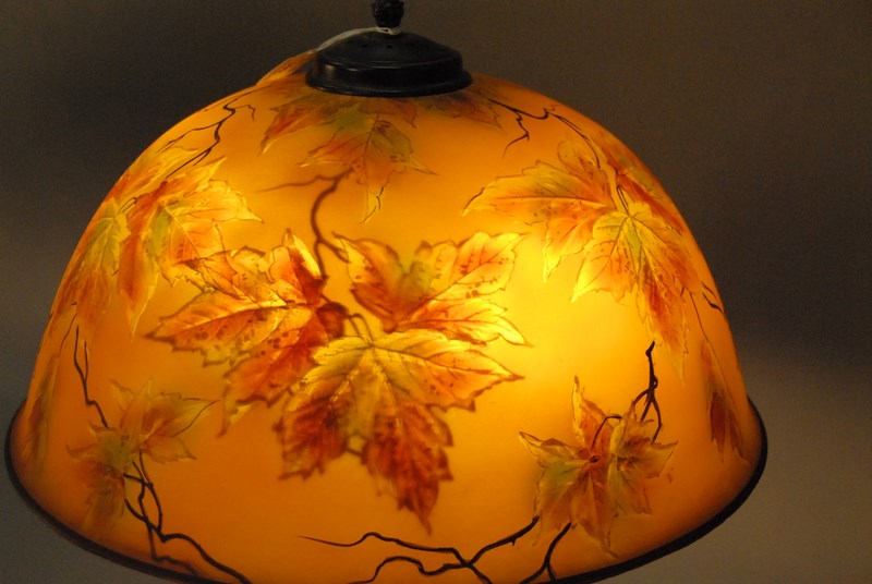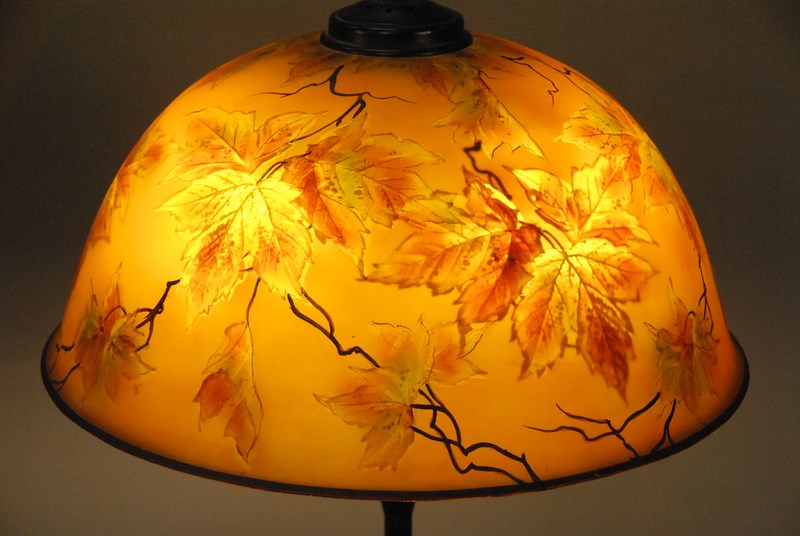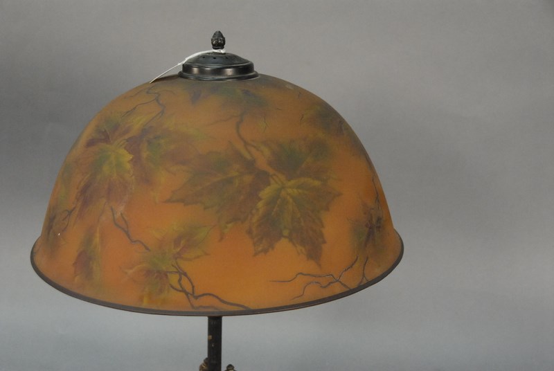 Lot 161: Pittsburgh reverse painted maple leaf table lamp having reverse and obverse painted shade base with three dolphins on triangle foot. shade dia. 17 1/2in.