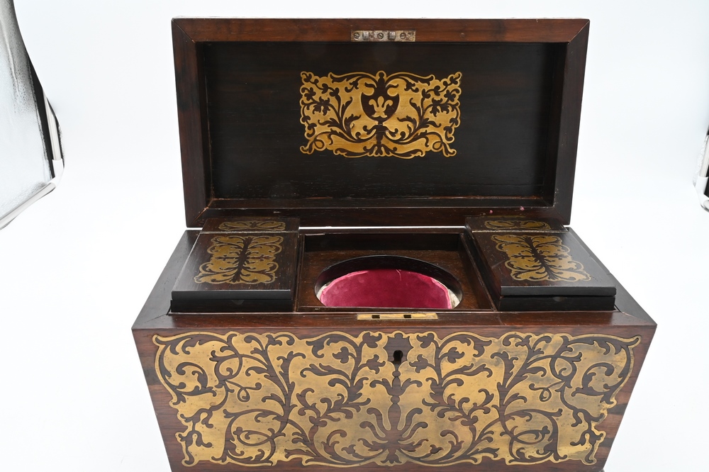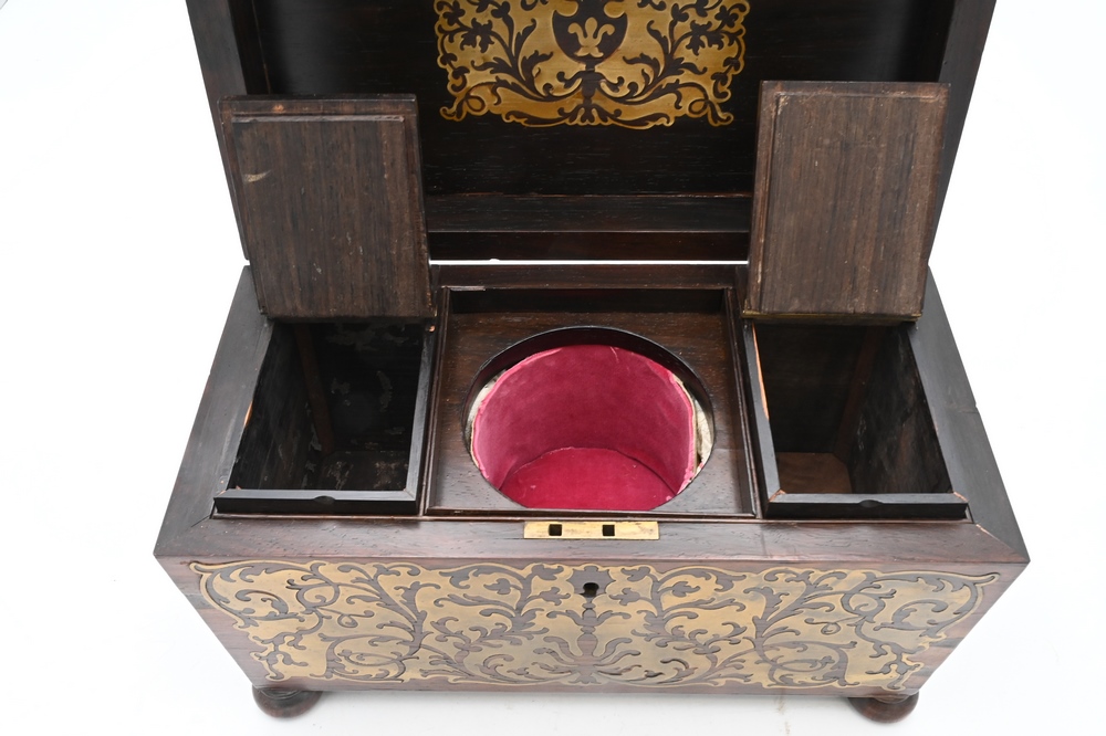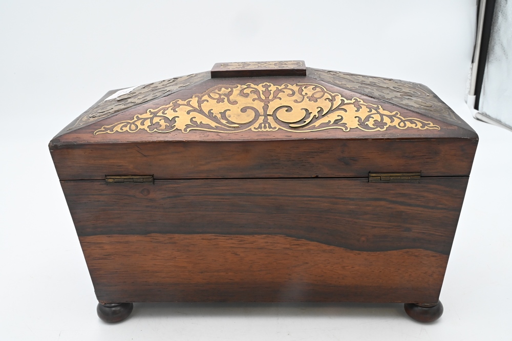 Lot 161: Regency Rosewood and Brass Inlaid Tea Caddy, having sarcophagus form, opening to two lidded compartments flanking fitted center for glass bowl, on ball feet, height 8 1/2 inches, width 13 inches.
