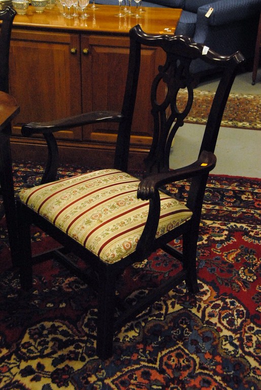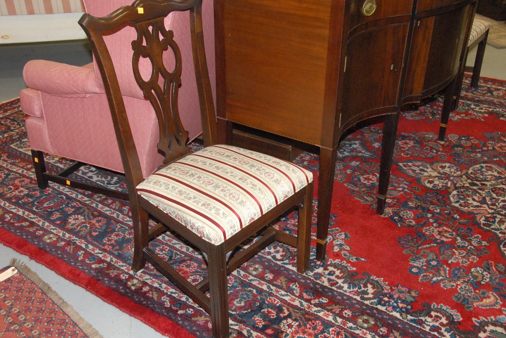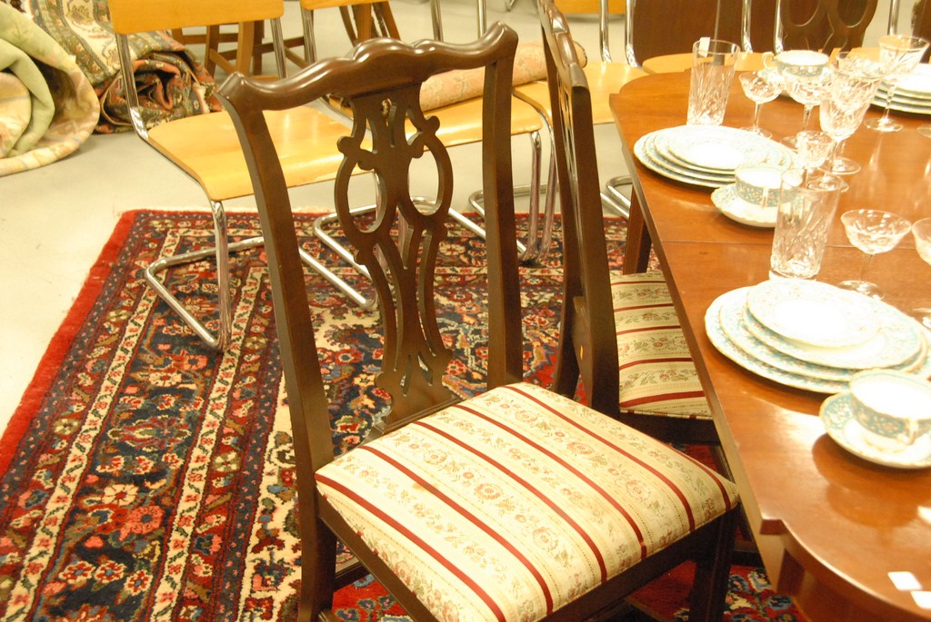 Lot 161: Set of eight mahogany Chippendale style dining chairs with fully upholstered seats by Ethan Allen.