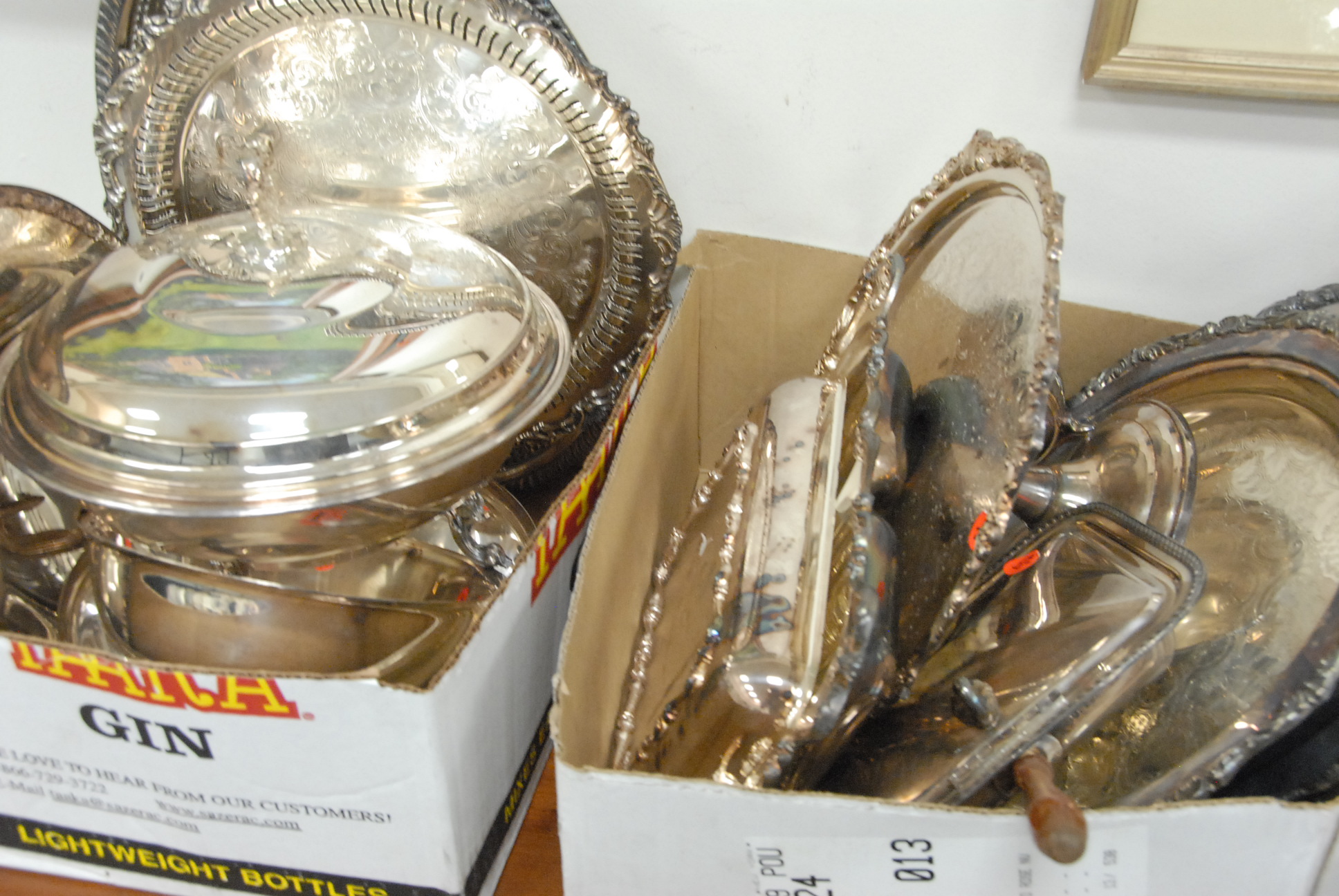 Three box lots of silver plate, bowls, trays, dishes, partial tea set, etc.