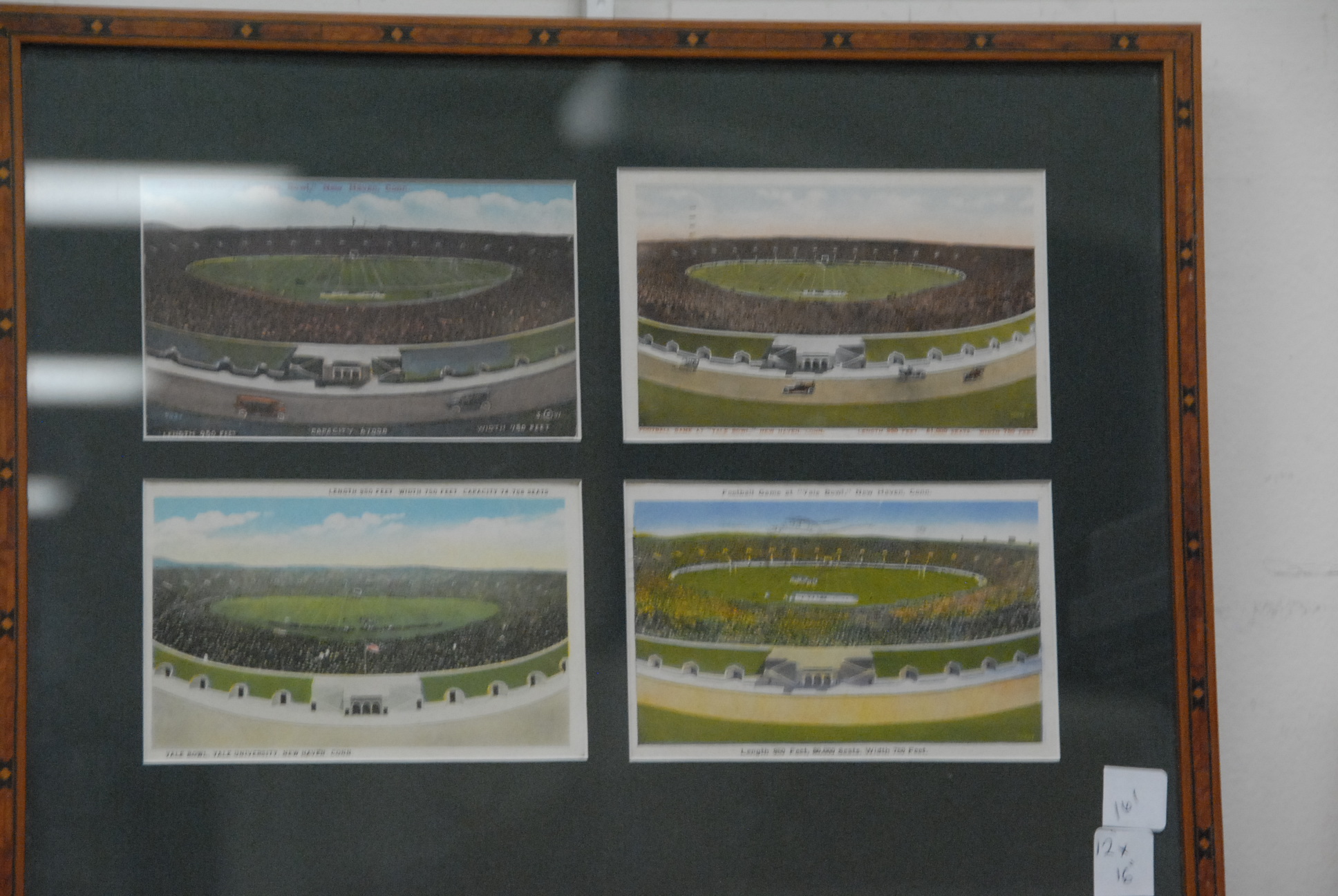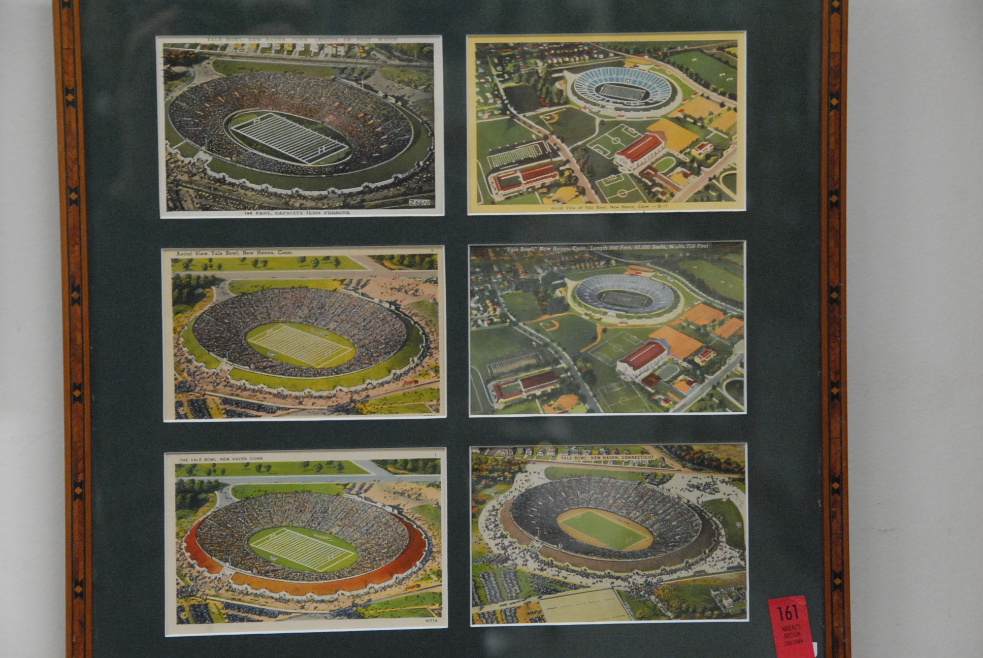 Lot 161: Two piece framed lot six linen and chrome postcards with aerial views of the Yale Bowl 1920-1950 and four color linen postcard view…