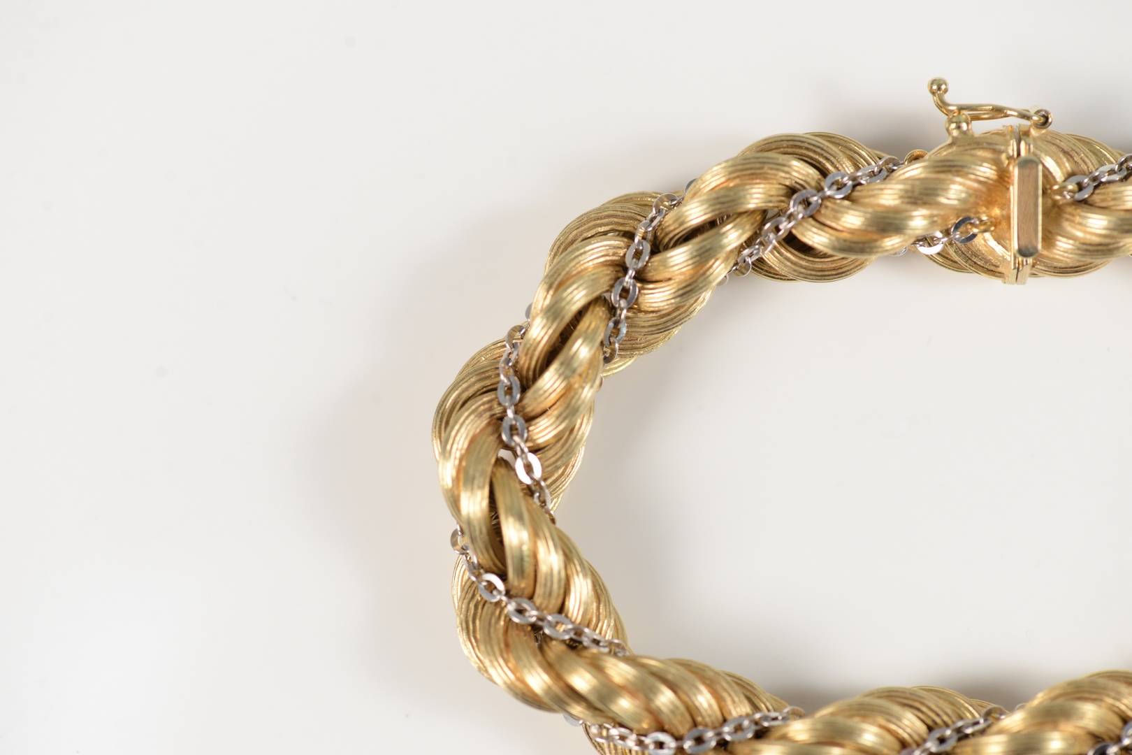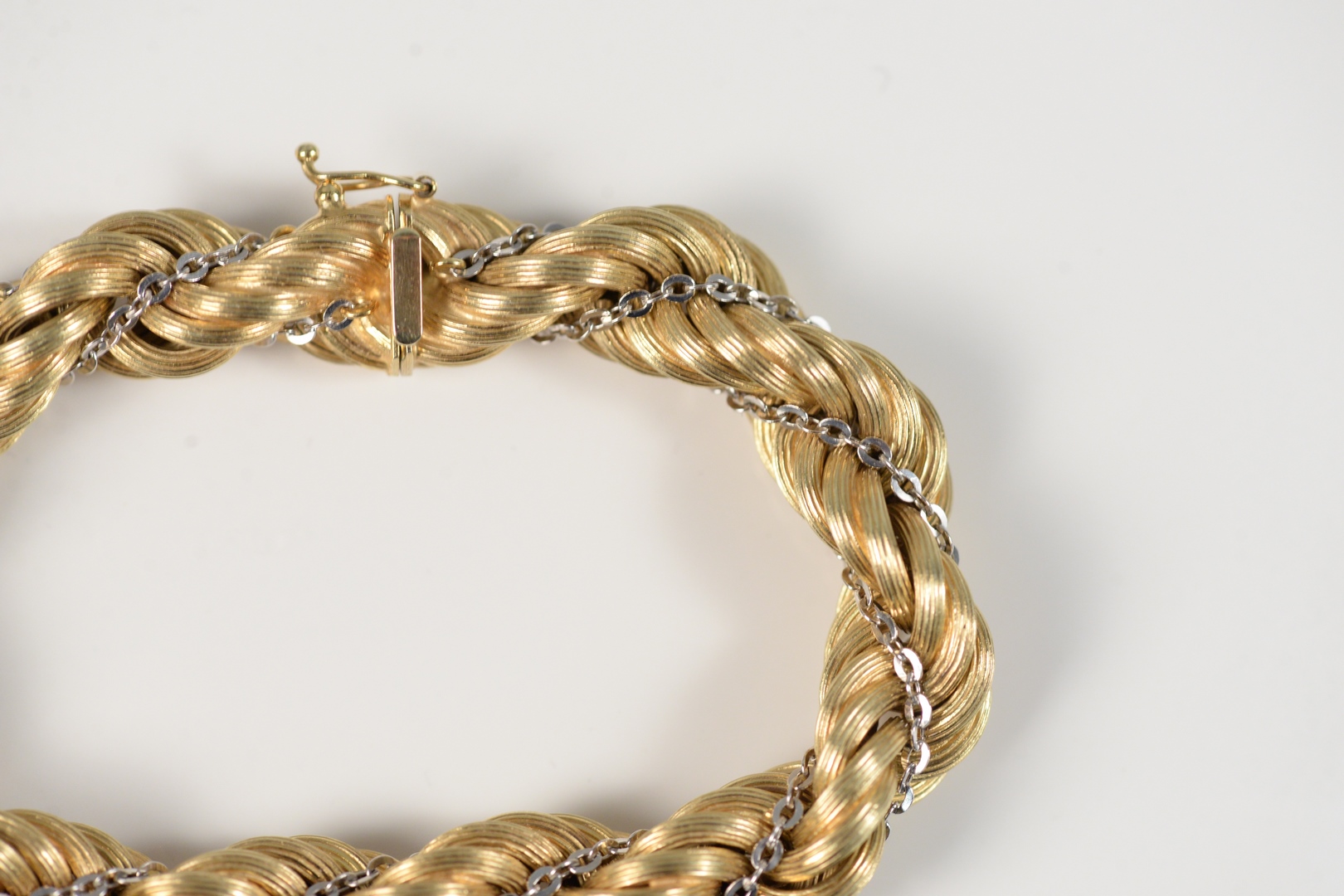 Lot 162: 14 Karat Gold Bracelet twist design, with small white gold chain woven in length 7 3/4 inches 32.6 grams