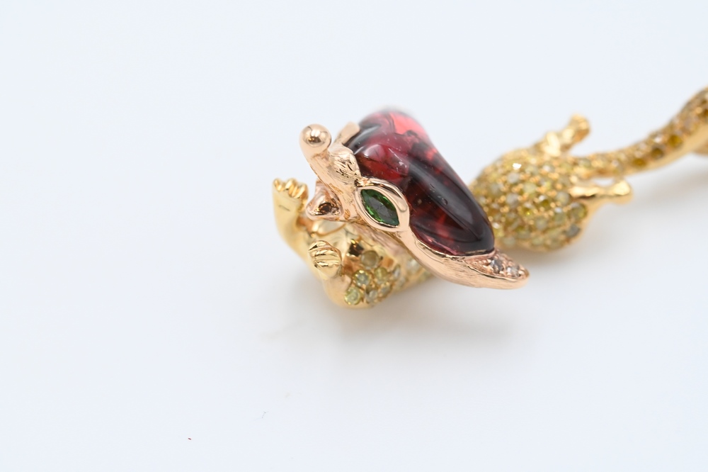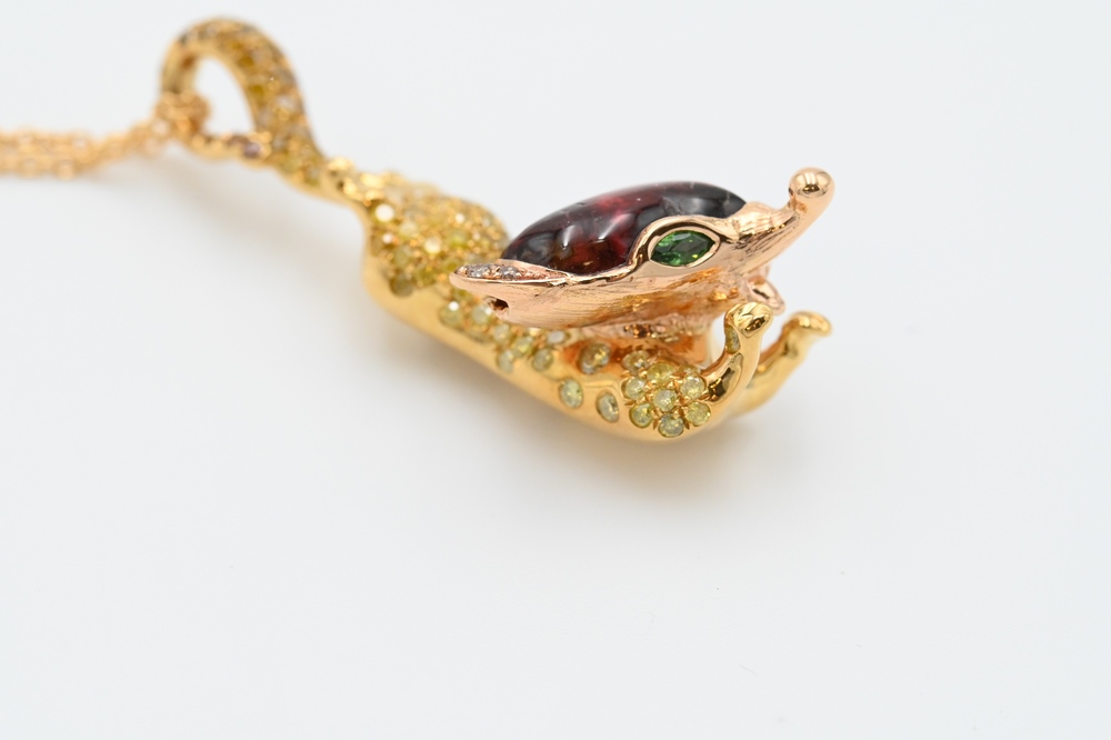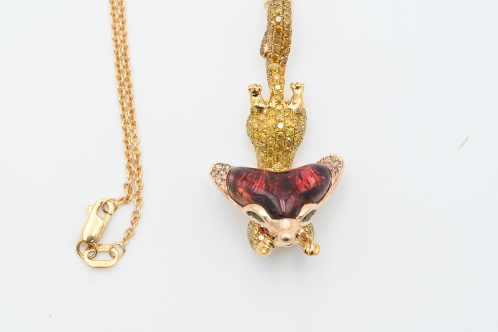 18 Karat Yellow Gold Fox Pendant, set with large amber stone and diamonds on a 18 karat gold chain, 15 grams total weight.